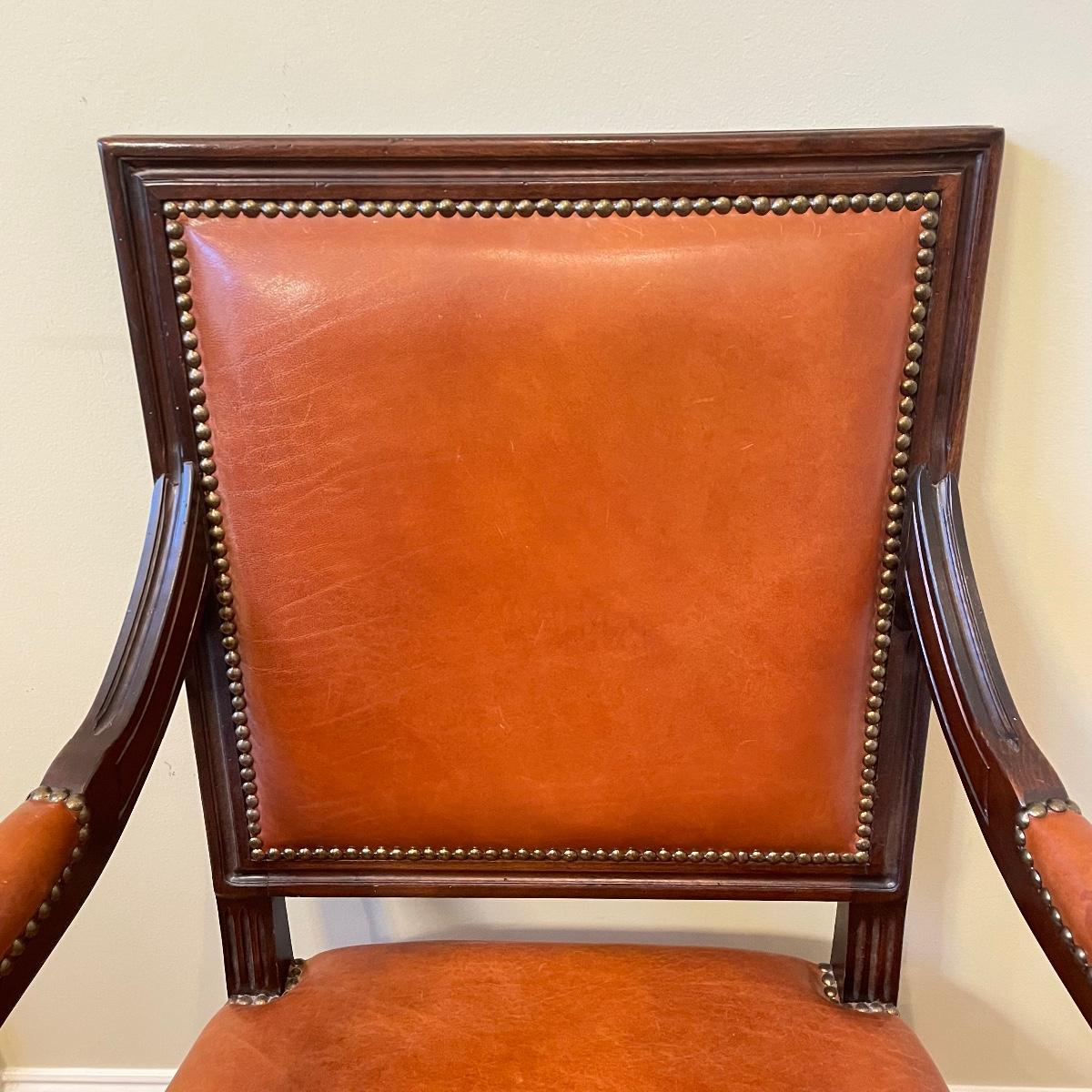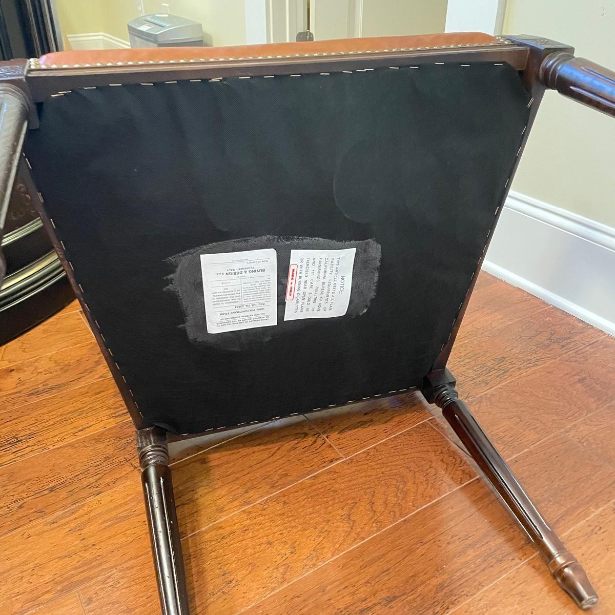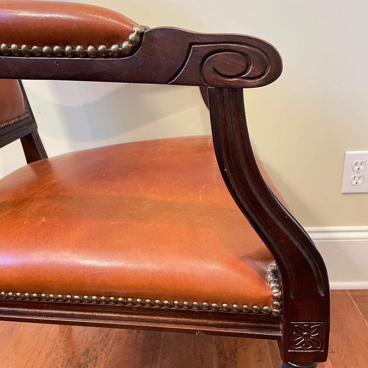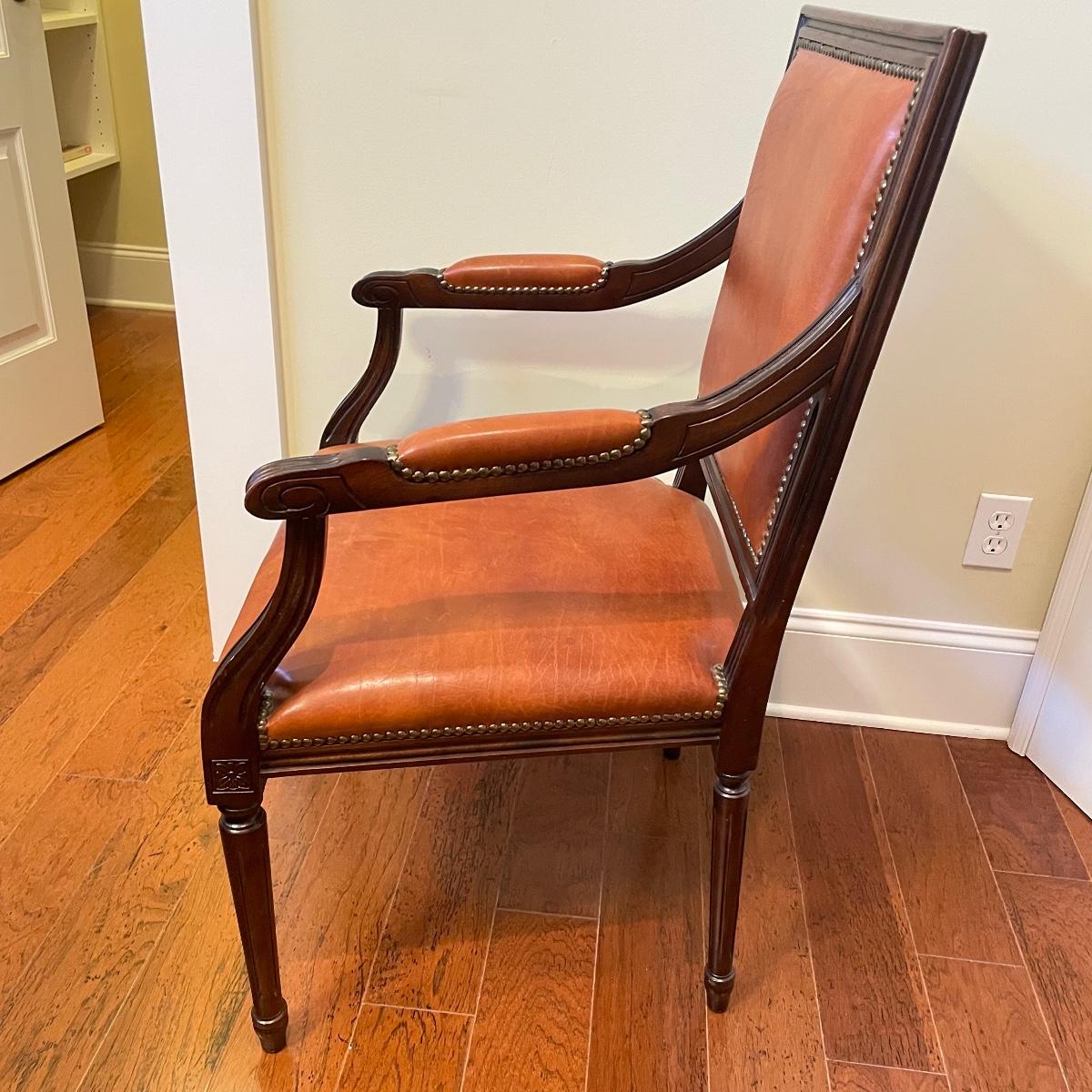 Nicely carved wooden arm chair with leather and suede. The upper back of the seat is suede with orange toned leather seat, back and arms. Chair measures 25” x 23” x 39” with a seat height at 20”. Local pick up only.