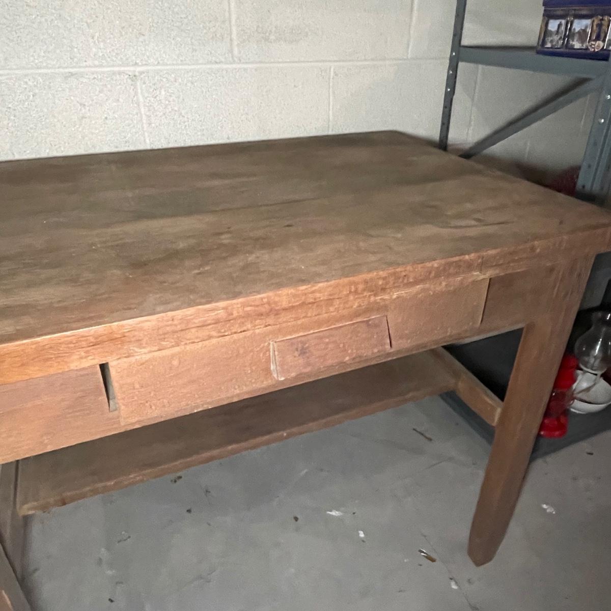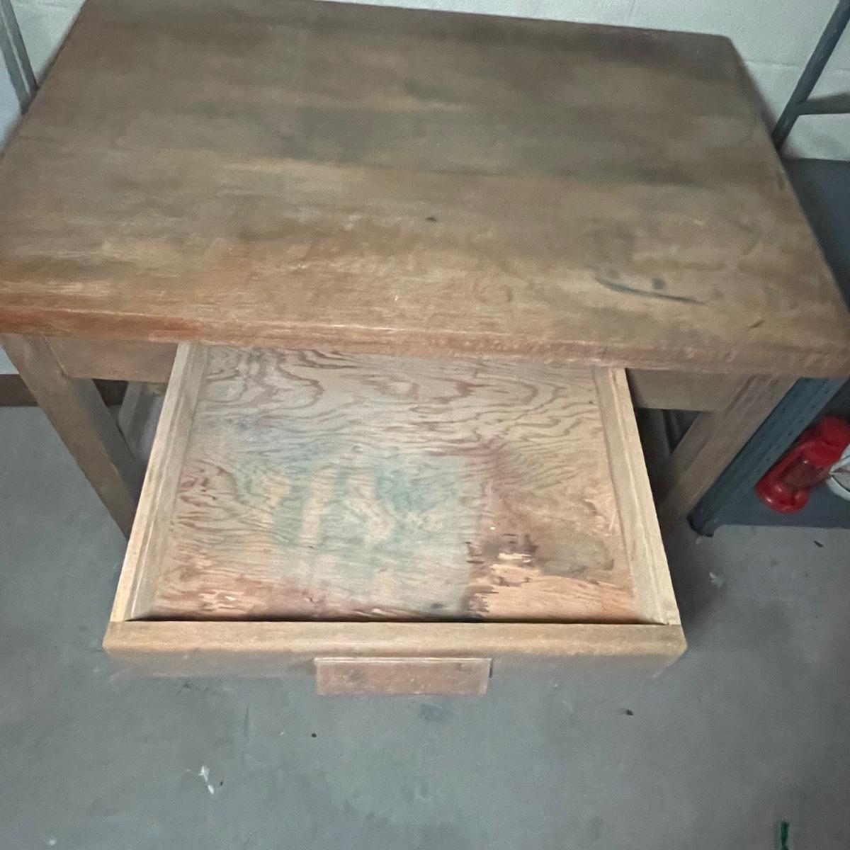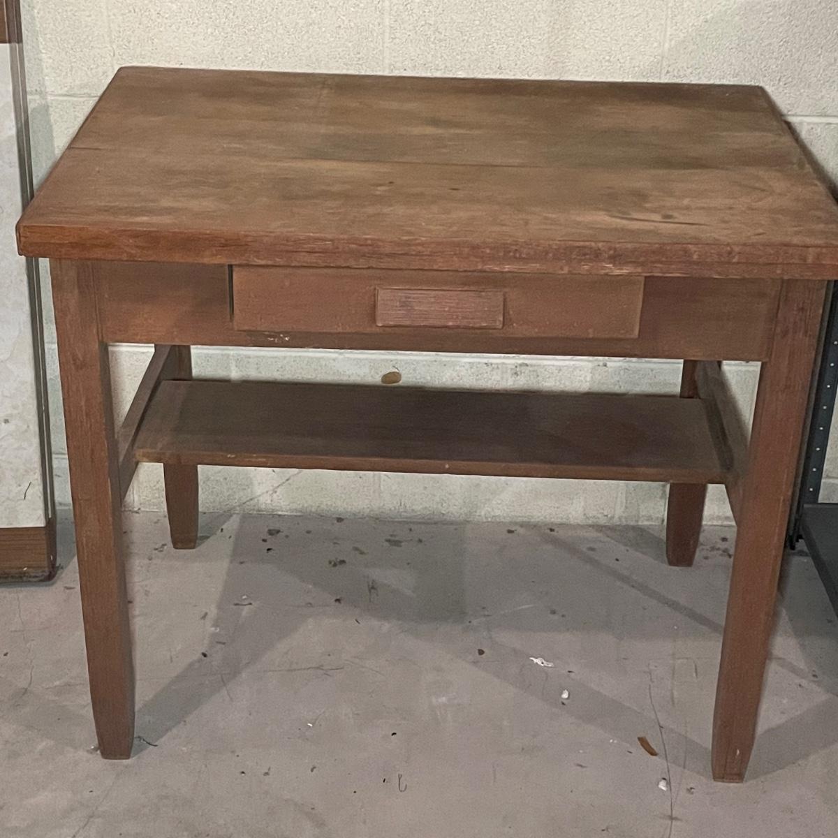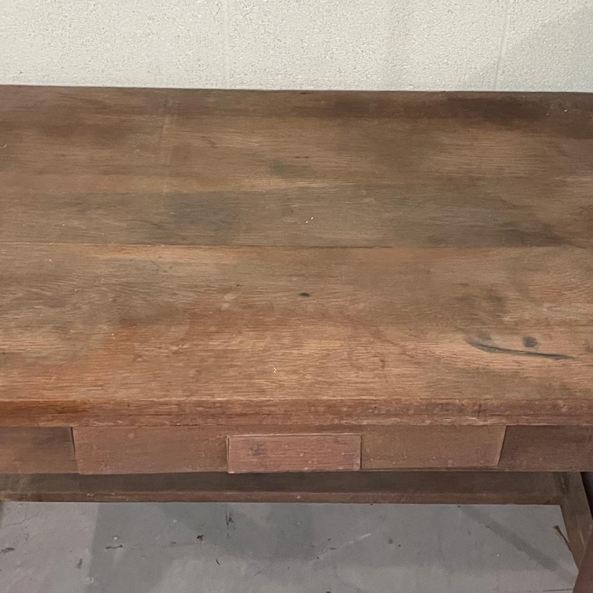 This solid wood table is sturdy as well as attractive. It has one dovetailed drawer. It appears to be untreated wood with no finish and has a few light stains in the wood. The surface is splitting at its seam slightly, see images.