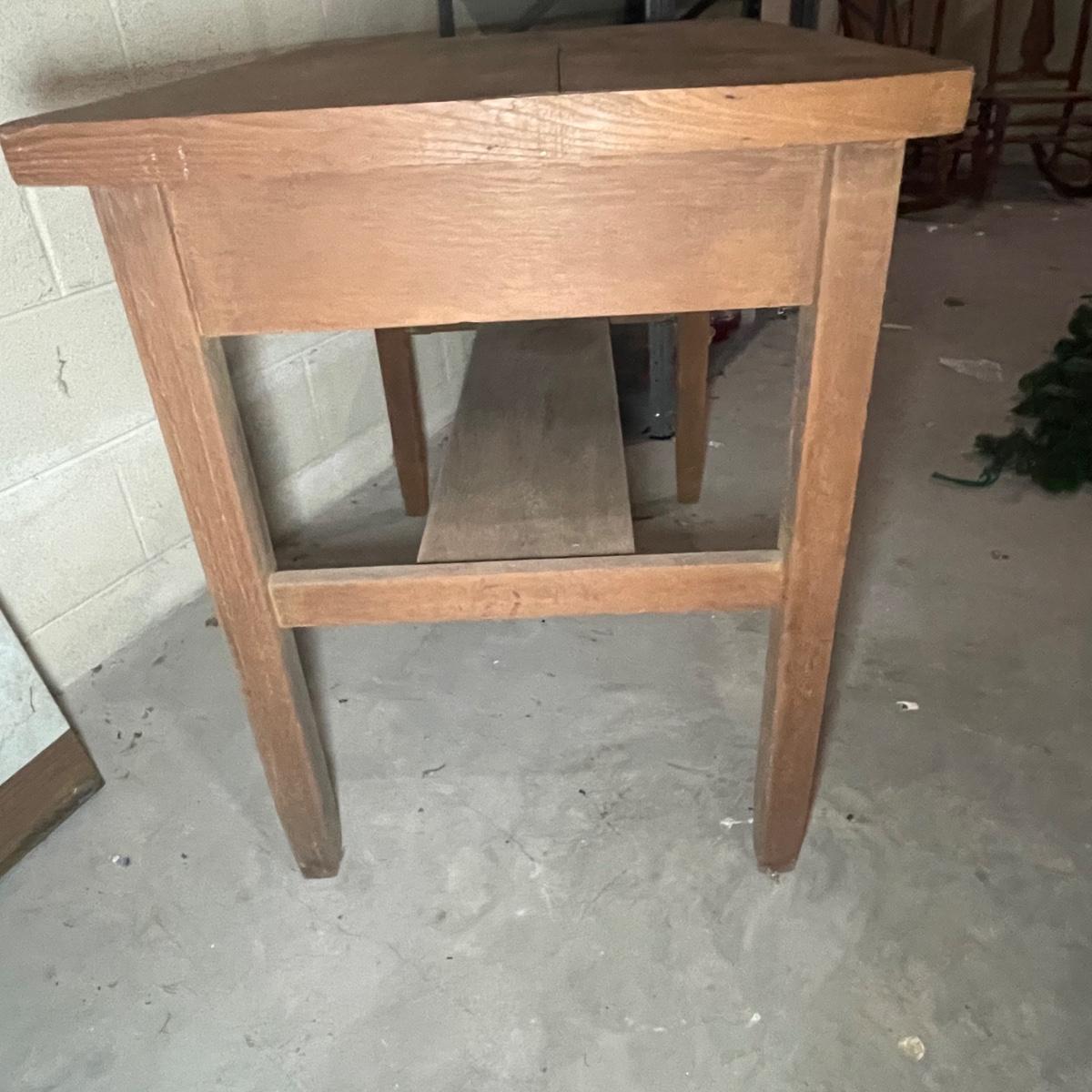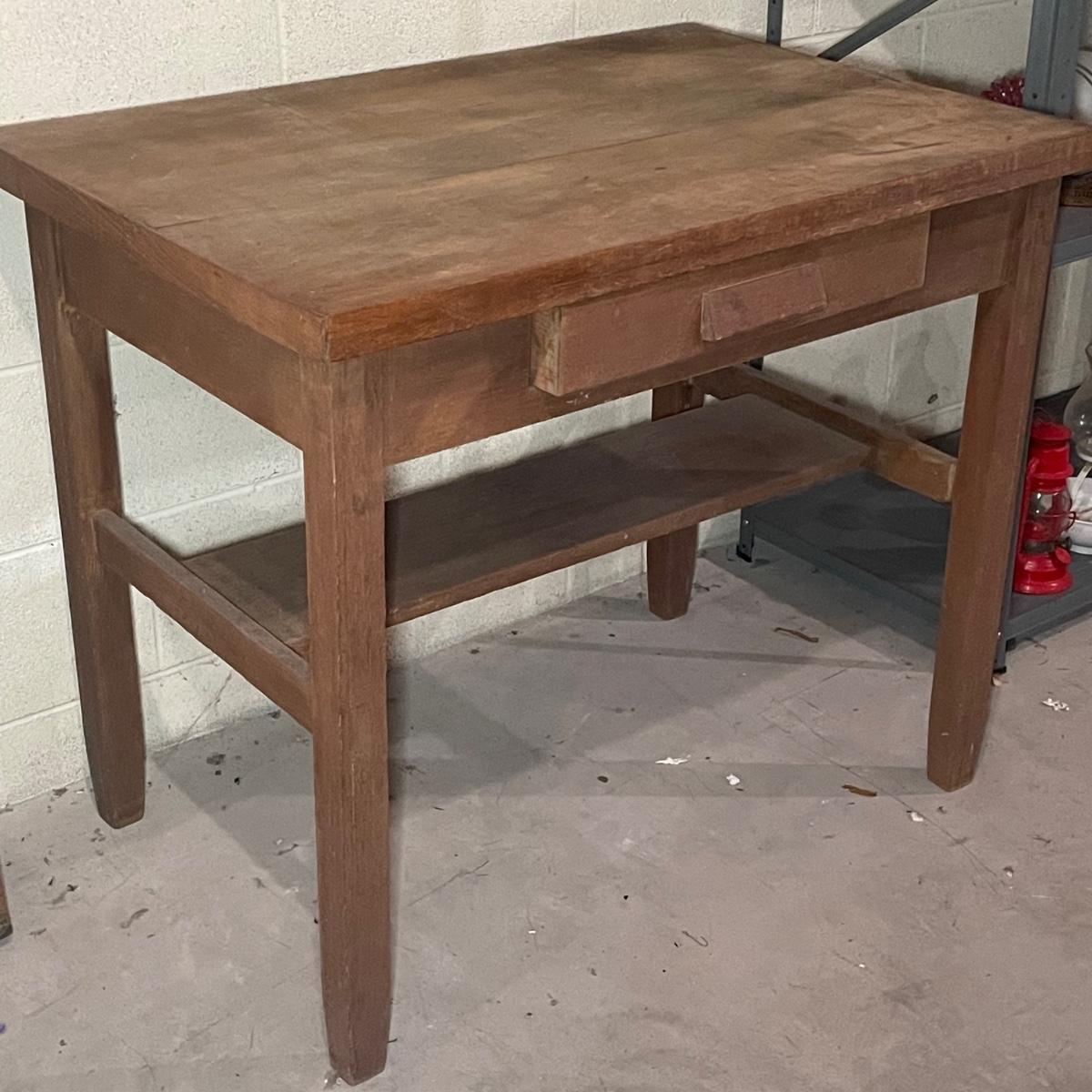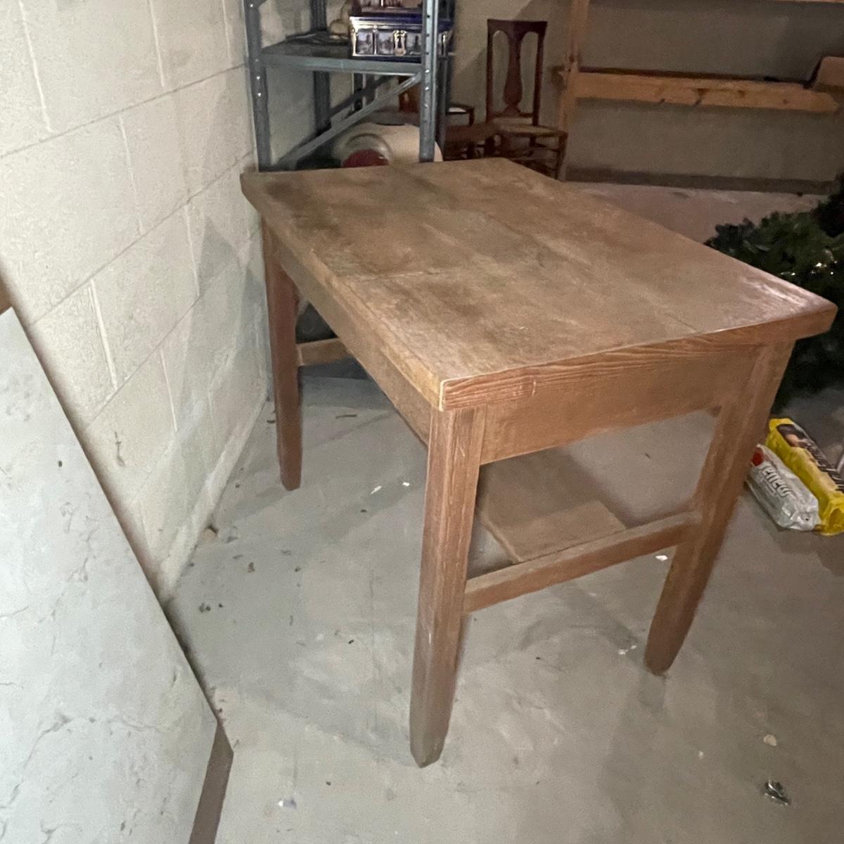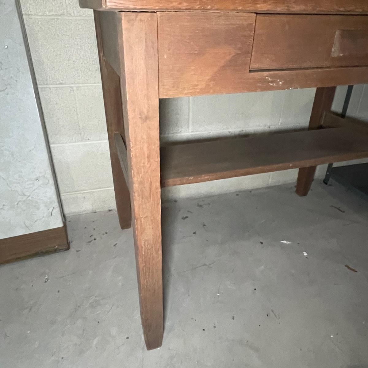 This solid wood table is sturdy as well as attractive. It has one dovetailed drawer. It appears to be untreated wood with no finish and has a few light stains in the wood. The surface is splitting at its seam slightly, see images.