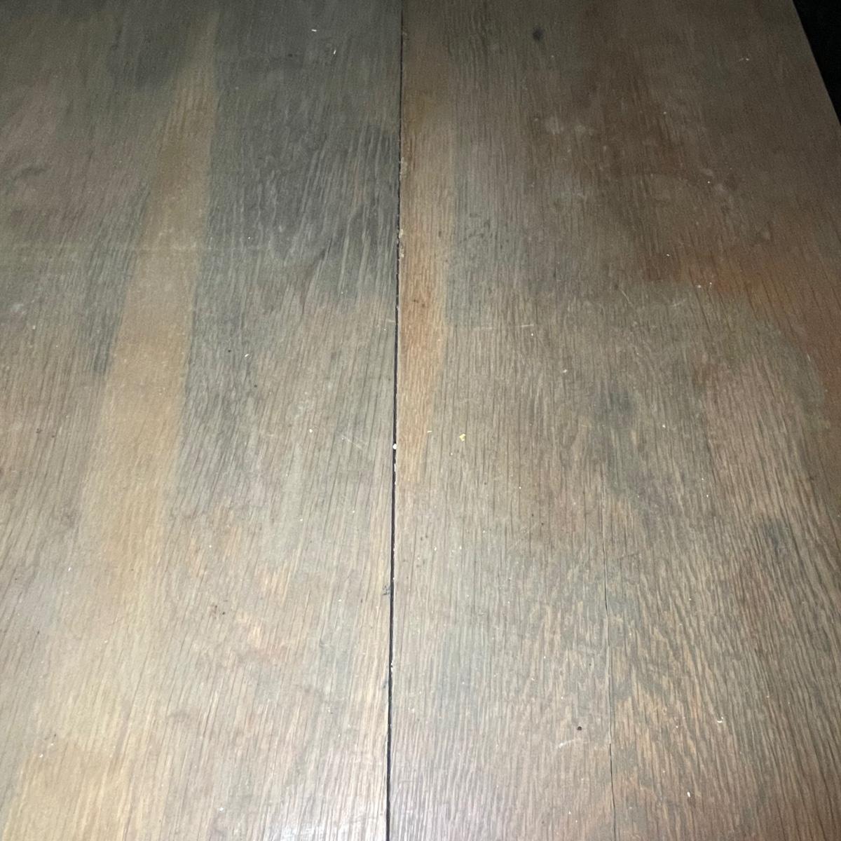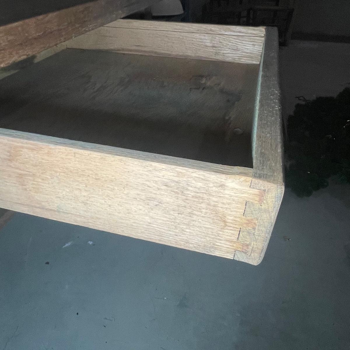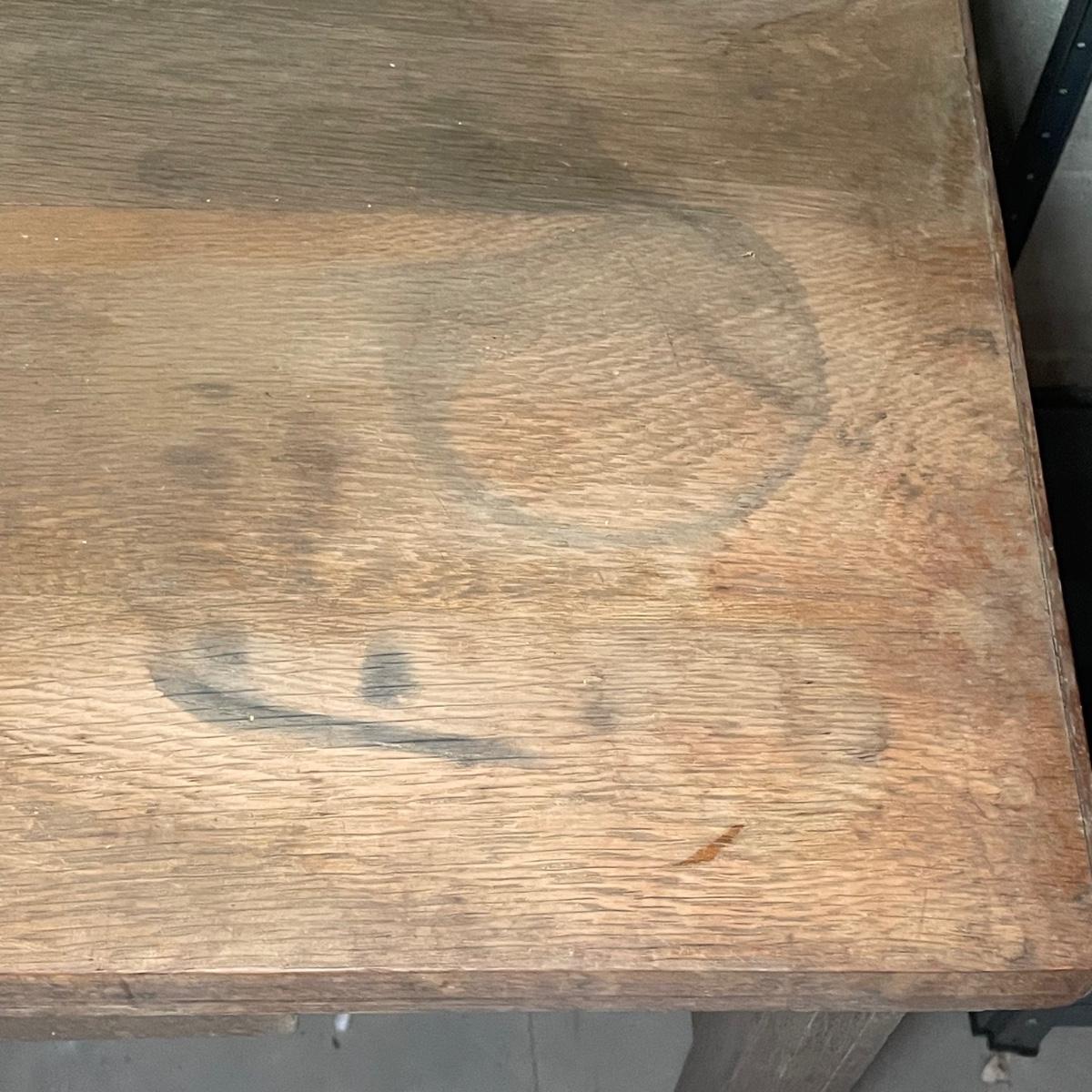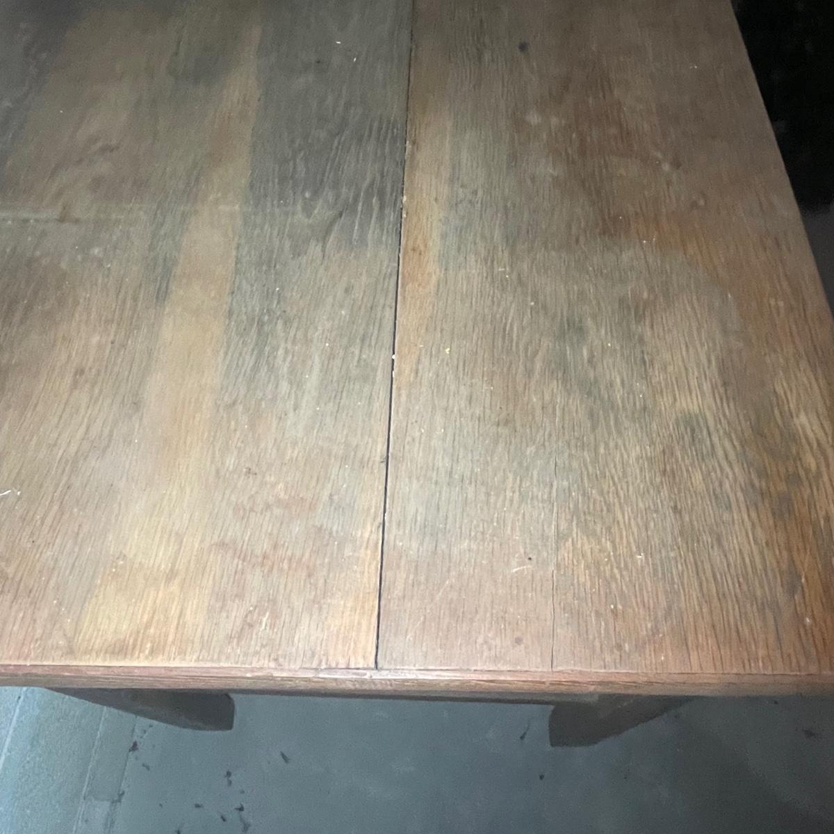 This solid wood table is sturdy as well as attractive. It has one dovetailed drawer. It appears to be untreated wood with no finish and has a few light stains in the wood. The surface is splitting at its seam slightly, see images.