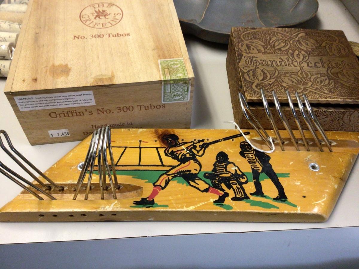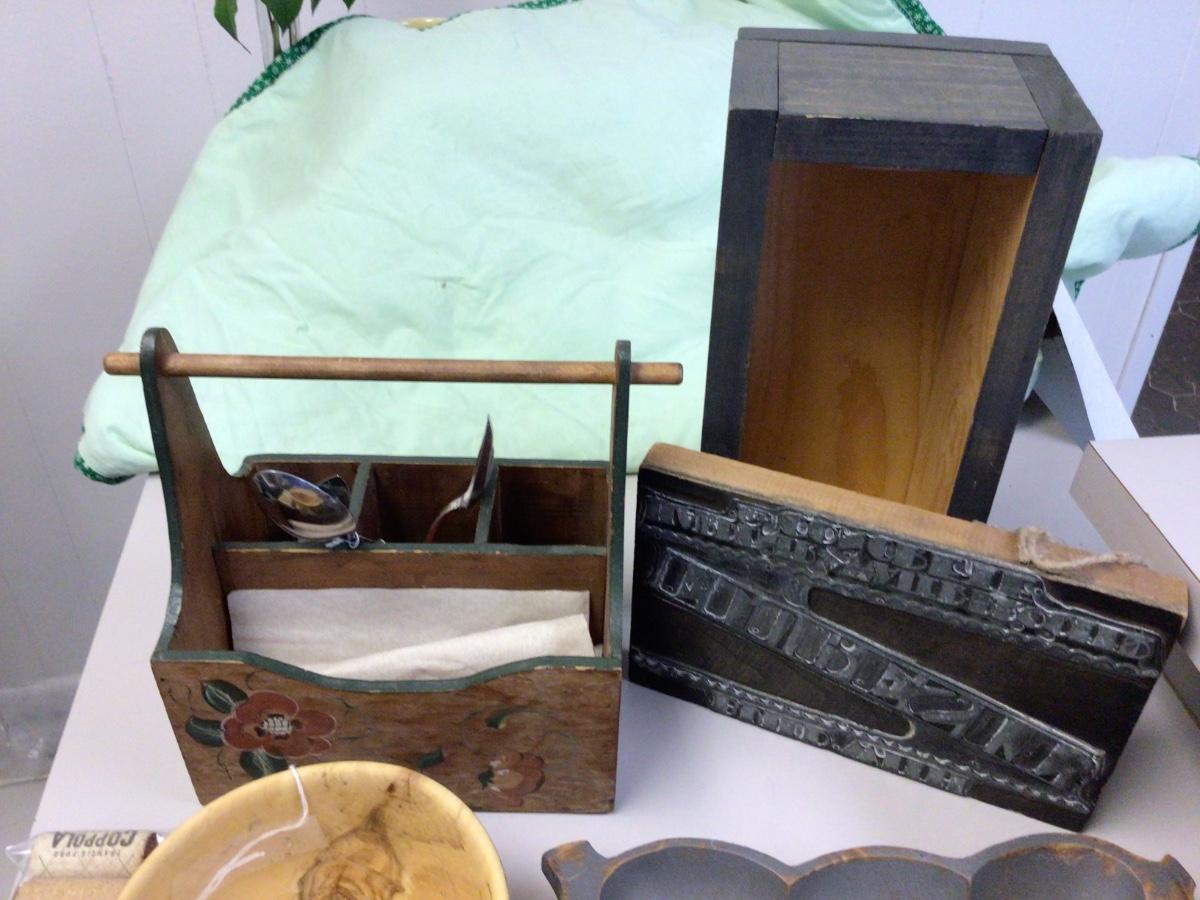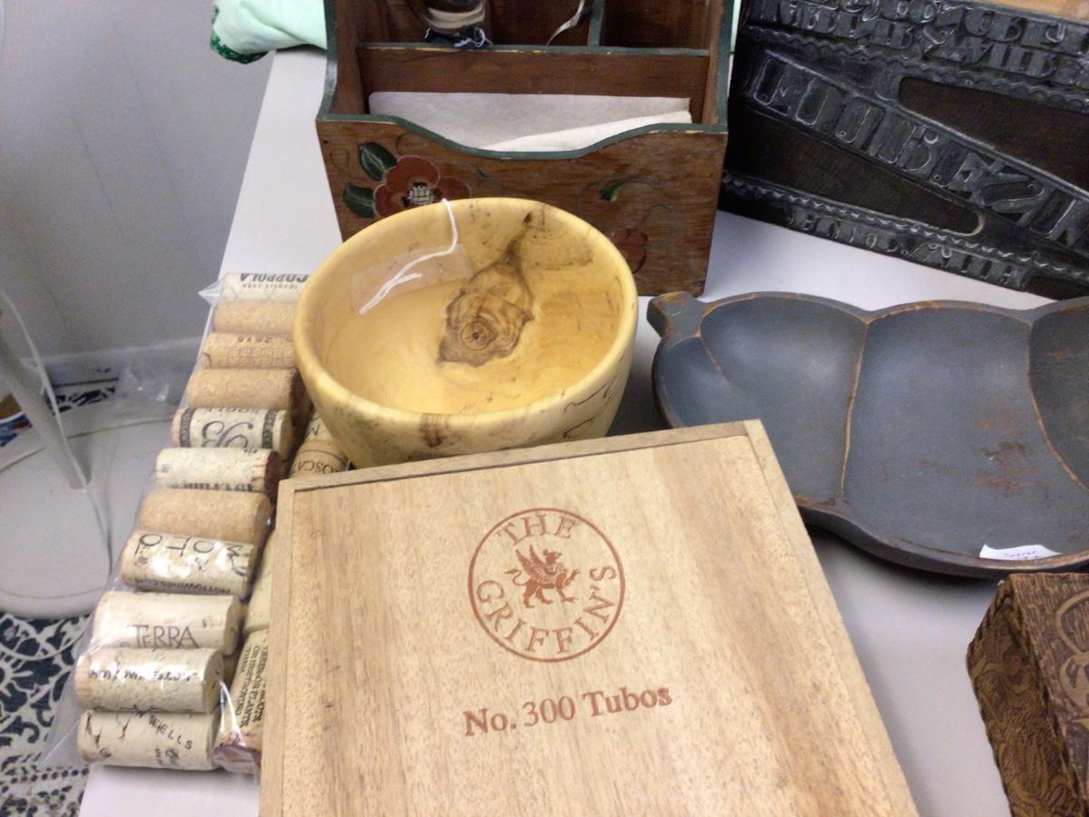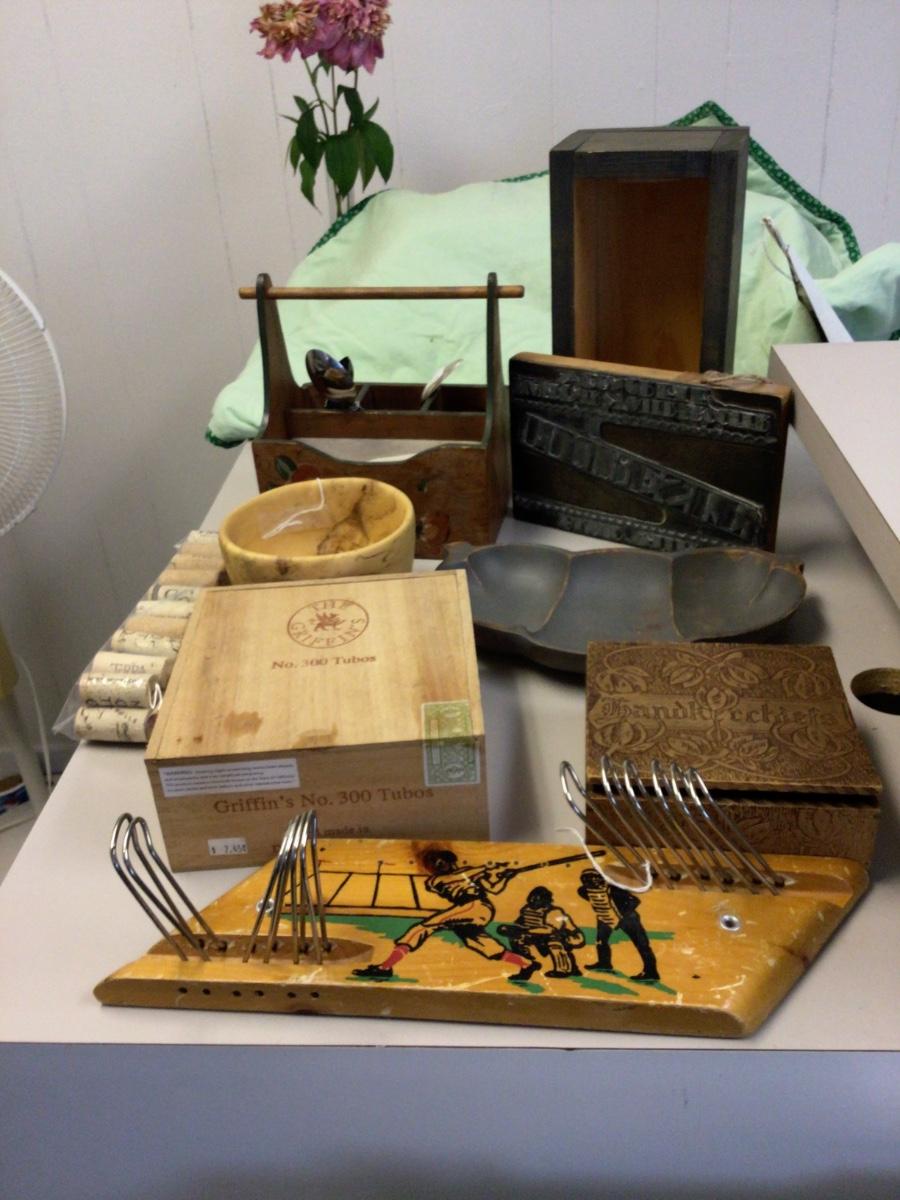 You get blue wood open box, kitchen utensil holder, wood bowl, wood tray, handkerchief box, cigar box, tie/belt rack, corks, and a press stamp.