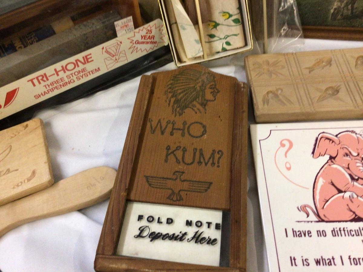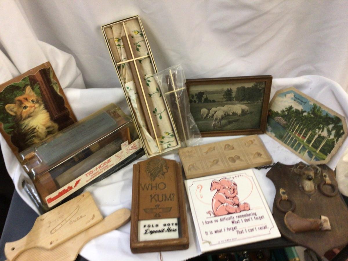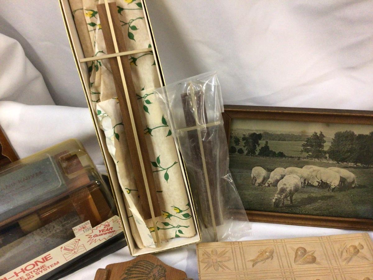 You get wood and metal crosses, sheep pictures in wood frame, wood candy mold, wood deer plaque, wood who kum, advertising, wood scoop, wood kitty pictur, and wood and stone knife sharpener.