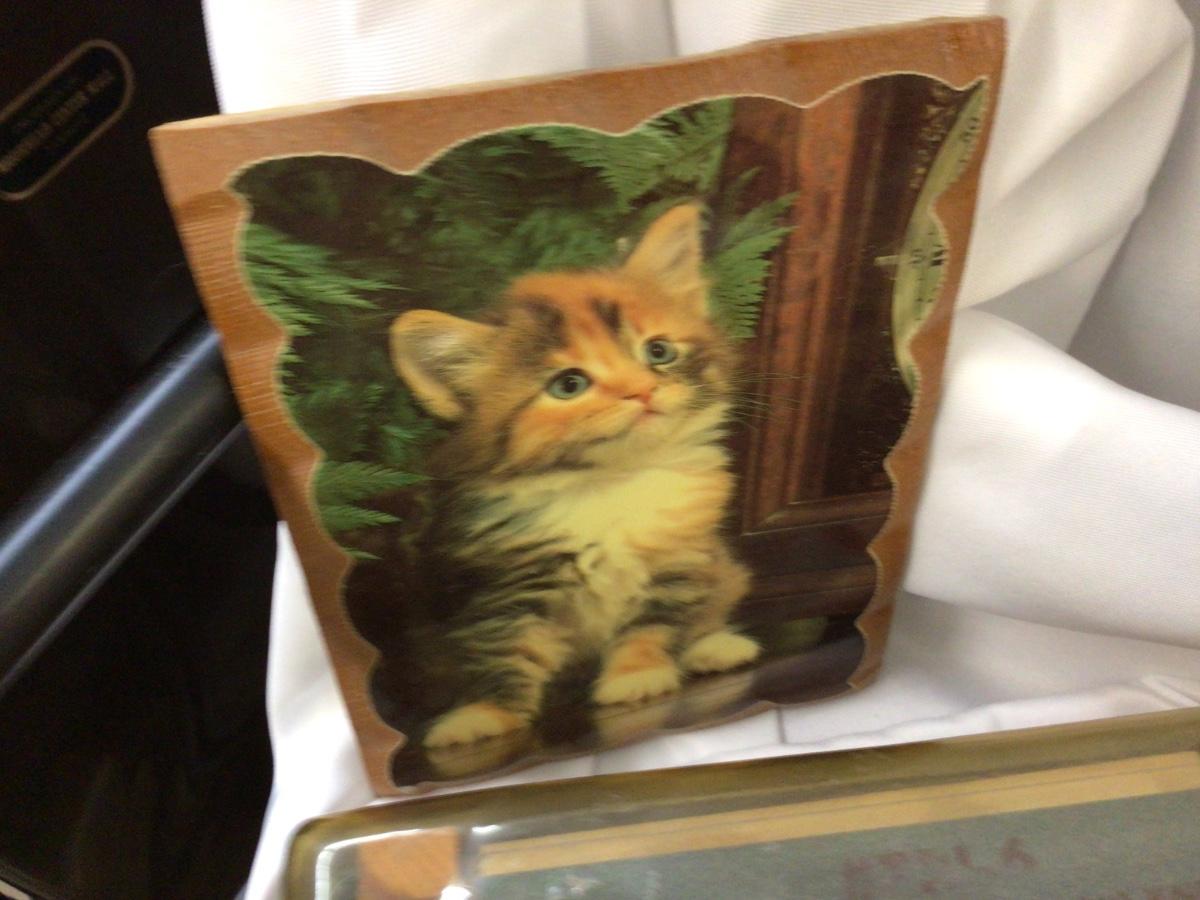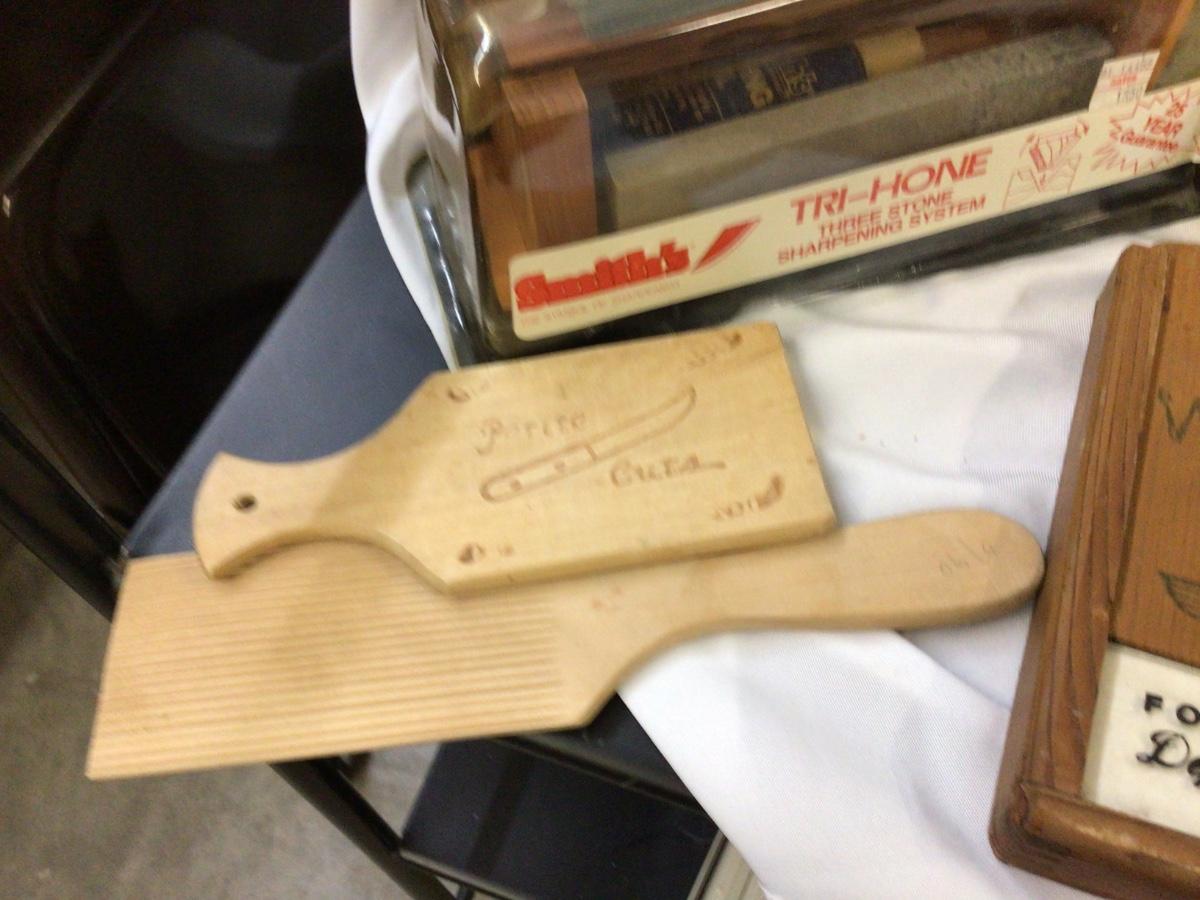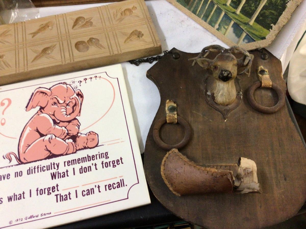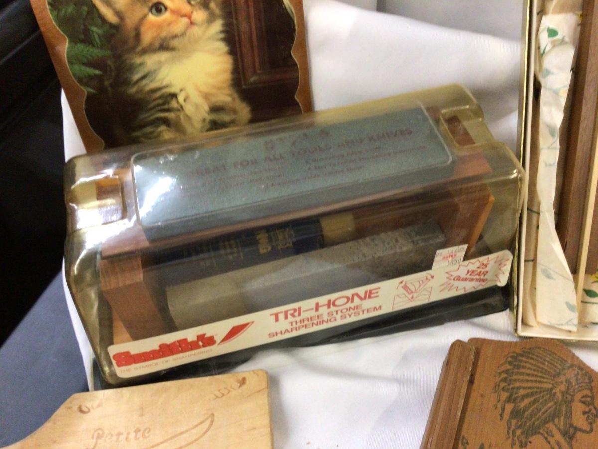 You get wood and metal crosses, sheep pictures in wood frame, wood candy mold, wood deer plaque, wood who kum, advertising, wood scoop, wood kitty pictur, and wood and stone knife sharpener.