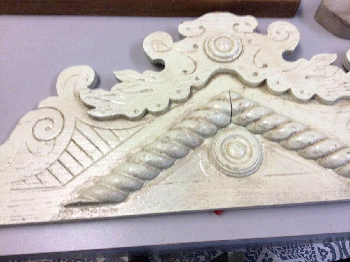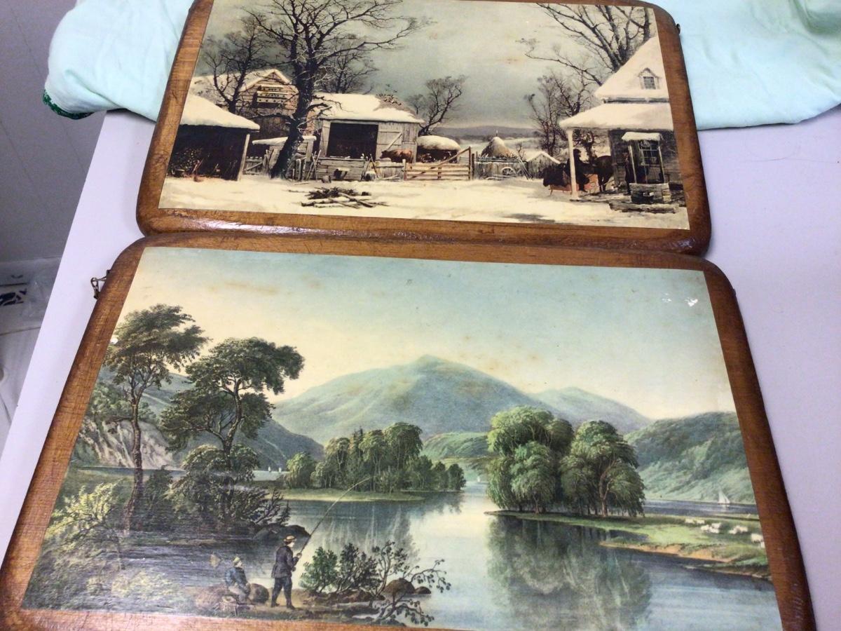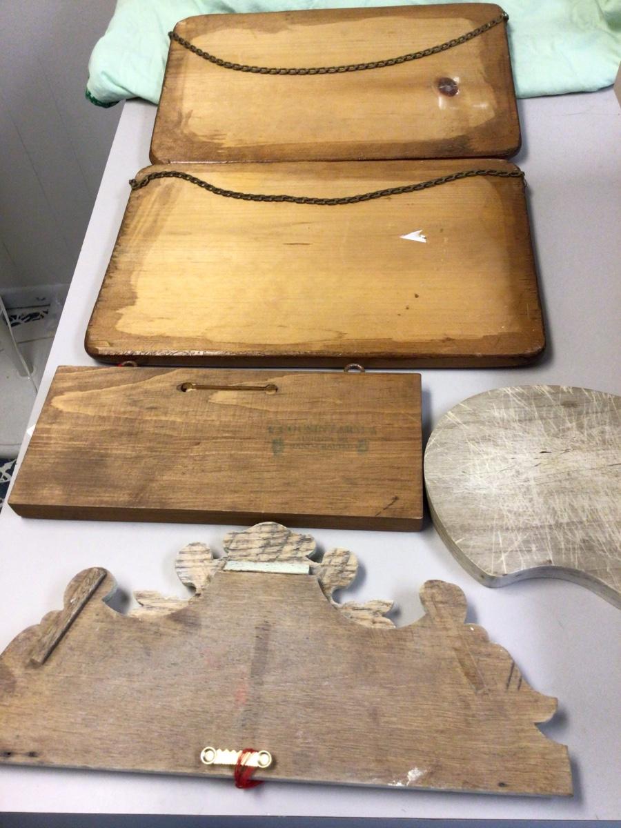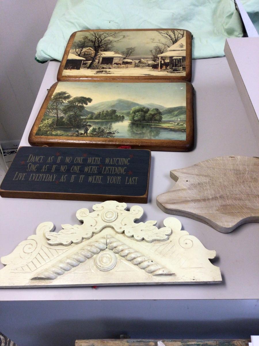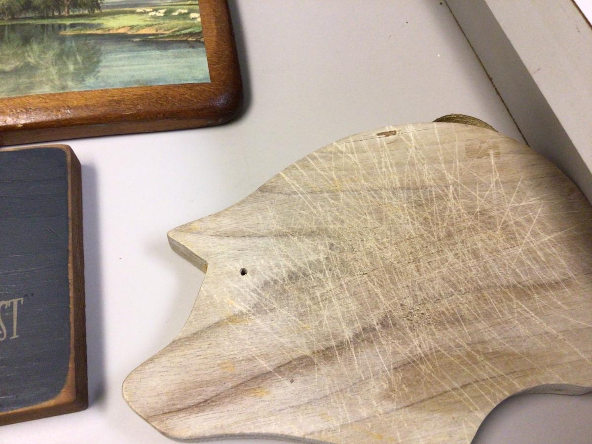 You get two vintage print on wood summer and winter scenes, nice sign, pig cutting board, wood architecture piece.