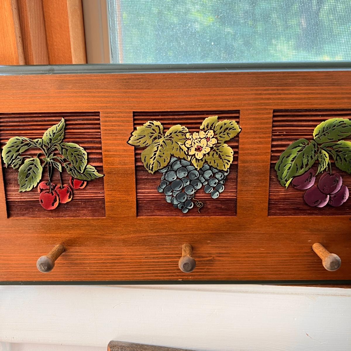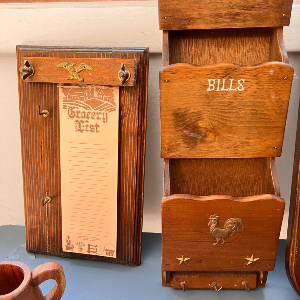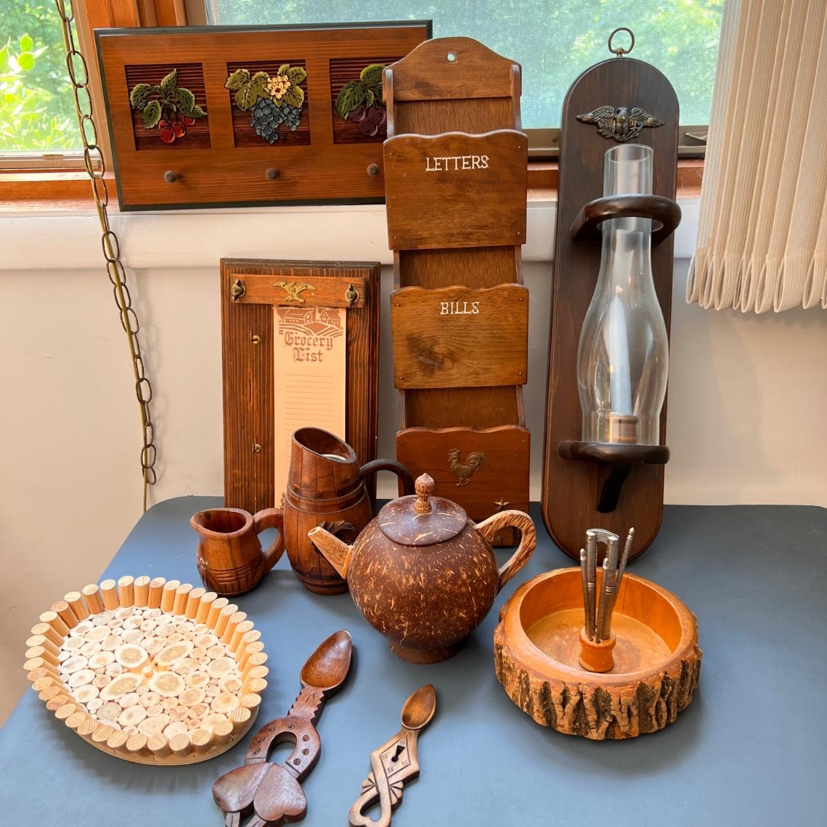 Carved hook by Blue Moon Woodcarving, hurricane lamp, wall mount mail organizer, MCM live wood edge nut cracker set, natural coconut shell tea pot, stein and pitcher, bowl, wall art