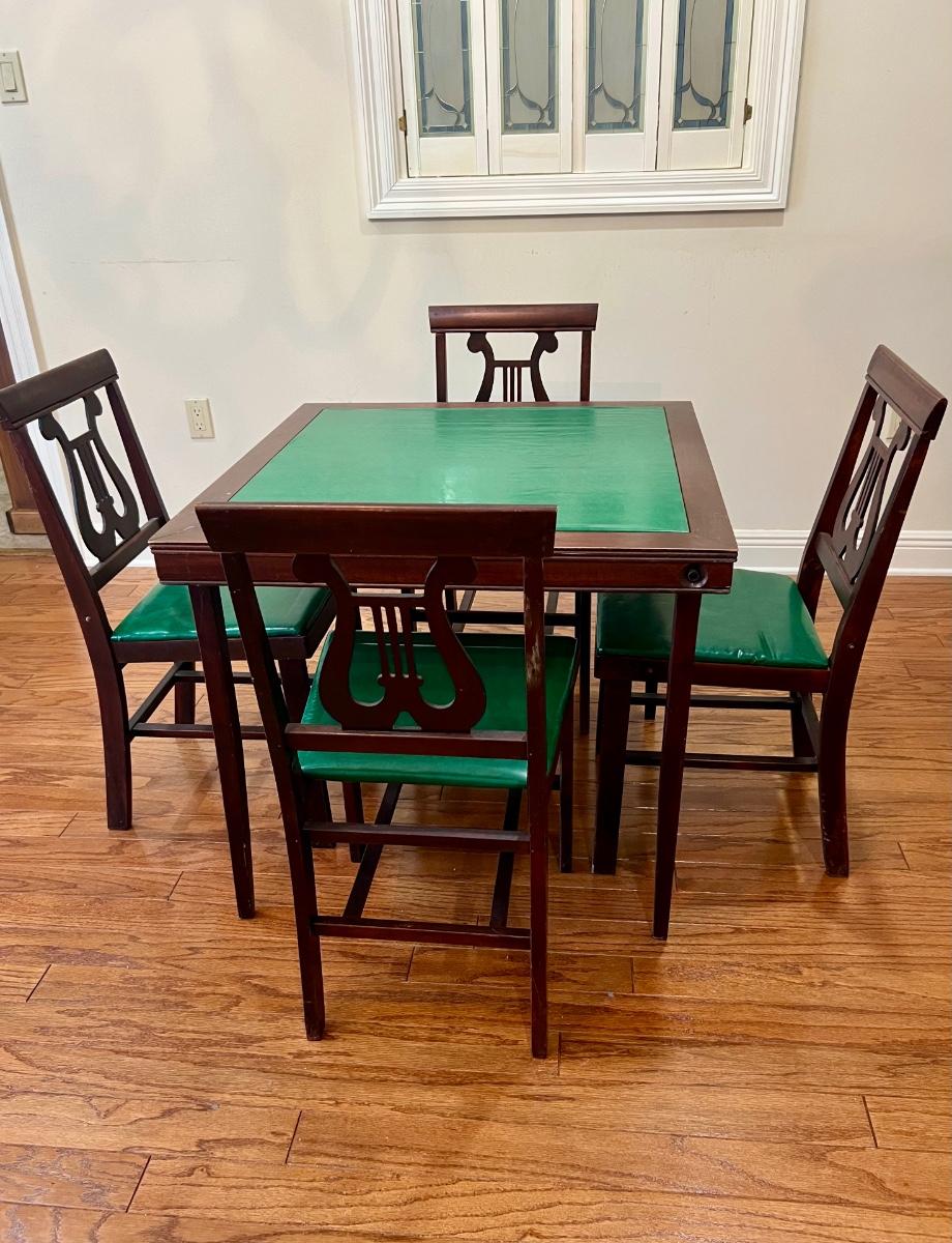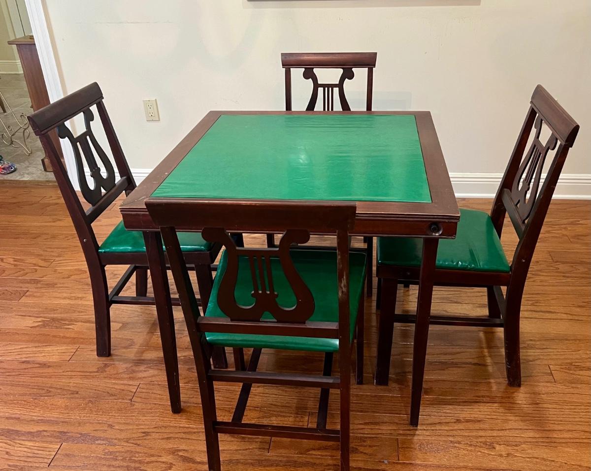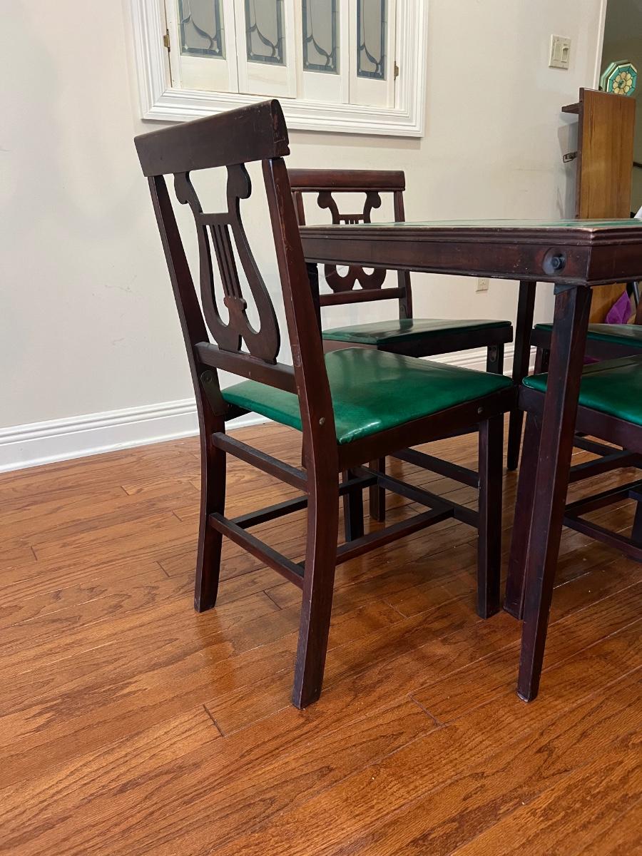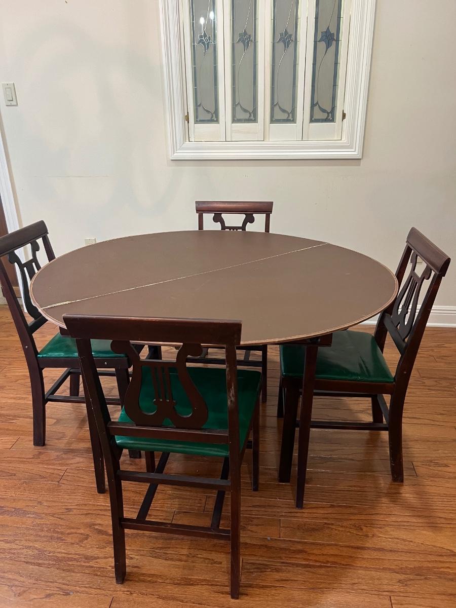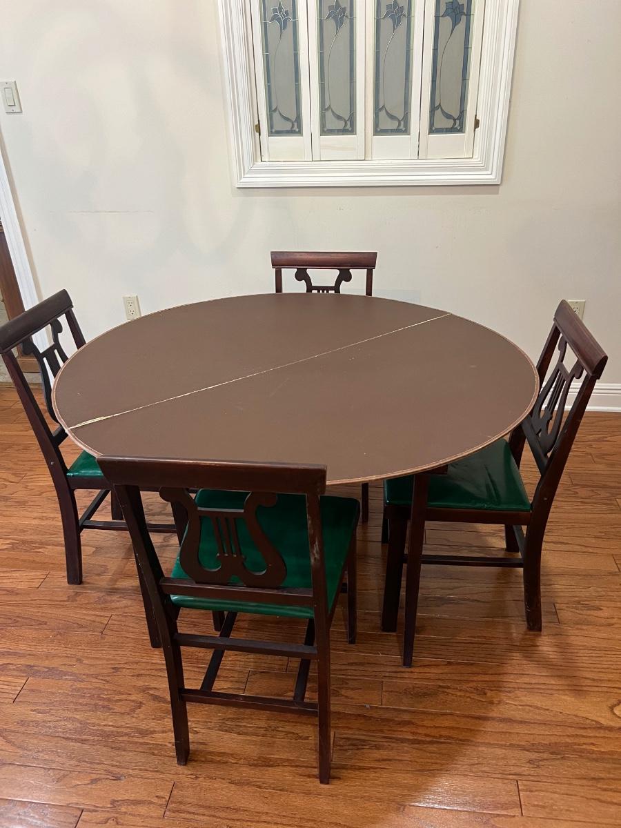 Set 4 Wooden Folding Chairs. This also comes with a round table topper to turn this table into a card/game table. Has two very small marks on it (looks like marker) see picture.