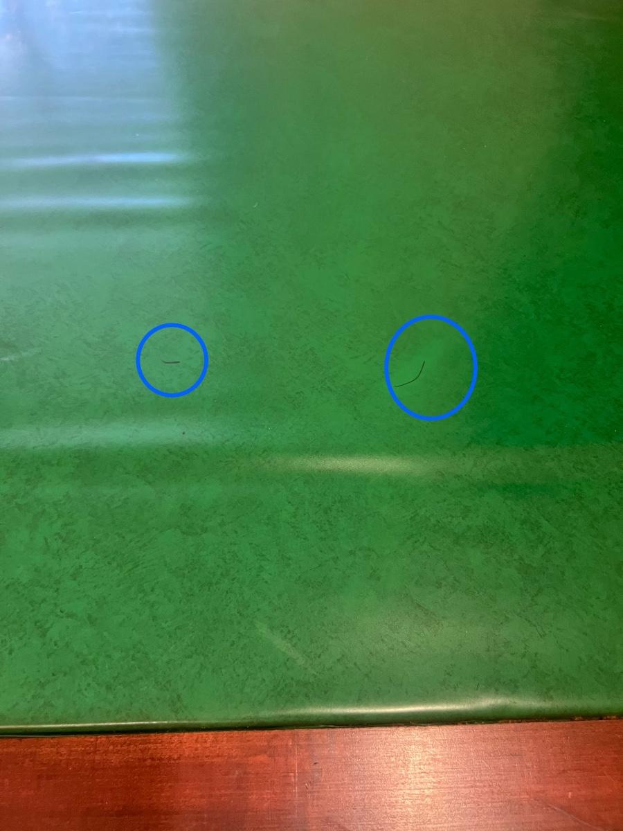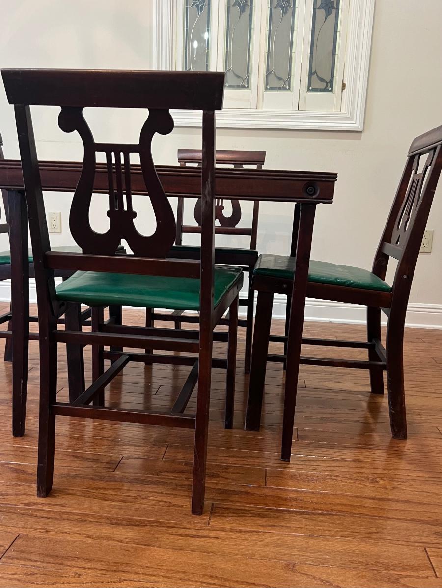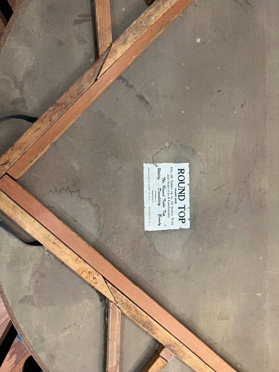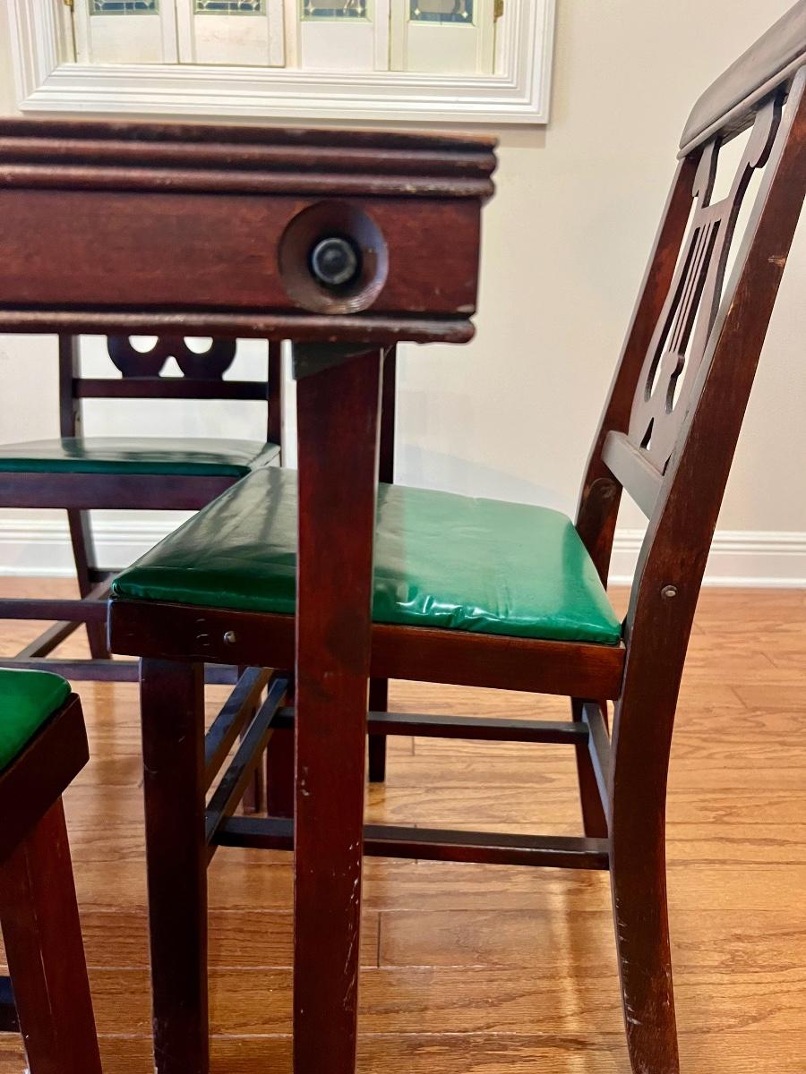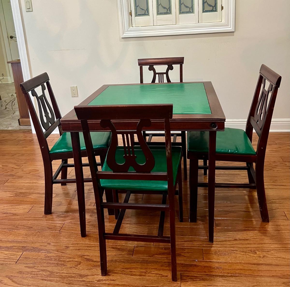 Set 4 Wooden Folding Chairs. This also comes with a round table topper to turn this table into a card/game table. Has two very small marks on it (looks like marker) see picture.