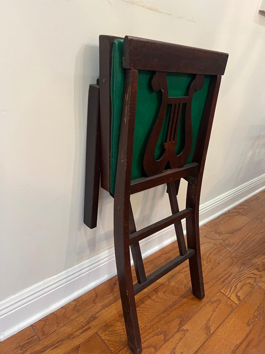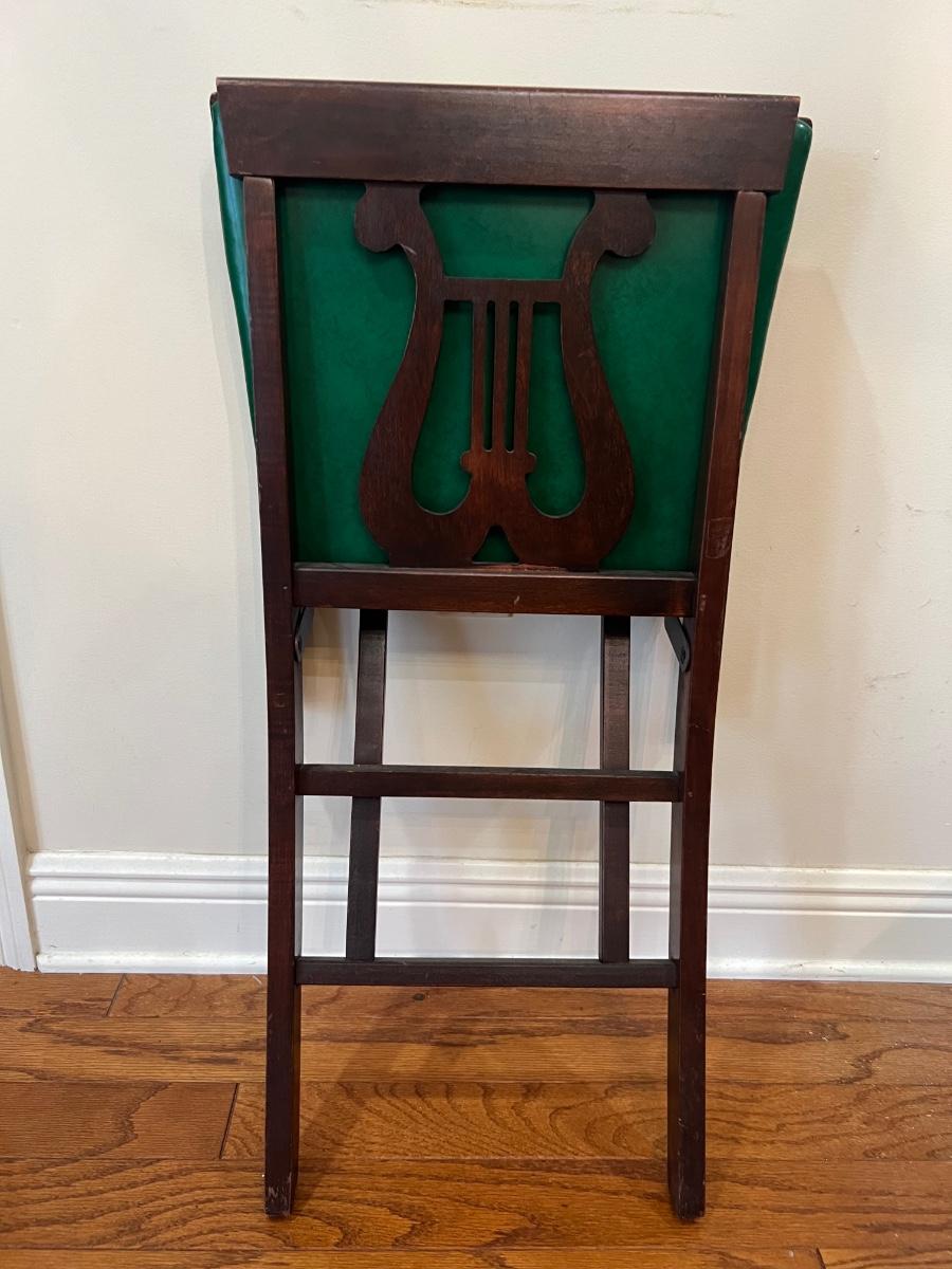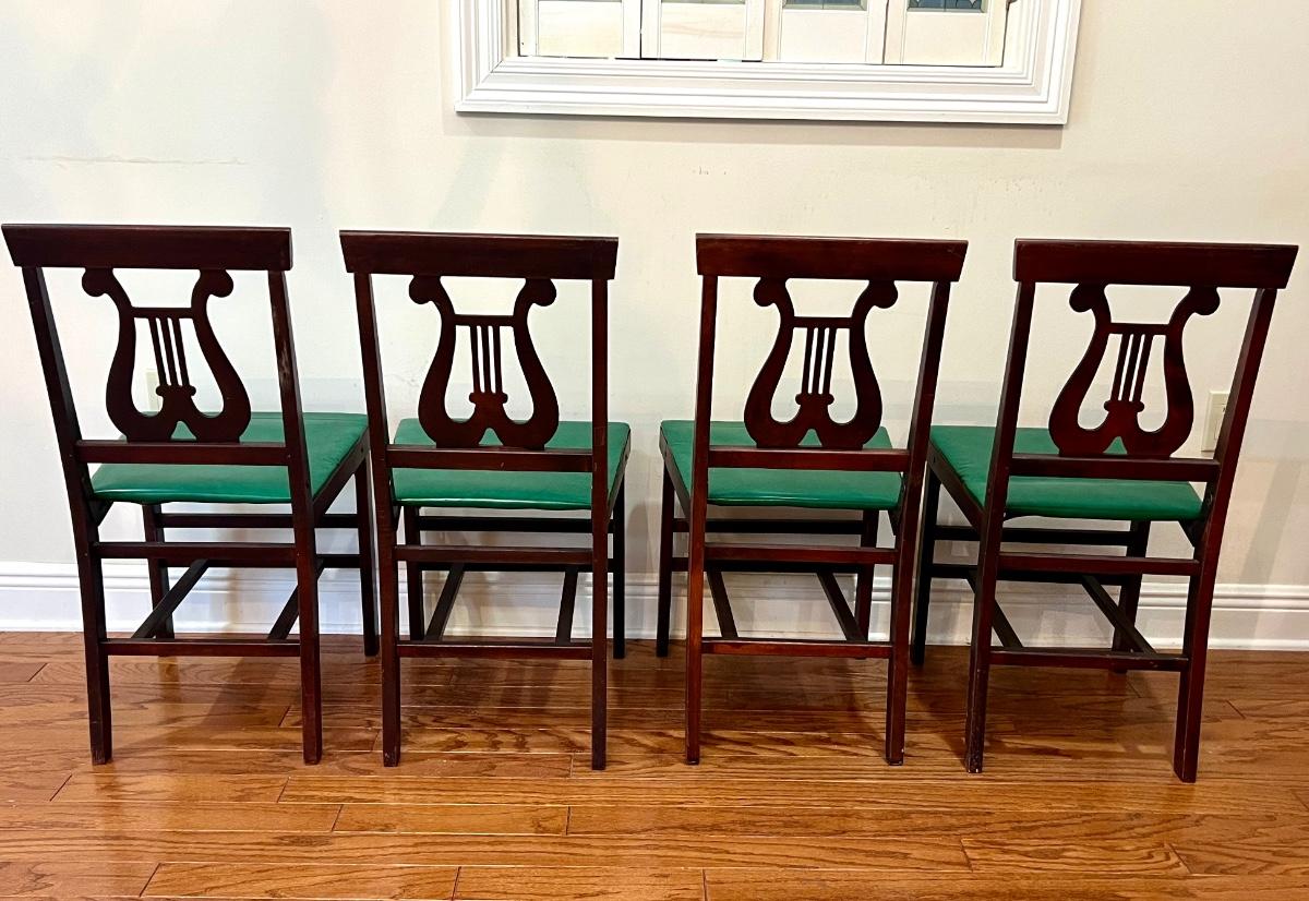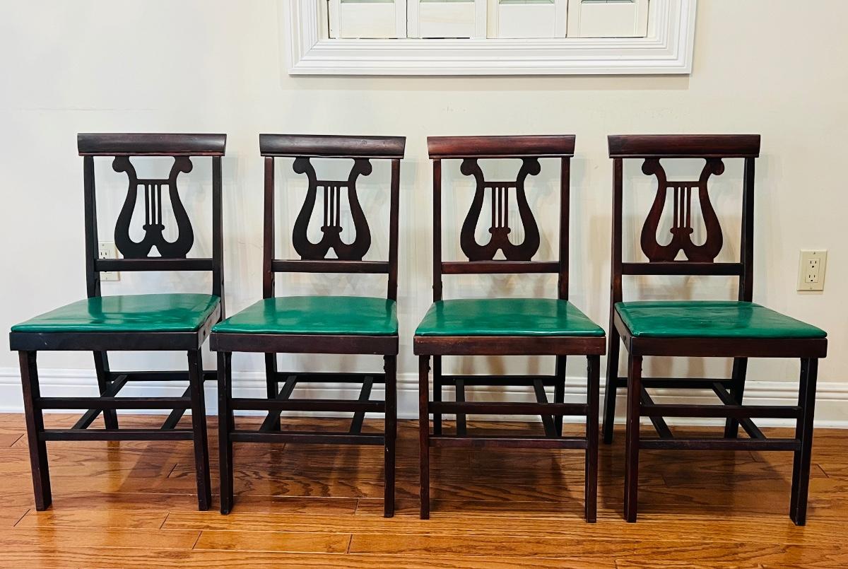 Wood Lyre Harp Table and 4 Folding Chairs With Round Table Topper
