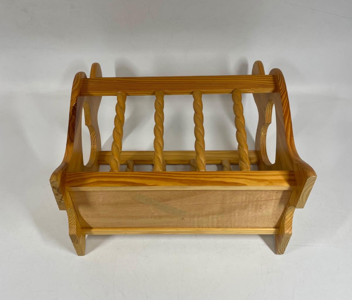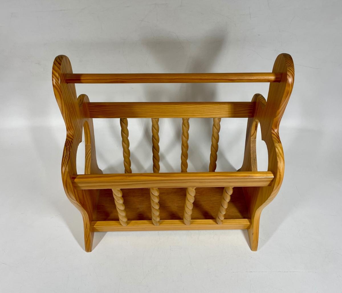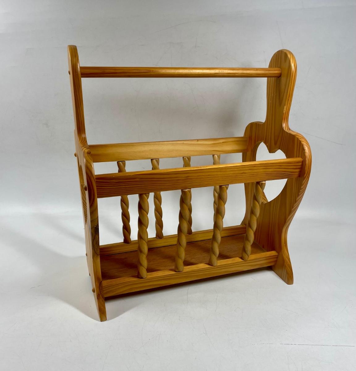 Magazine Rack made from varnished pine. Approx 16" tall and 14" long. Excellent condition.