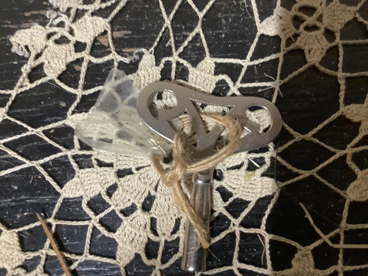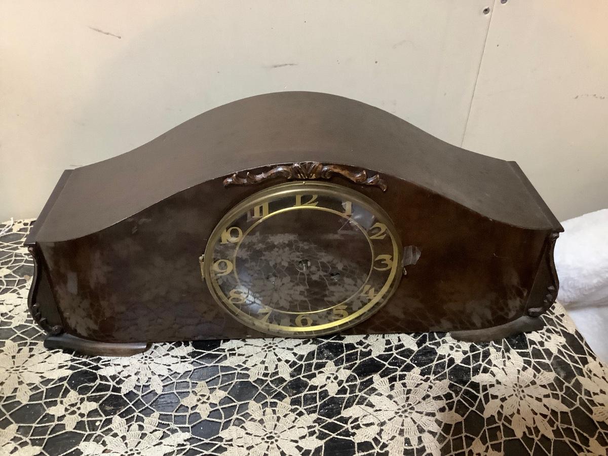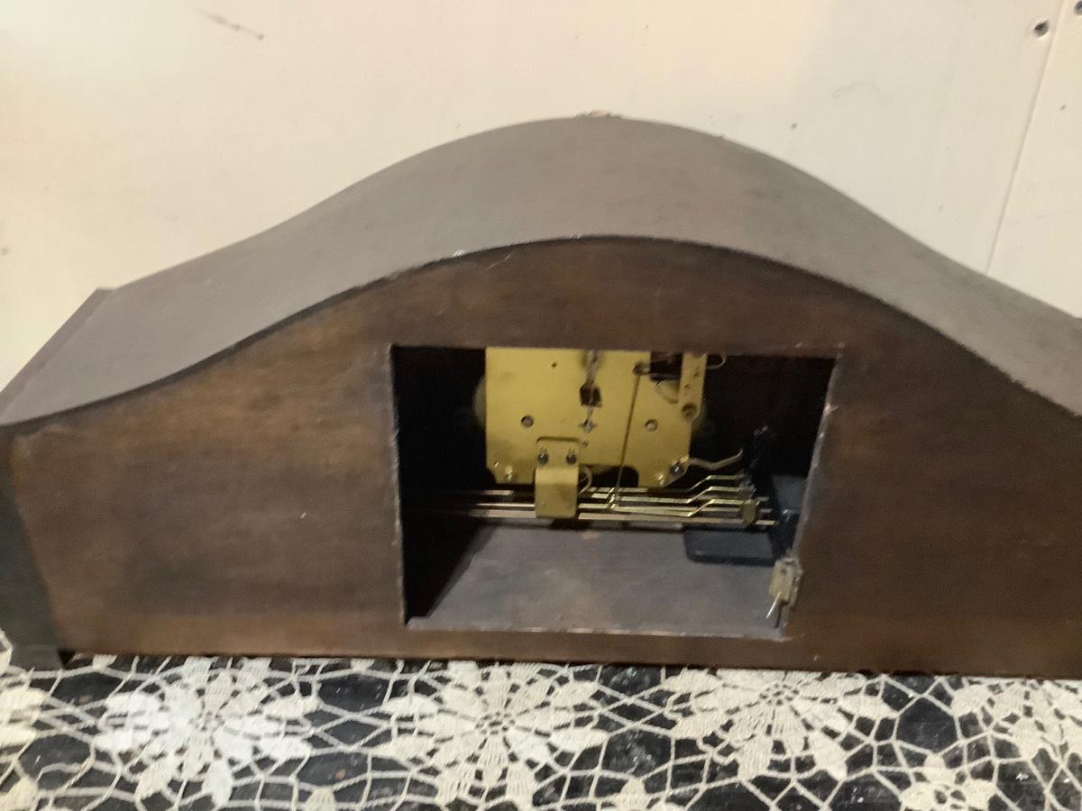 This isa wood mantle clock. Has the key to wind it, but is missing clock hands and back door.