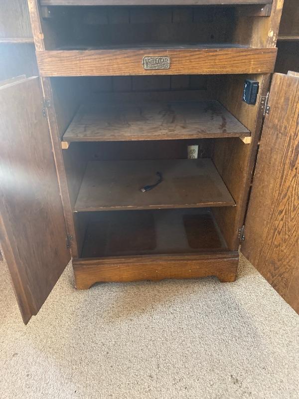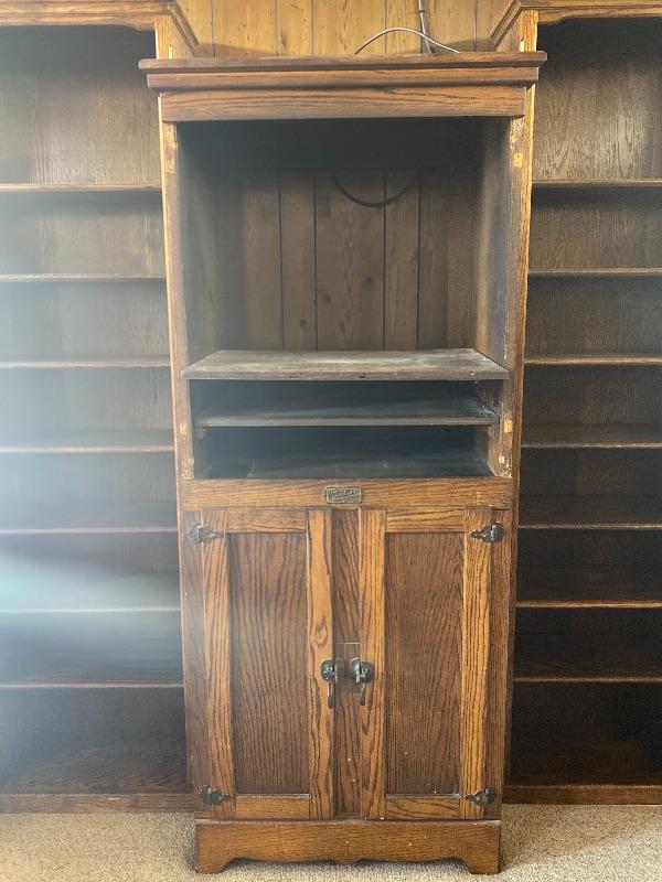 Altered media cabinet. Over 6’ tall. Top doors have been removed. Shelf is screwed in to place. Has project potential.