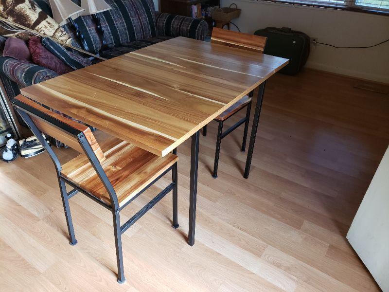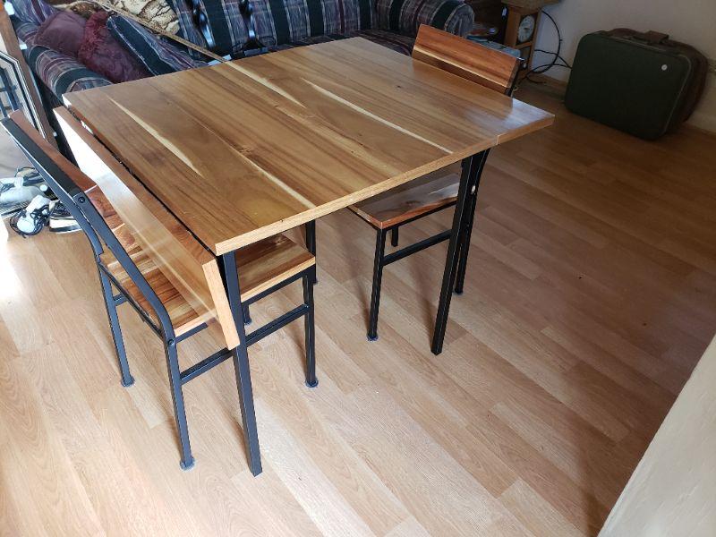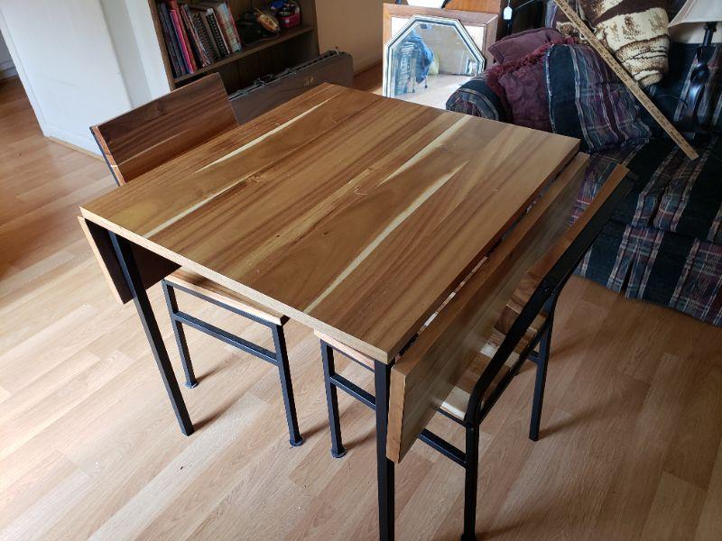 Wood top table has 2 -9" sections which can fold down individually. Table measures36x46x30 fully open & has 2 chairs.