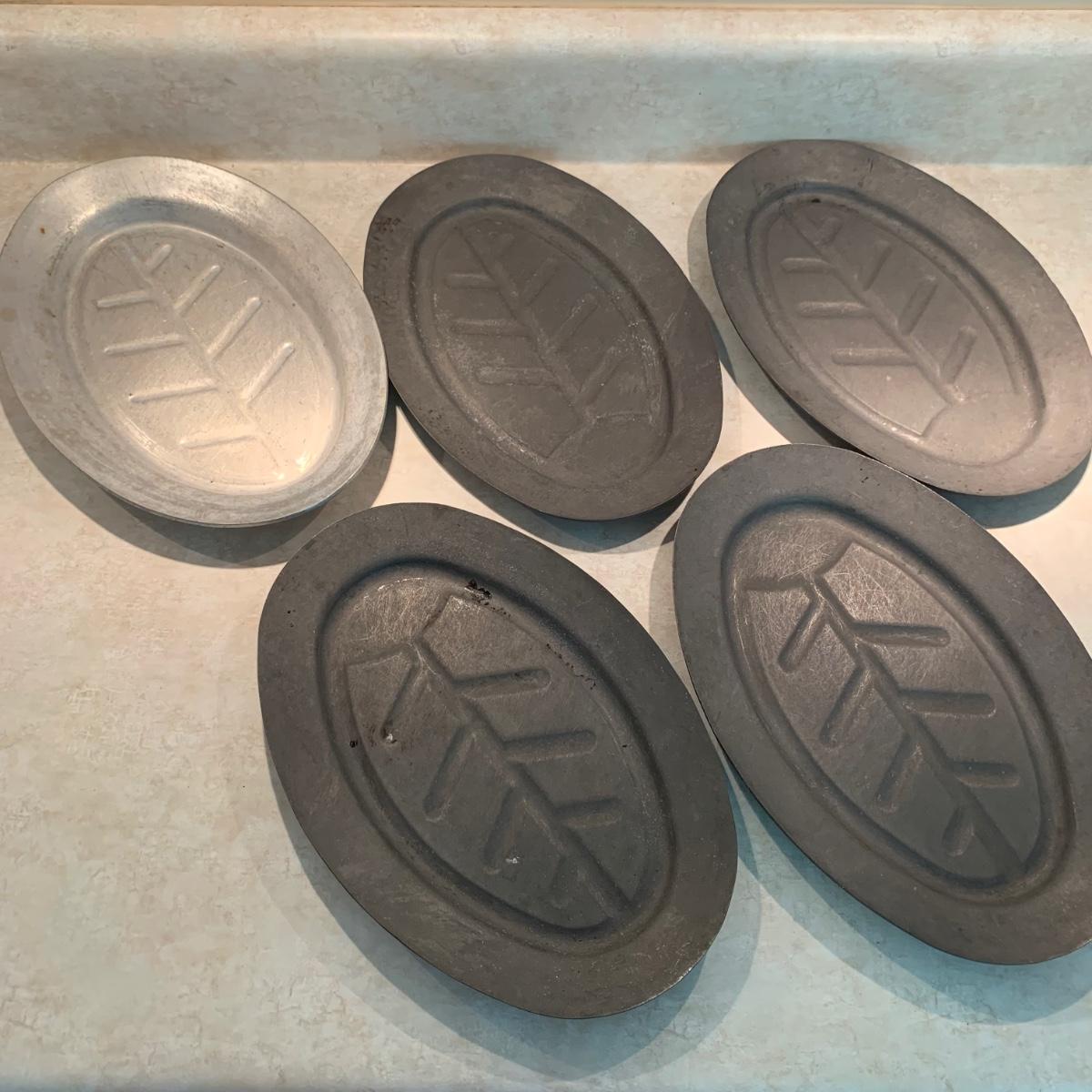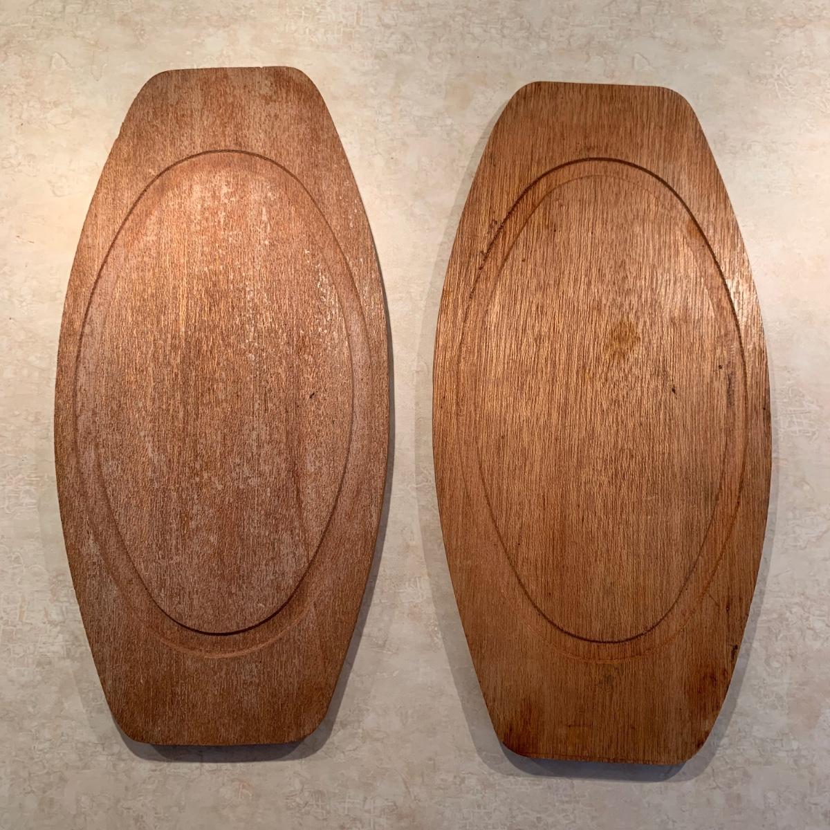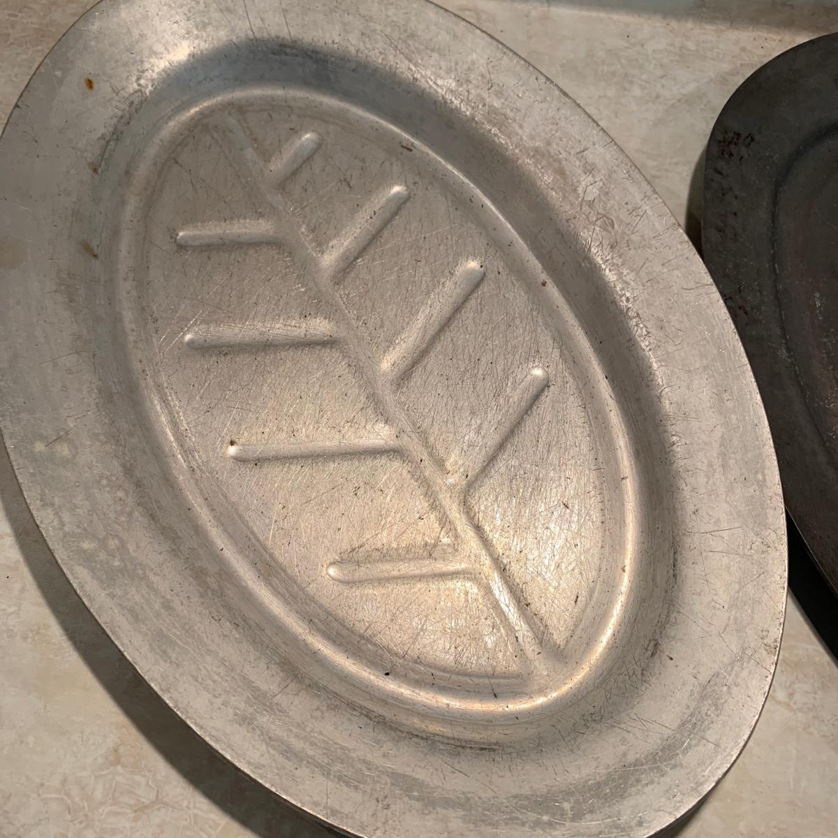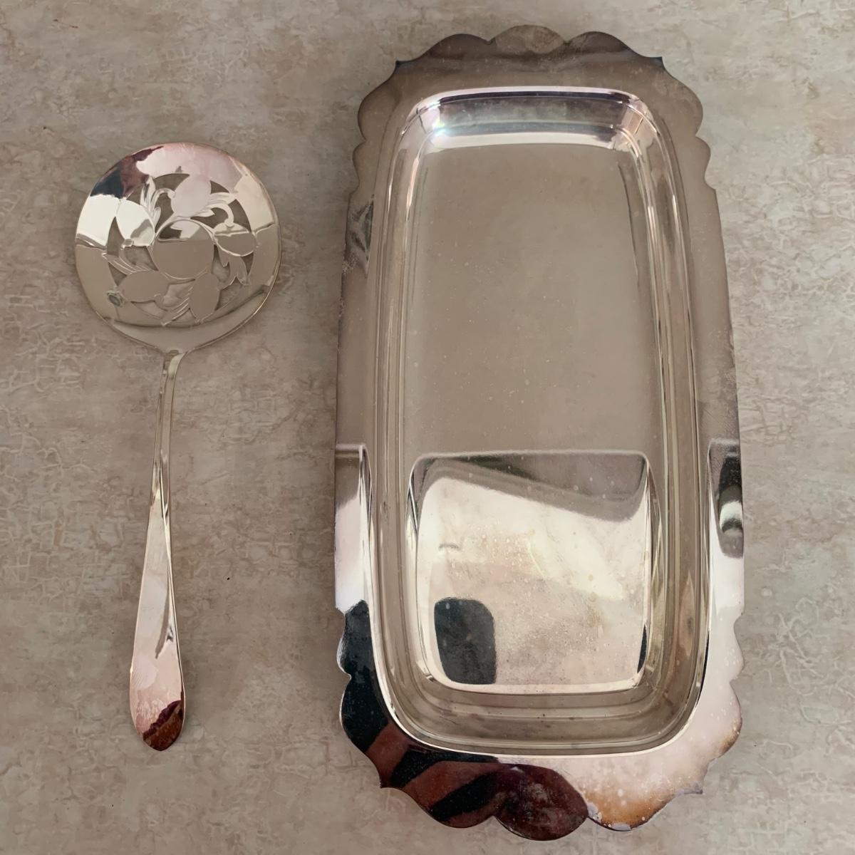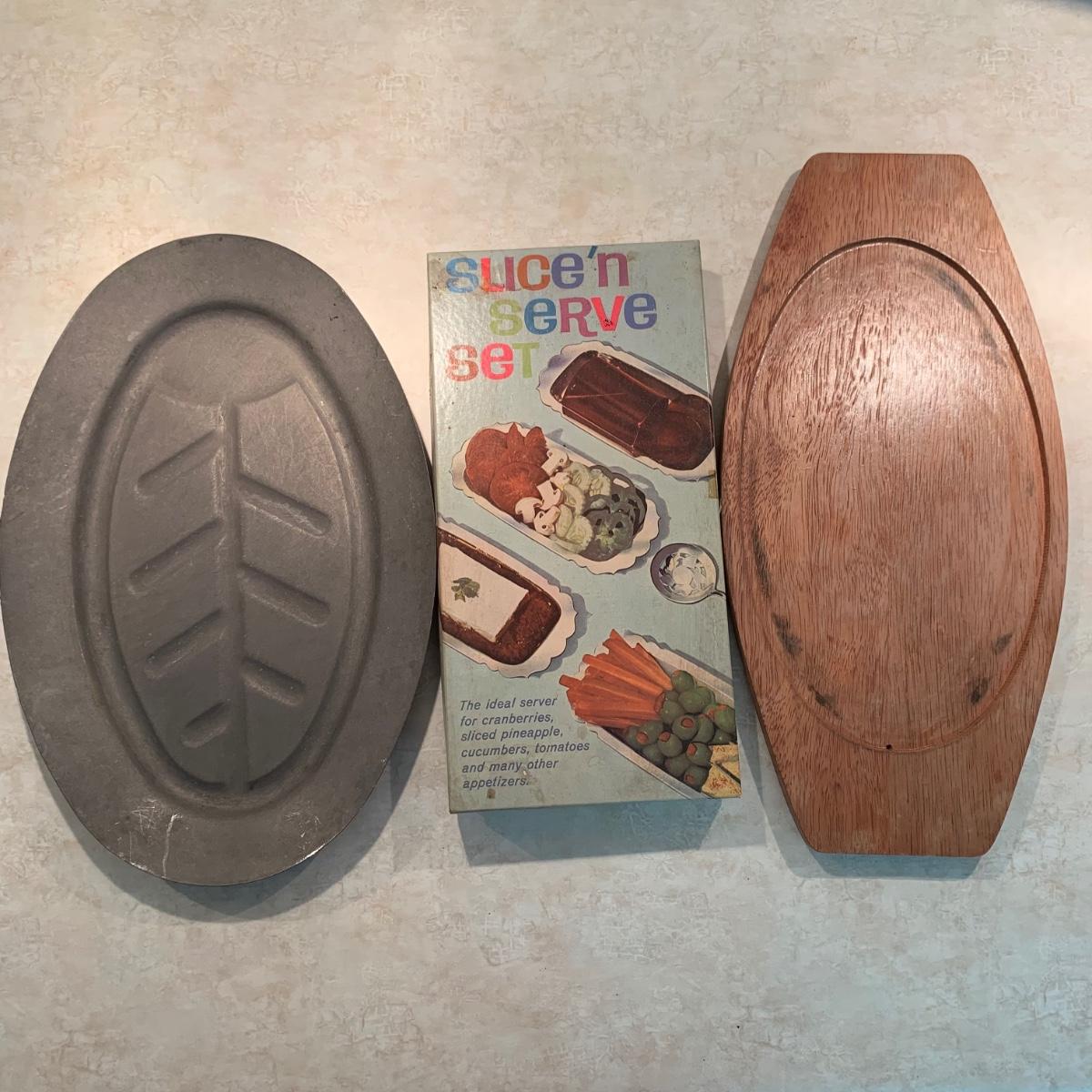 This lot includes a set of five wood trays, a set of two other wood trays, five metal trays, and one silver plated “Slice’n Serve Set”. Both sets of the wood trays measure 13.25” x 6.5”. The metal trays measure 12” x 8”. One of the metal trays is slightly larger and is silver-colored, whereas the others are a slate gray color. The box of the Slice’n Serve Set says it is silver plate. There is some tarnishing on the tray. Shipping available.