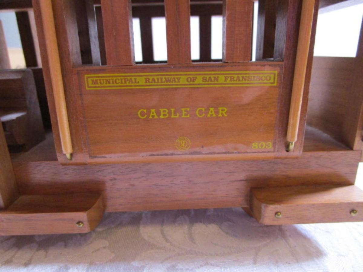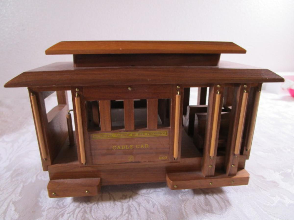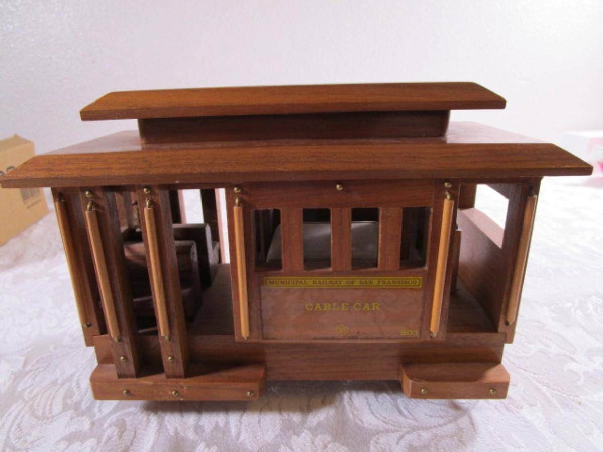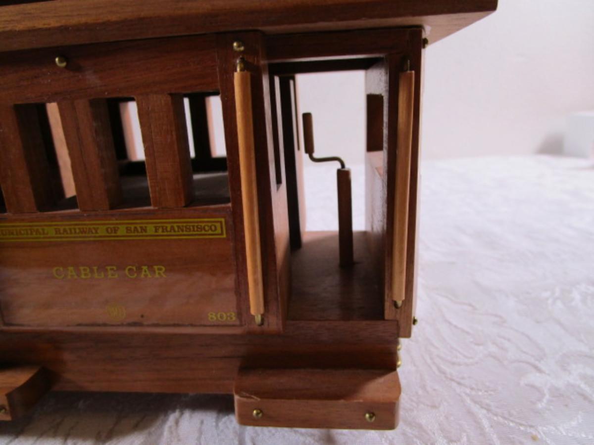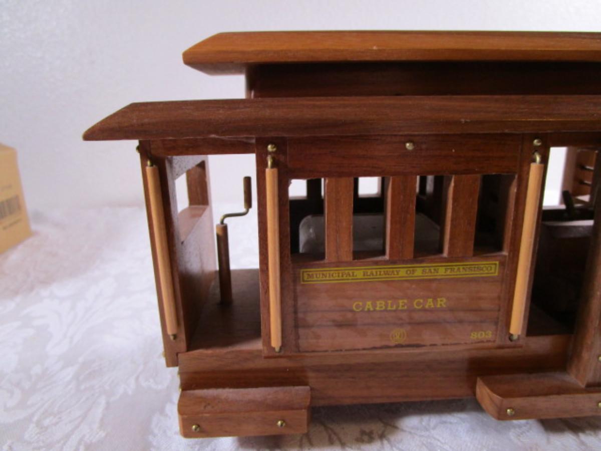 Great detail, music works slowly, plays "I left My Heart in San Francisco", 7-1/2" long x 6" tall x 5-3/4"" wide, made in San Francisco