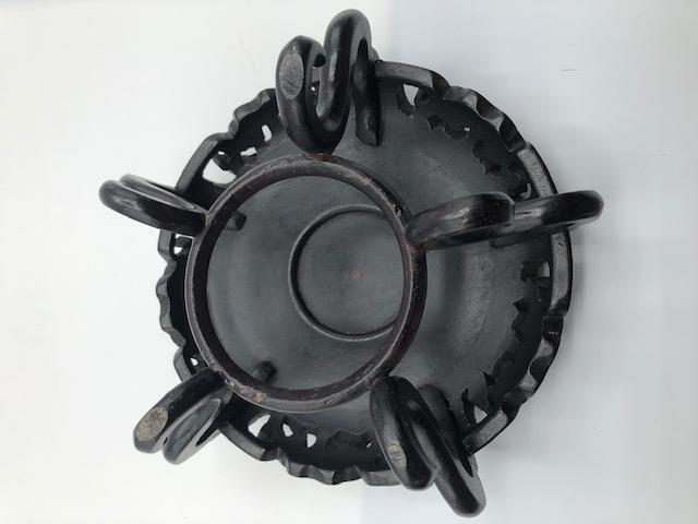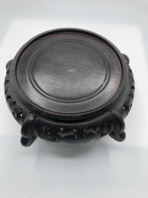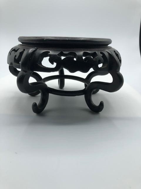 Ornate wood pedestal stand. Use under a vase or as a candle holder. Would hold a vase with a 5” base or less. Stands about 4” tall.