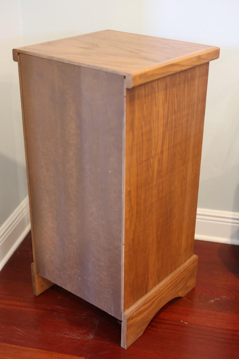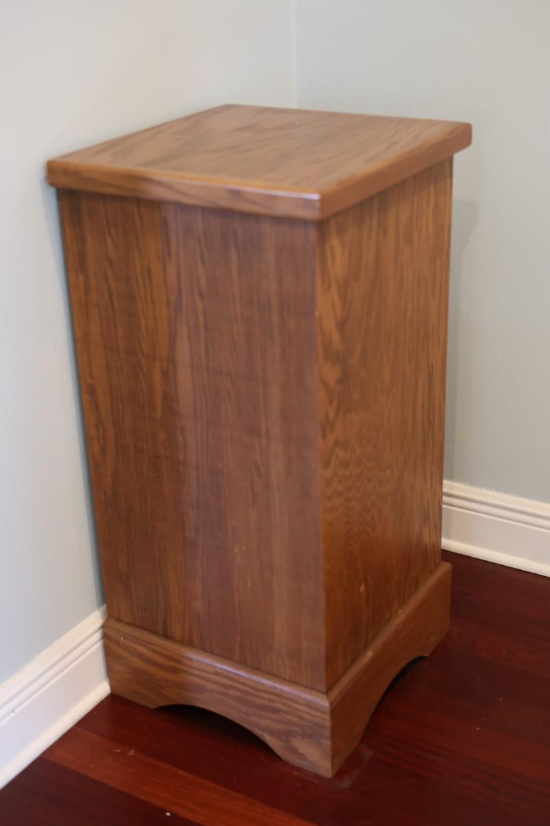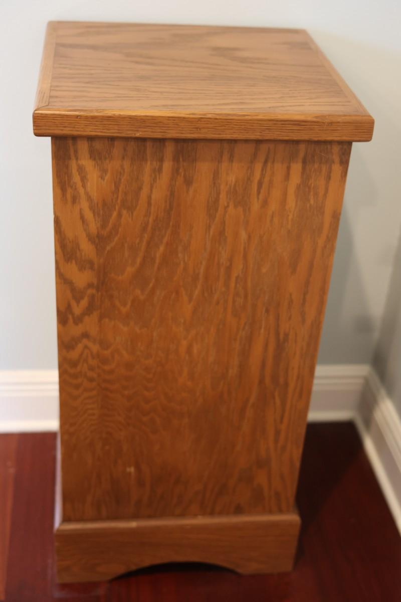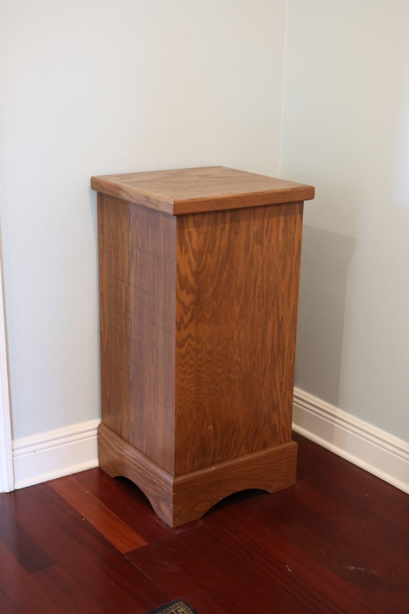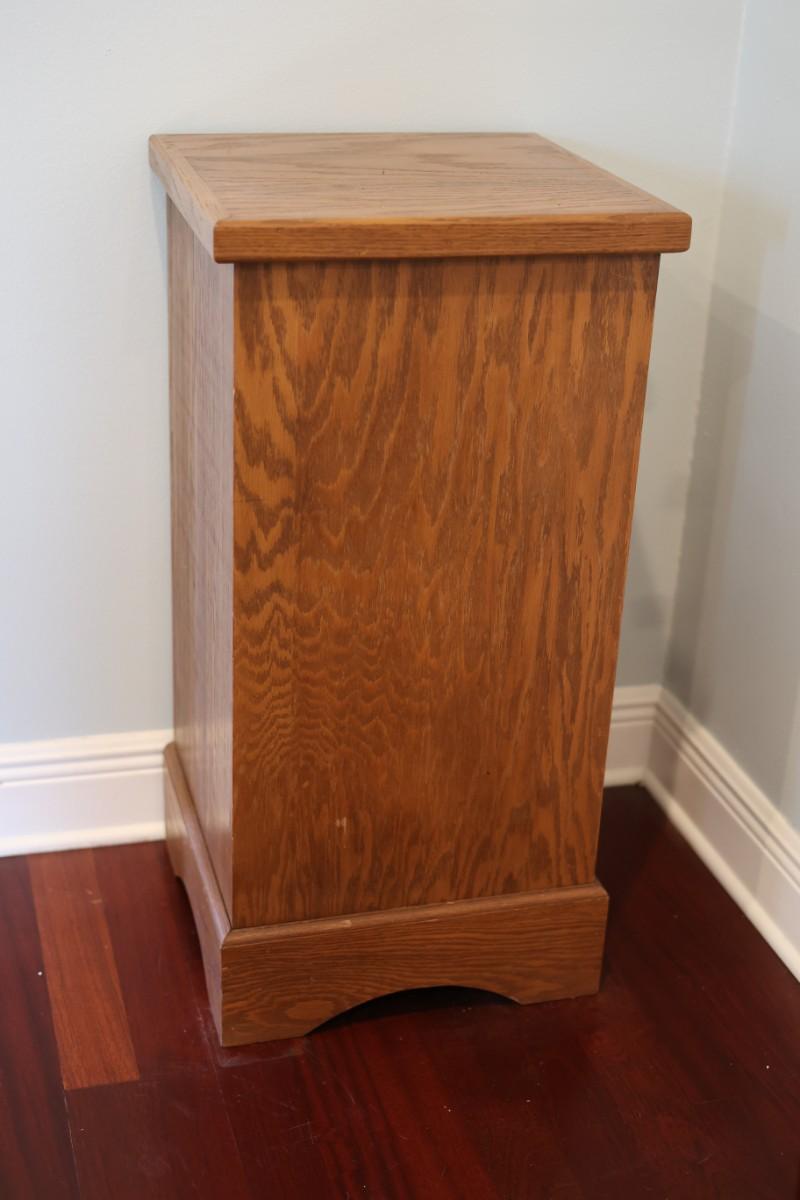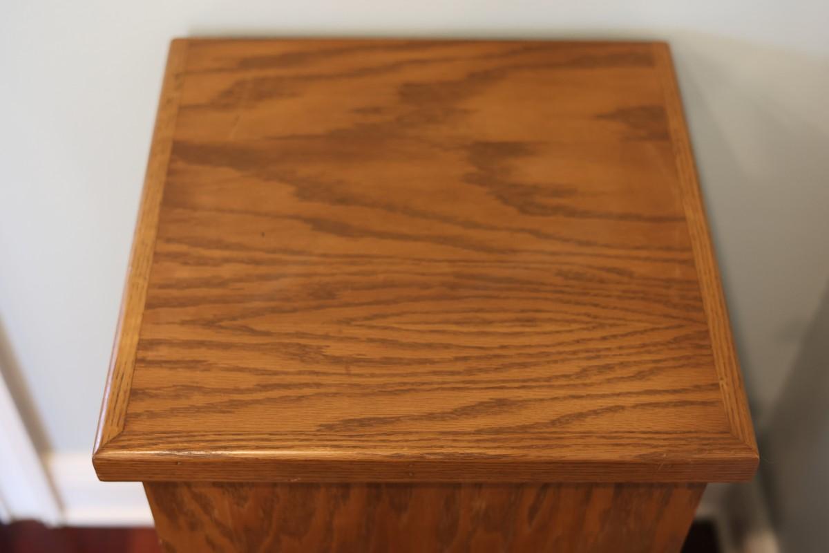 Solid wood pedestal stand with flat top and paneled sides. Finished in a medium wood tone with a molded base. Suitable for use as a display pedestal for décor, plants, sculpture, or as an accent stand.