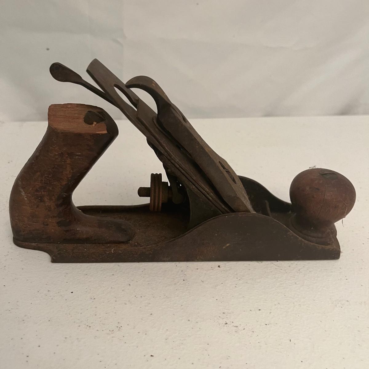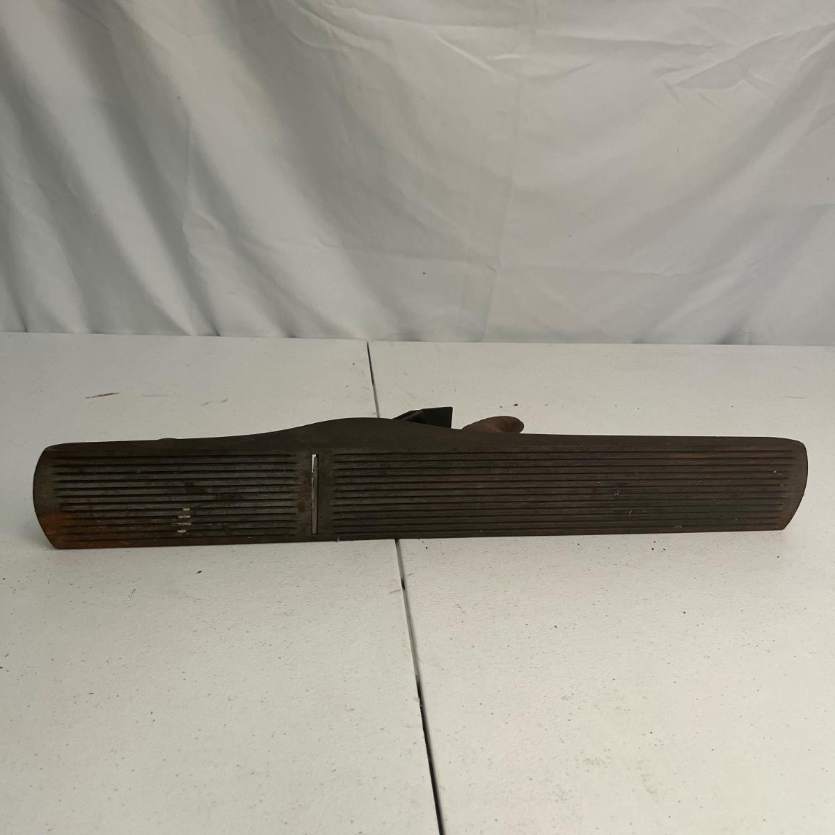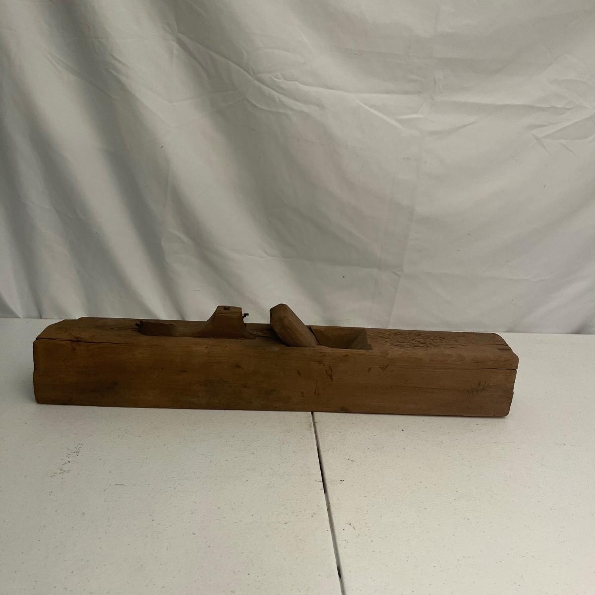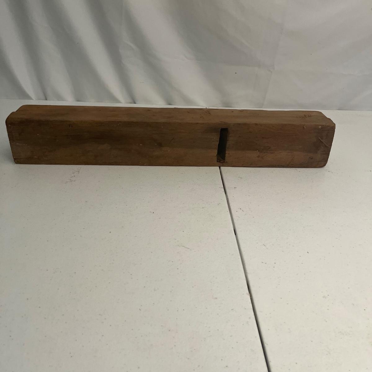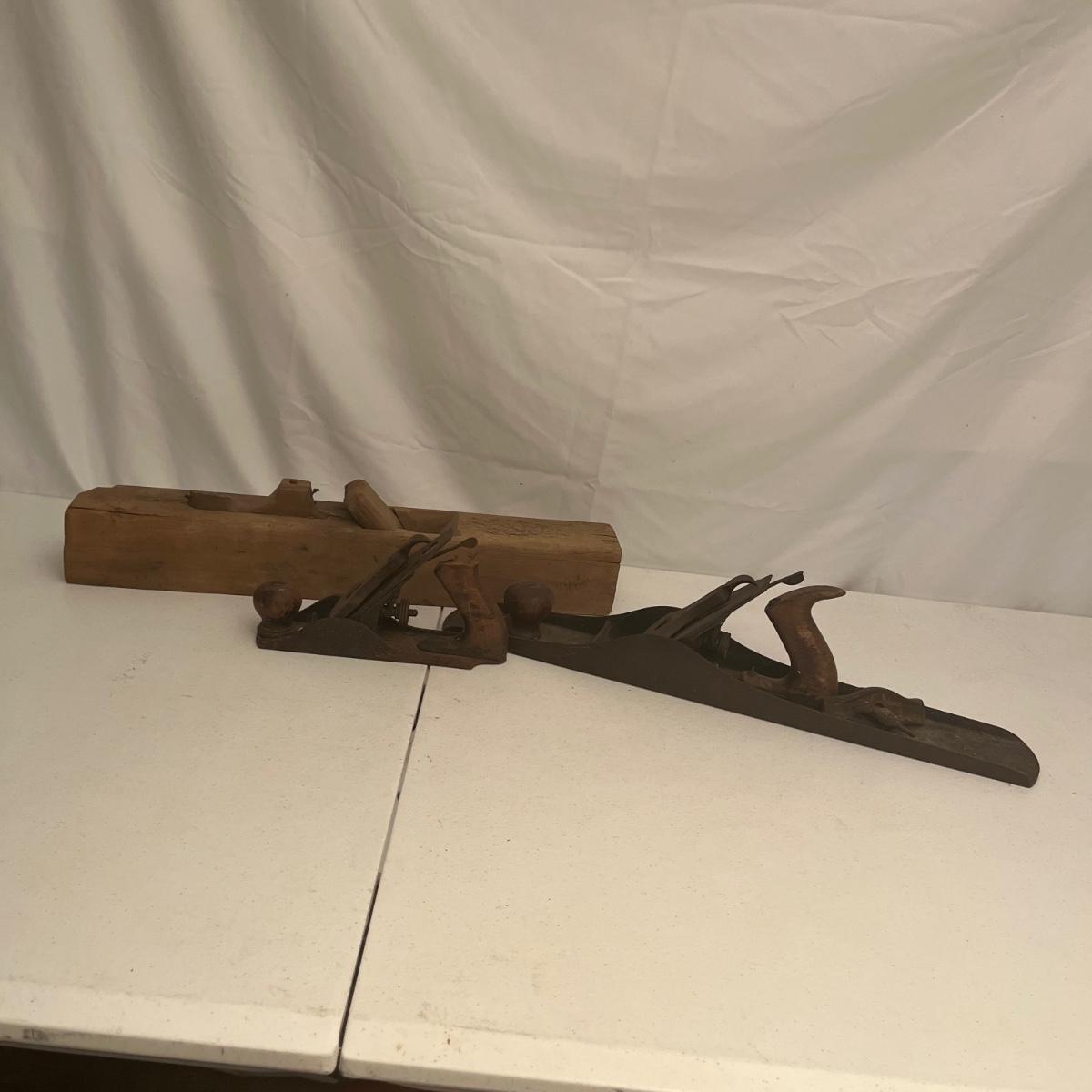 Lot includes large iron wood planer, small iron wood planer and a wooden wooden planer that is missing pieces, see pictures. Large iron planer measures 2.75” x 21” x 5.5”.