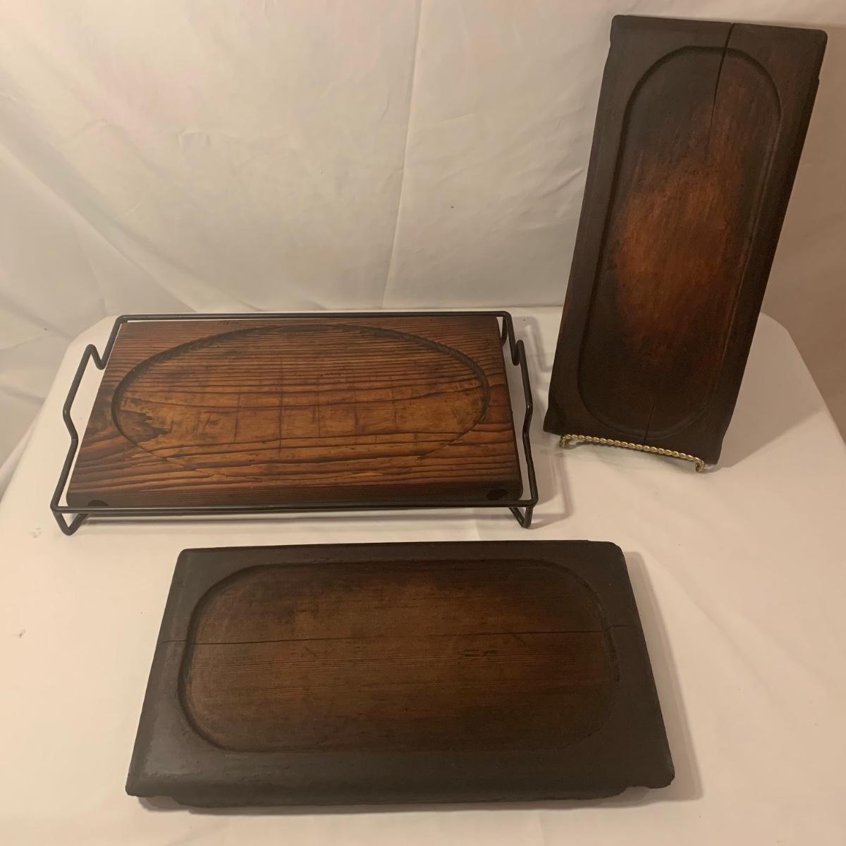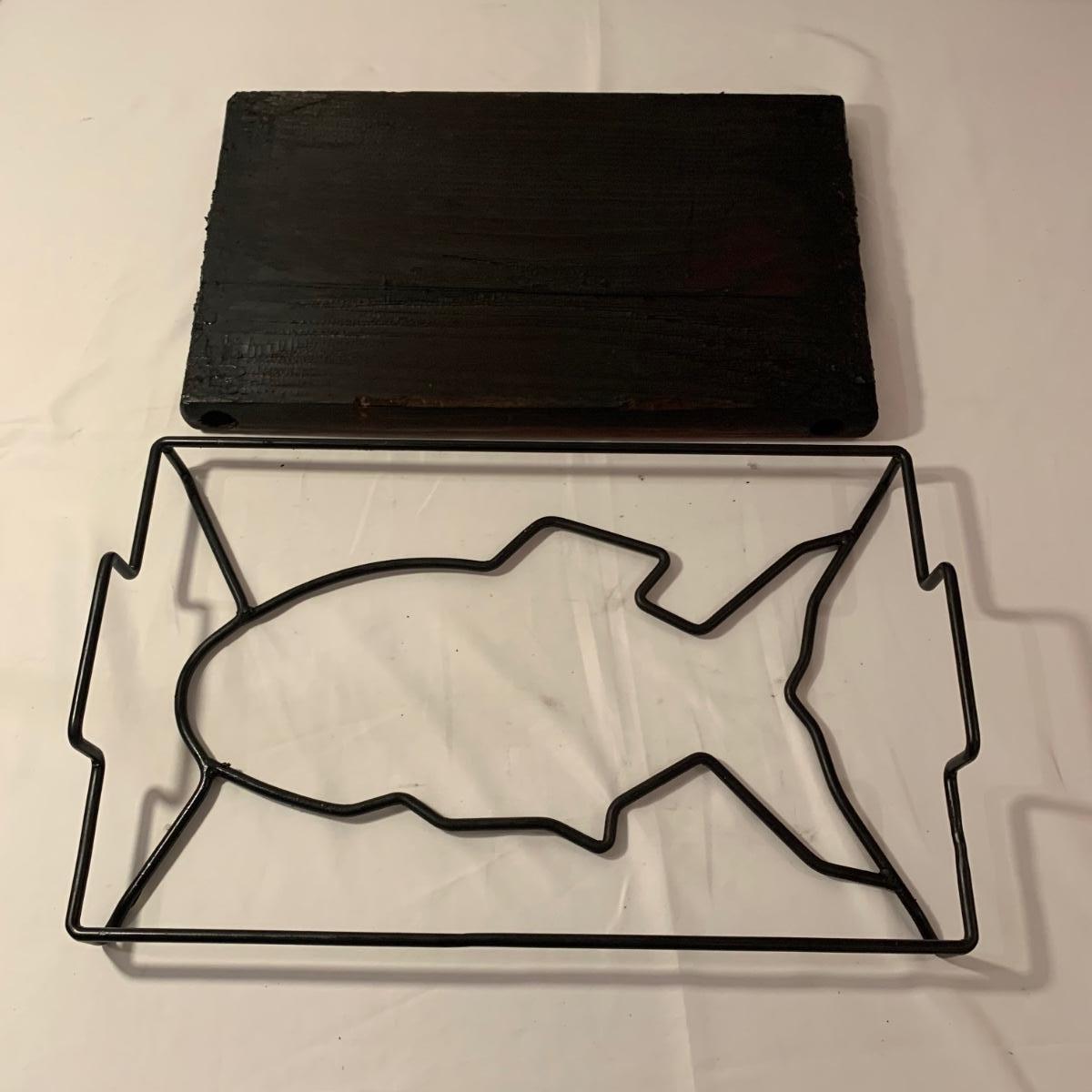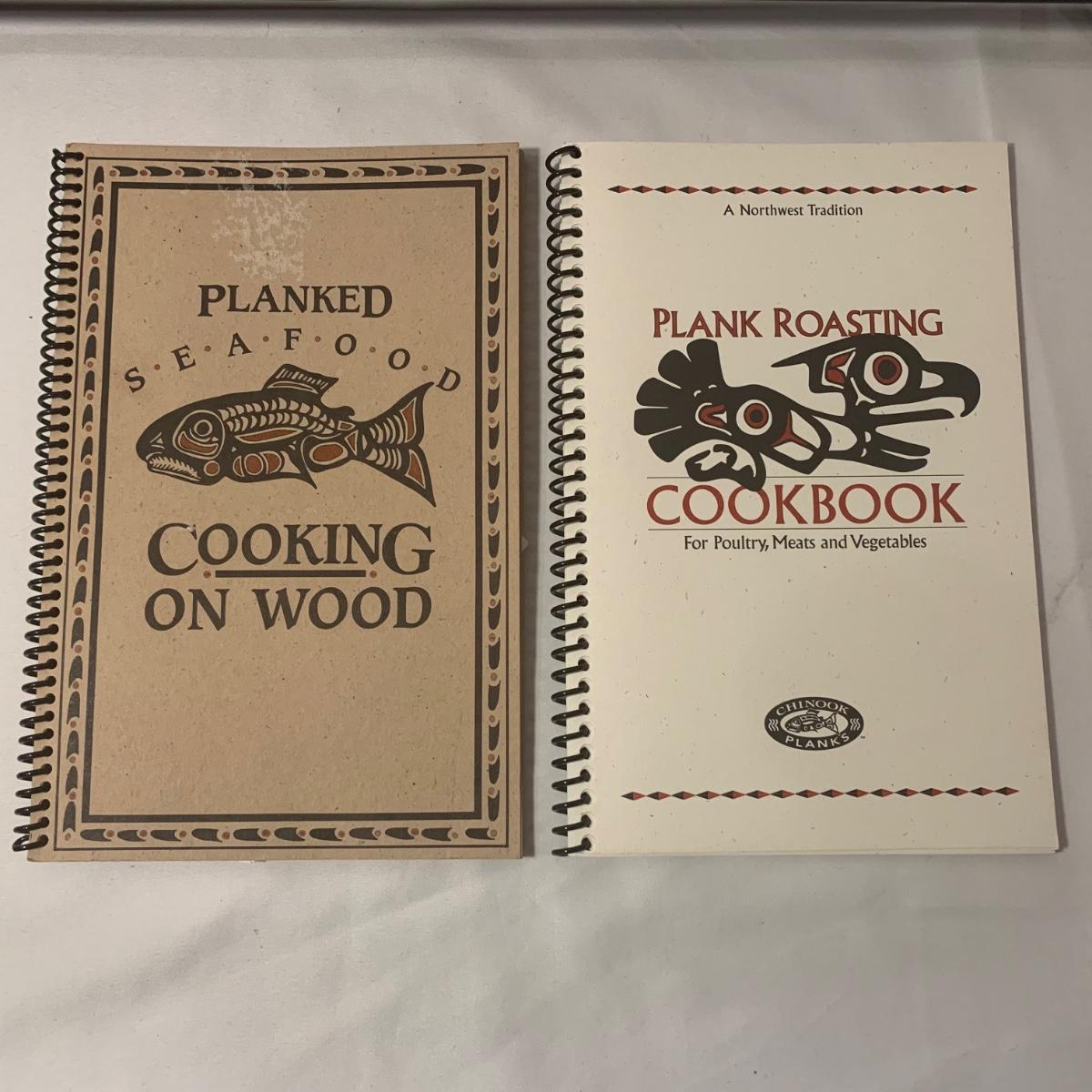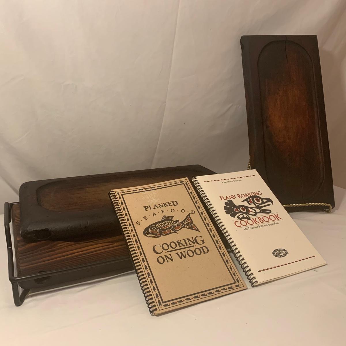 Wood plank cooking set includes two cook books, and three wood cooking planks. Largest plank has fish designed metal holder with handles and measures 17” x 10” x 2”H. All items are in used condition and wood planks show charring from use. Local pickup only.