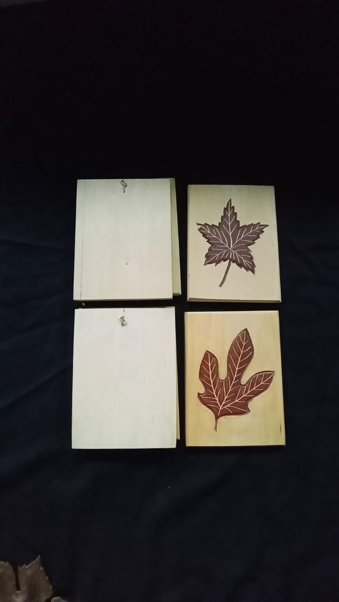WOOD PLAQUES WITH WOODEN CARVED INLAID LEAVES