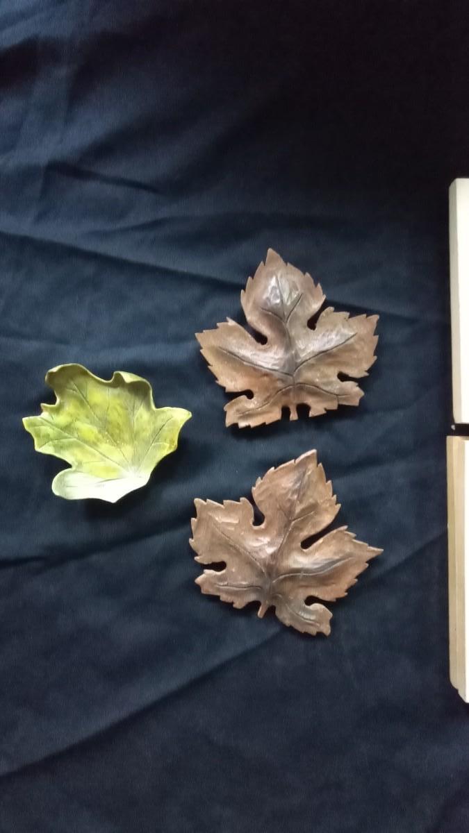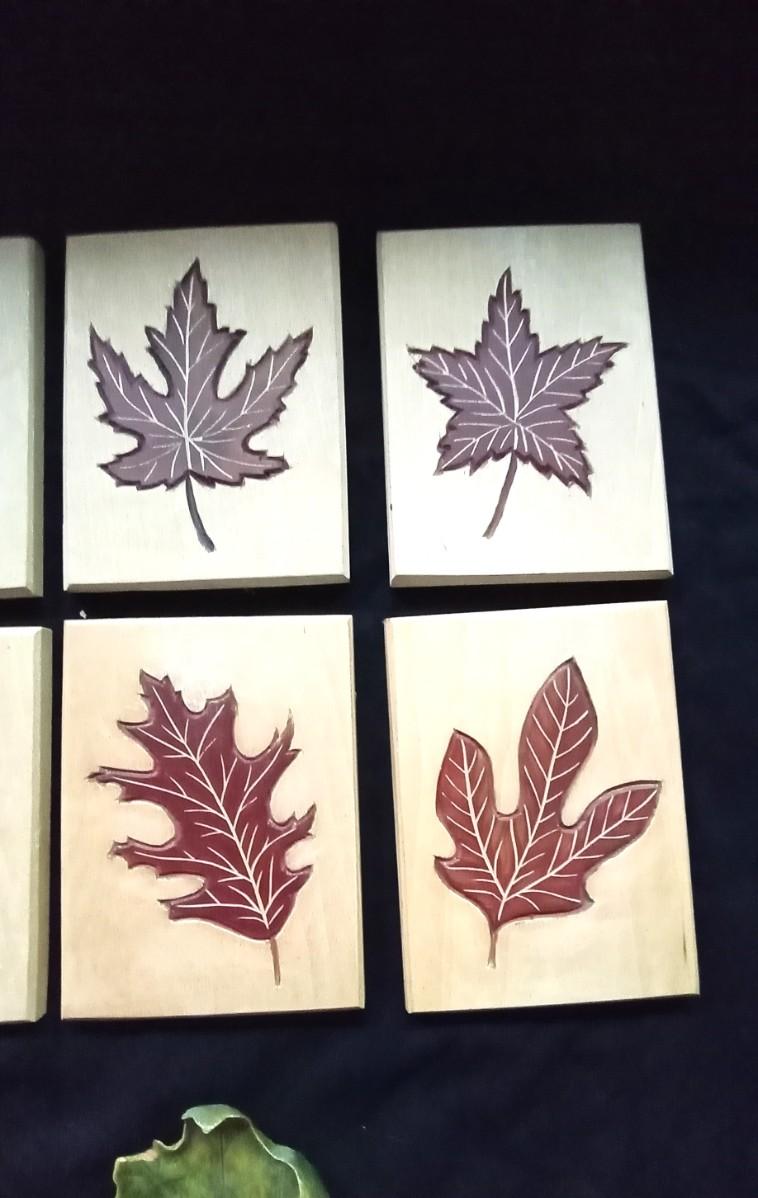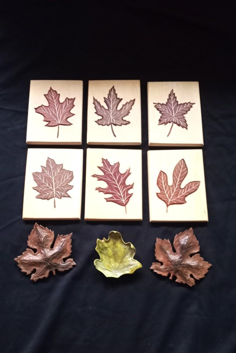 WOOD PLAQUES WITH WOODEN INLAID LEAVES FOR HANGING AND SINGLE CARVED WOODEN LEAVES