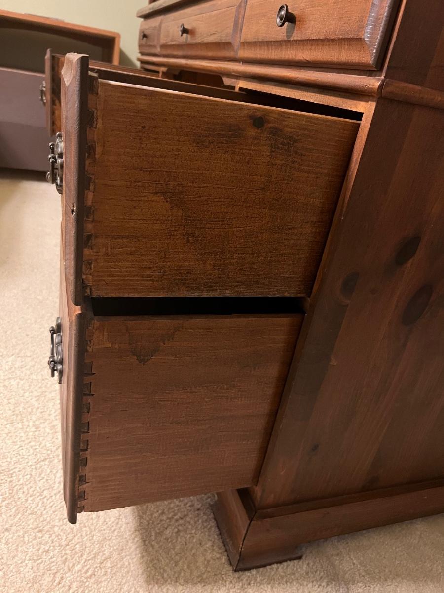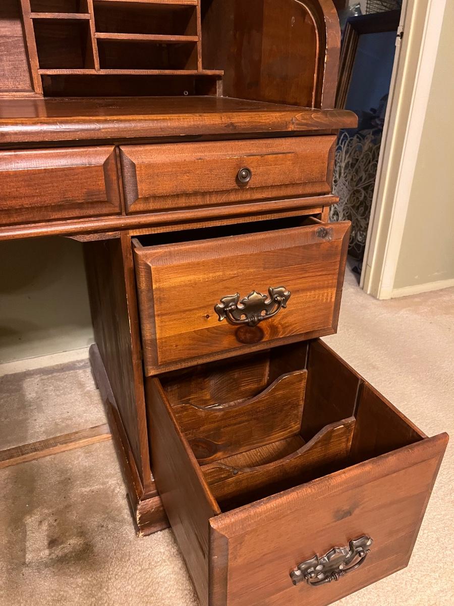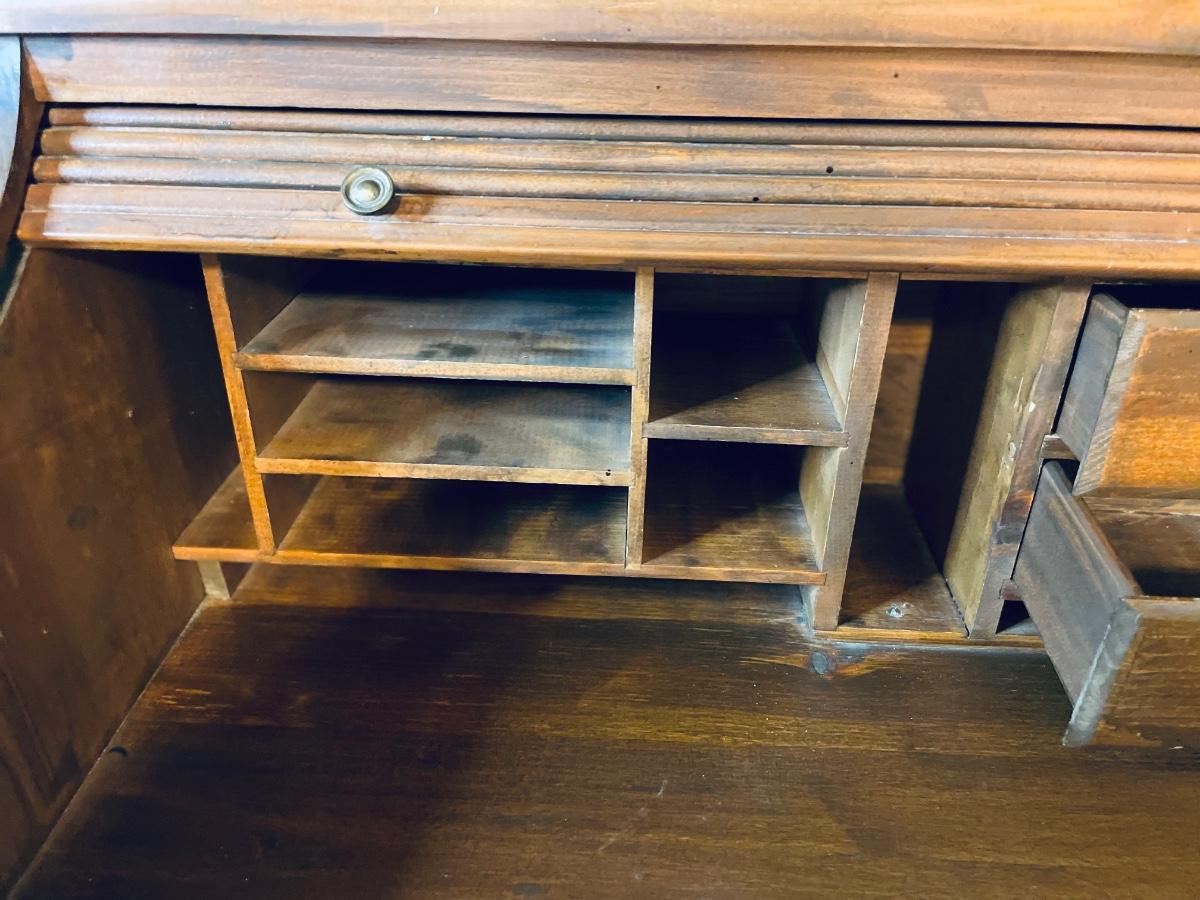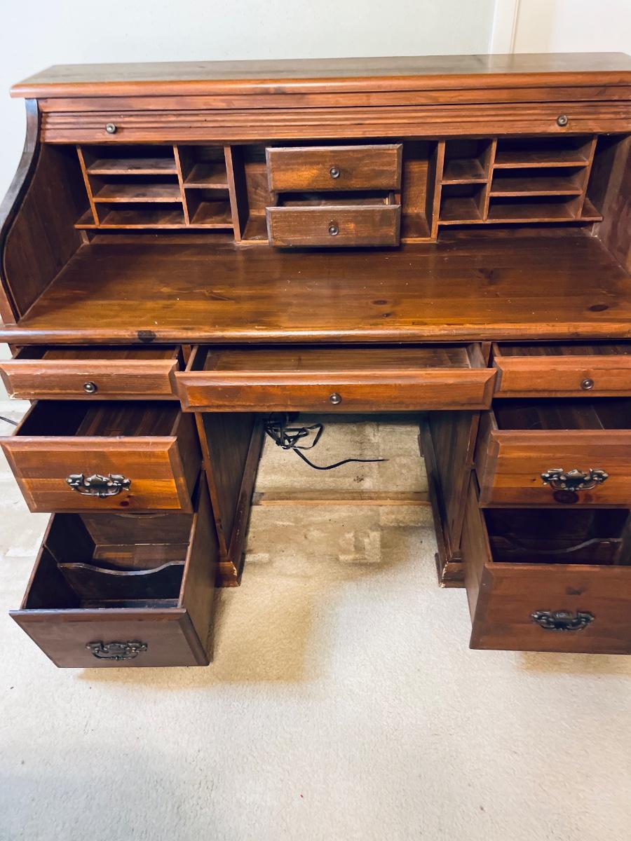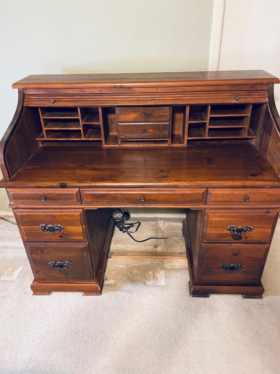 Wood Roll top desk with dovetail drawers Measures 44” tall , 53 long, 25” deep,