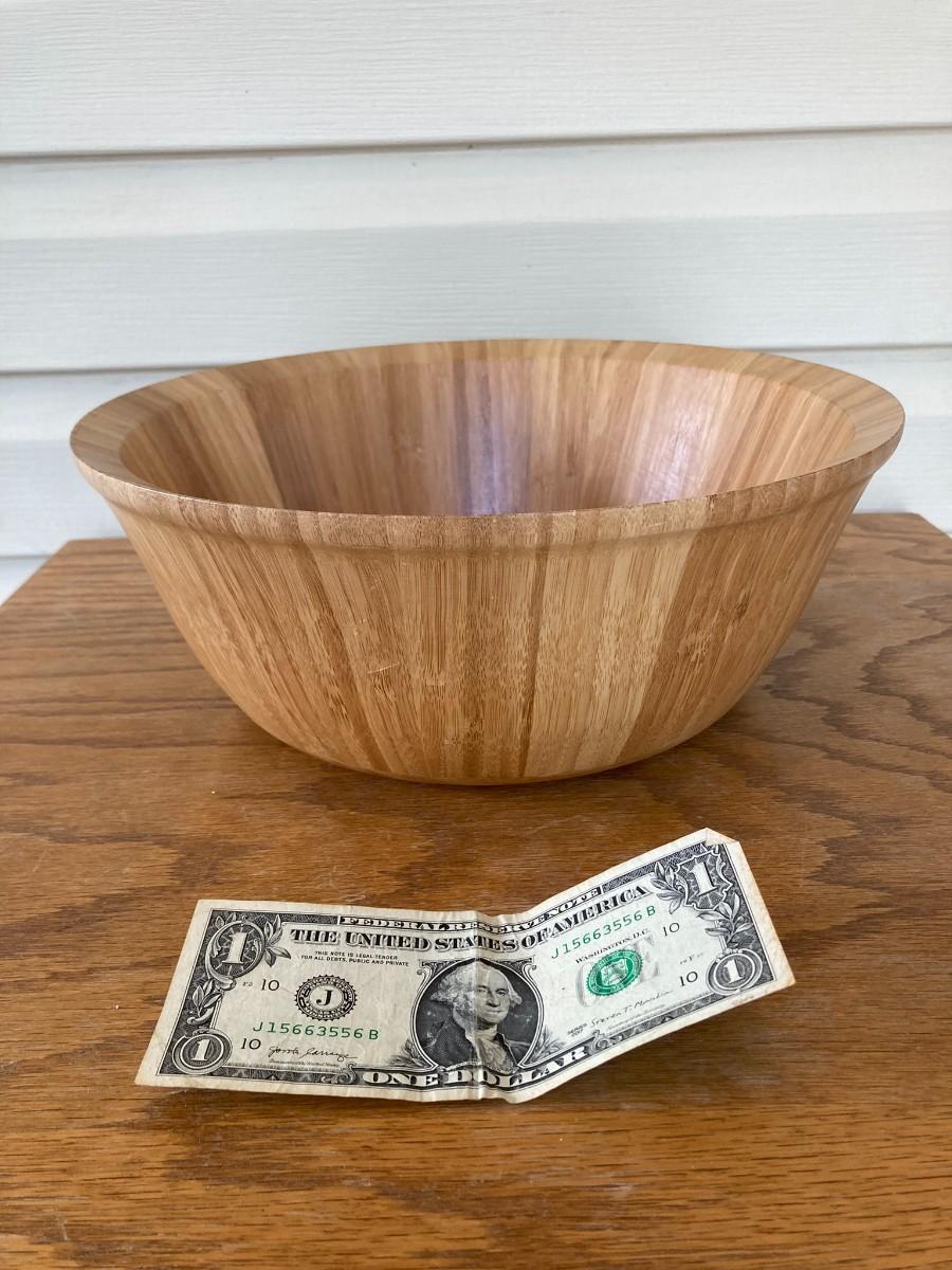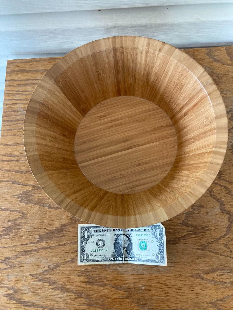Classy lil' salid bowl. End-cut vertically turned blond in color and just the right size that seems to always be needed. Appears to be bamboo.
