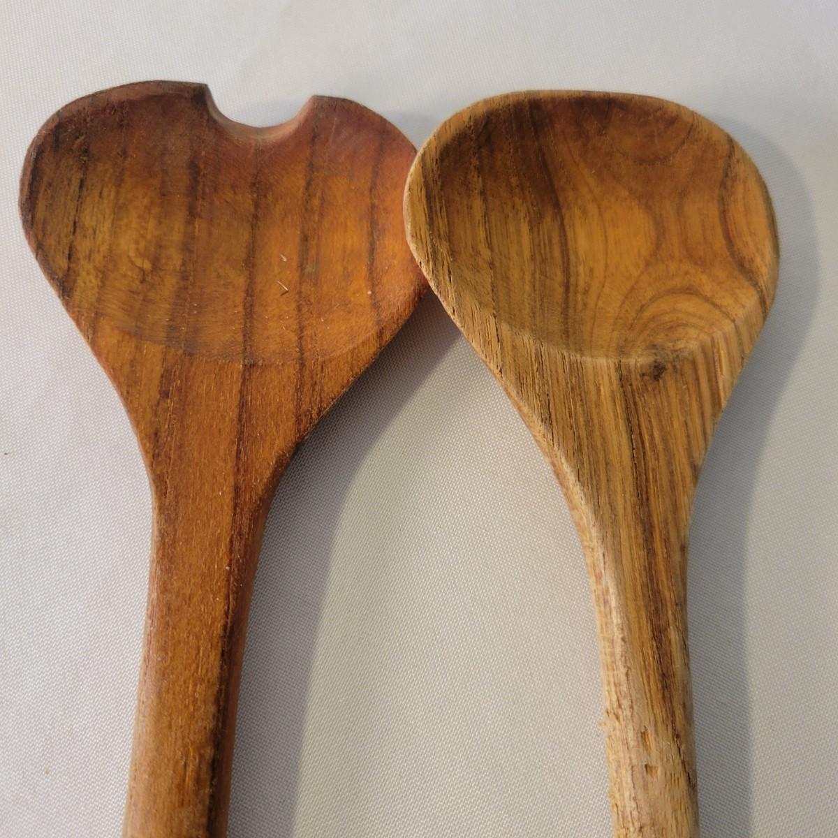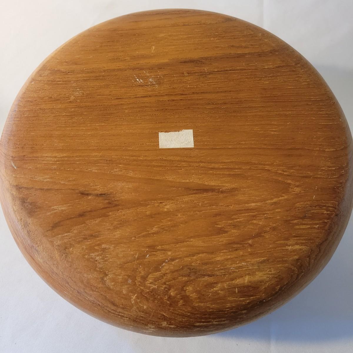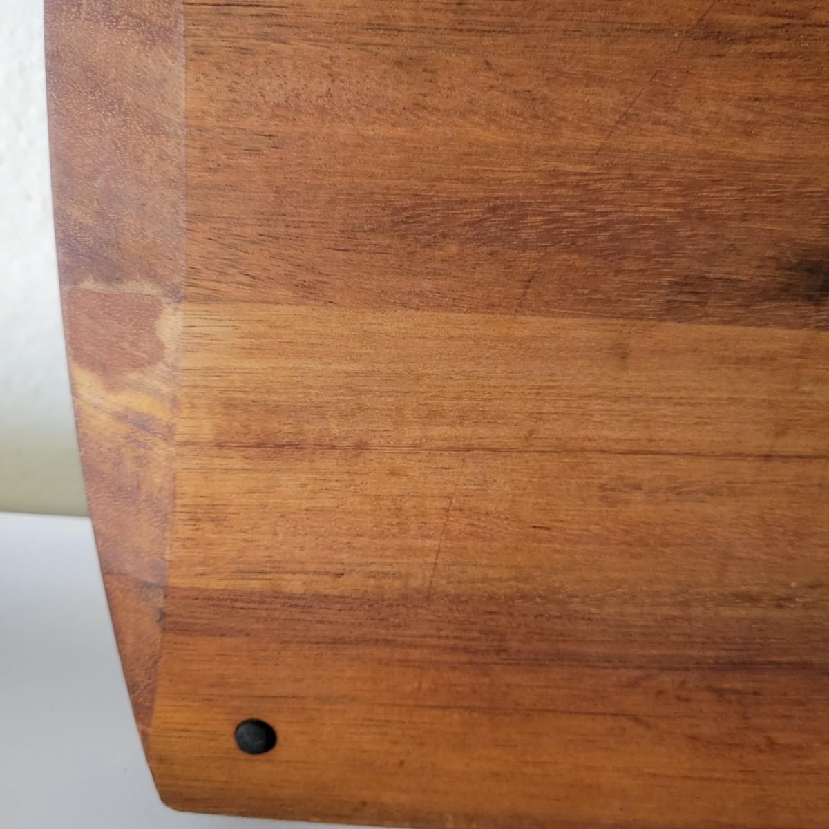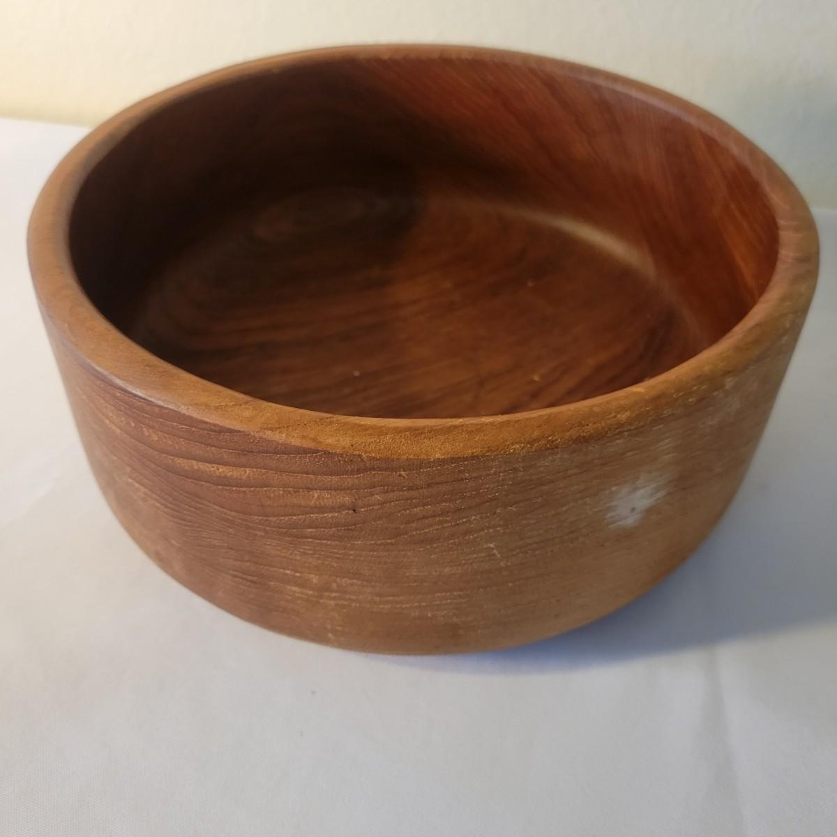 A wooden salad bowl with utensils and cutting board in good condition with some minor blemishes. Wooden bowl and utensils are a little faded, but could easily be refinished for new life. Bowl measures approximately 9.5"D x 4"H. Also included is a substantial wooden cutting board that measures approximately 17" x 11" x 1.5". Cutting board is missing some if it's rubber feat and does show some wear from use. Shipping available. Shipping can be costly. We suggest calling our local UPS with dimensions and getting an estimate before bidding: (828) 252-6930.