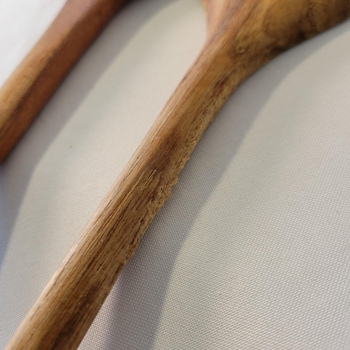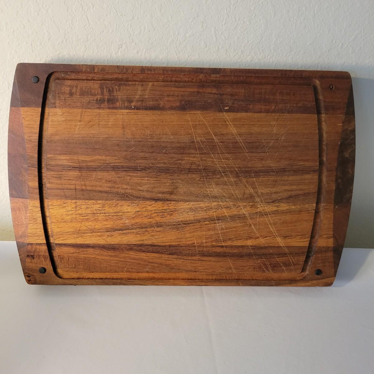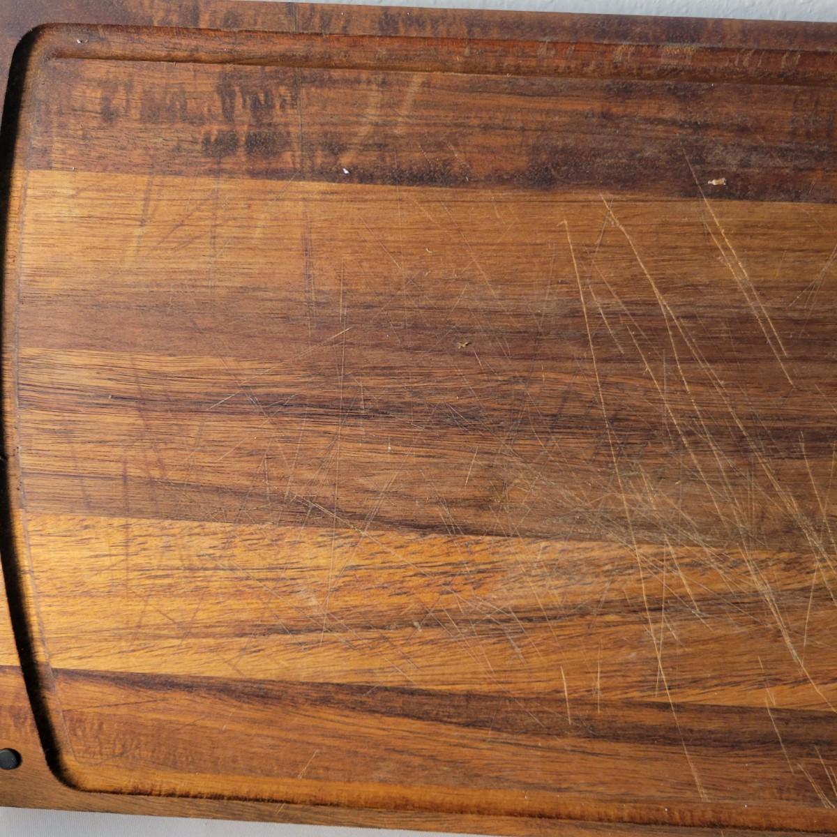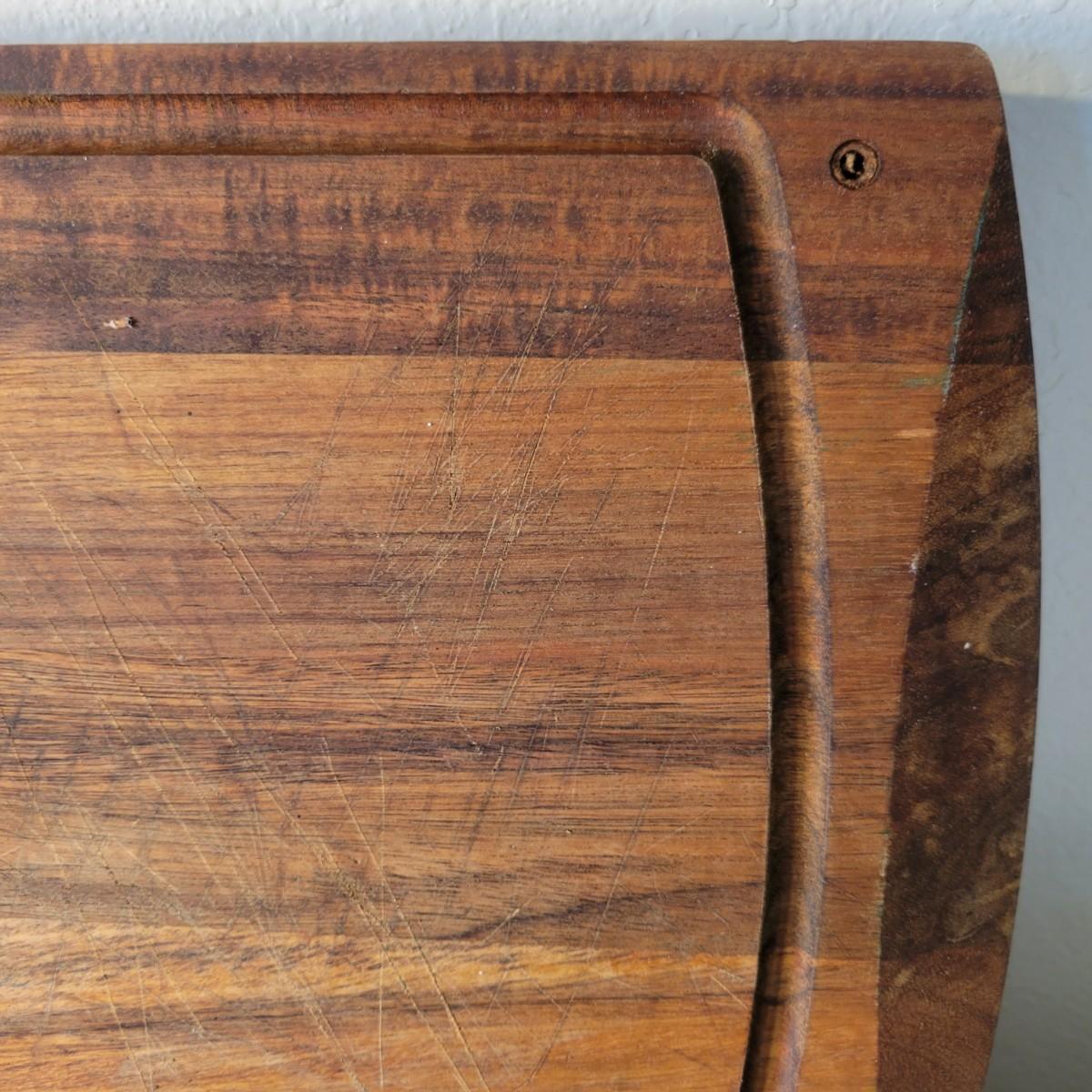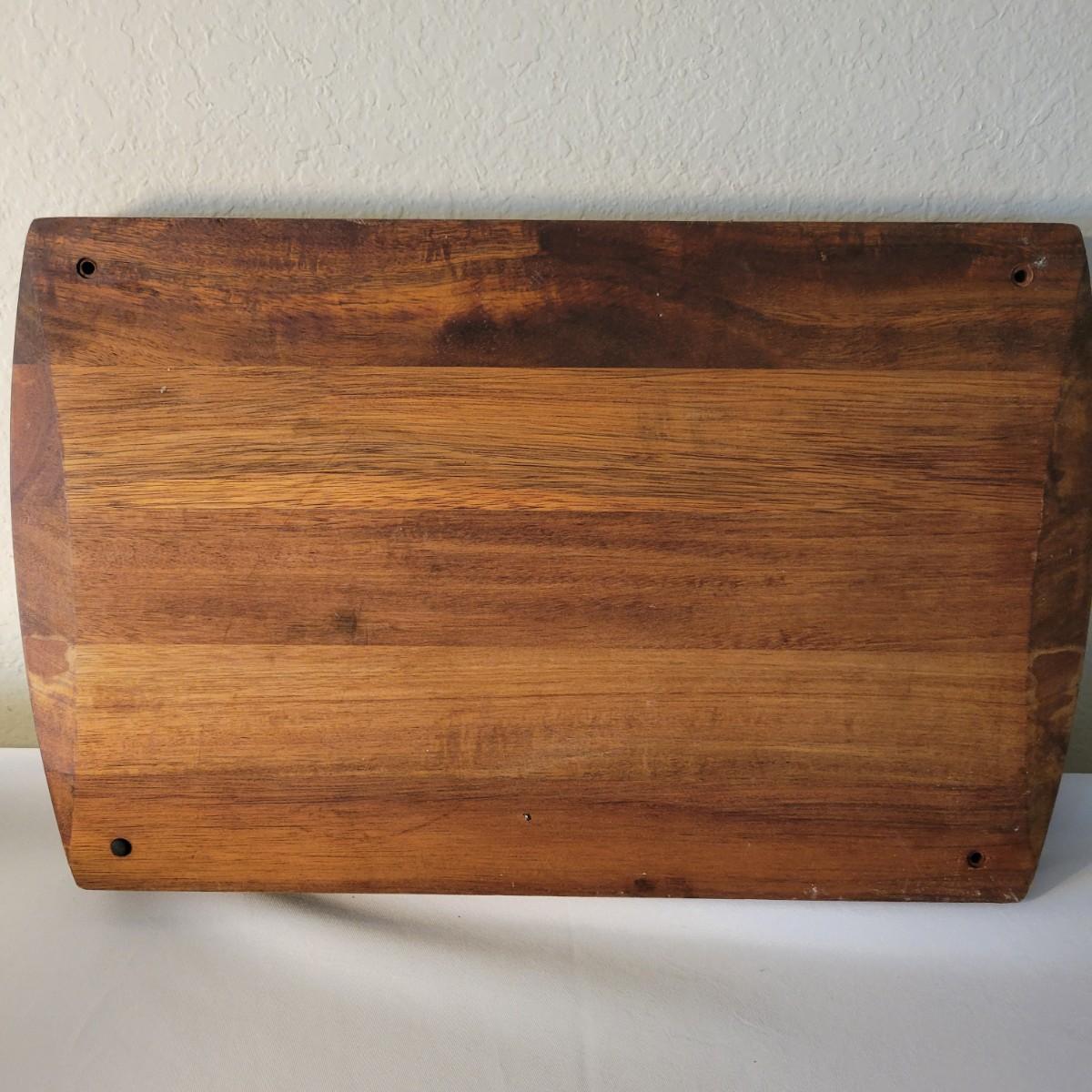 A wooden salad bowl with utensils and cutting board in good condition with some minor blemishes. Wooden bowl and utensils are a little faded, but could easily be refinished for new life. Bowl measures approximately 9.5"D x 4"H. Also included is a substantial wooden cutting board that measures approximately 17" x 11" x 1.5". Cutting board is missing some if it's rubber feat and does show some wear from use. Shipping available. Shipping can be costly. We suggest calling our local UPS with dimensions and getting an estimate before bidding: (828) 252-6930.