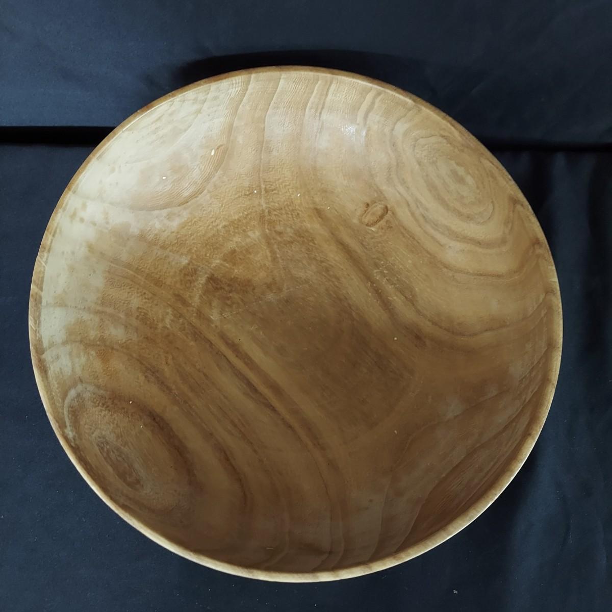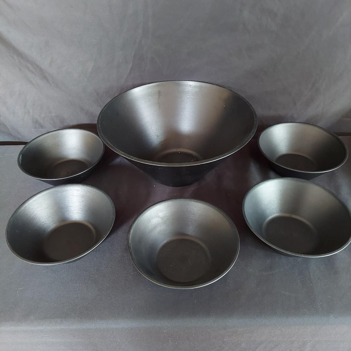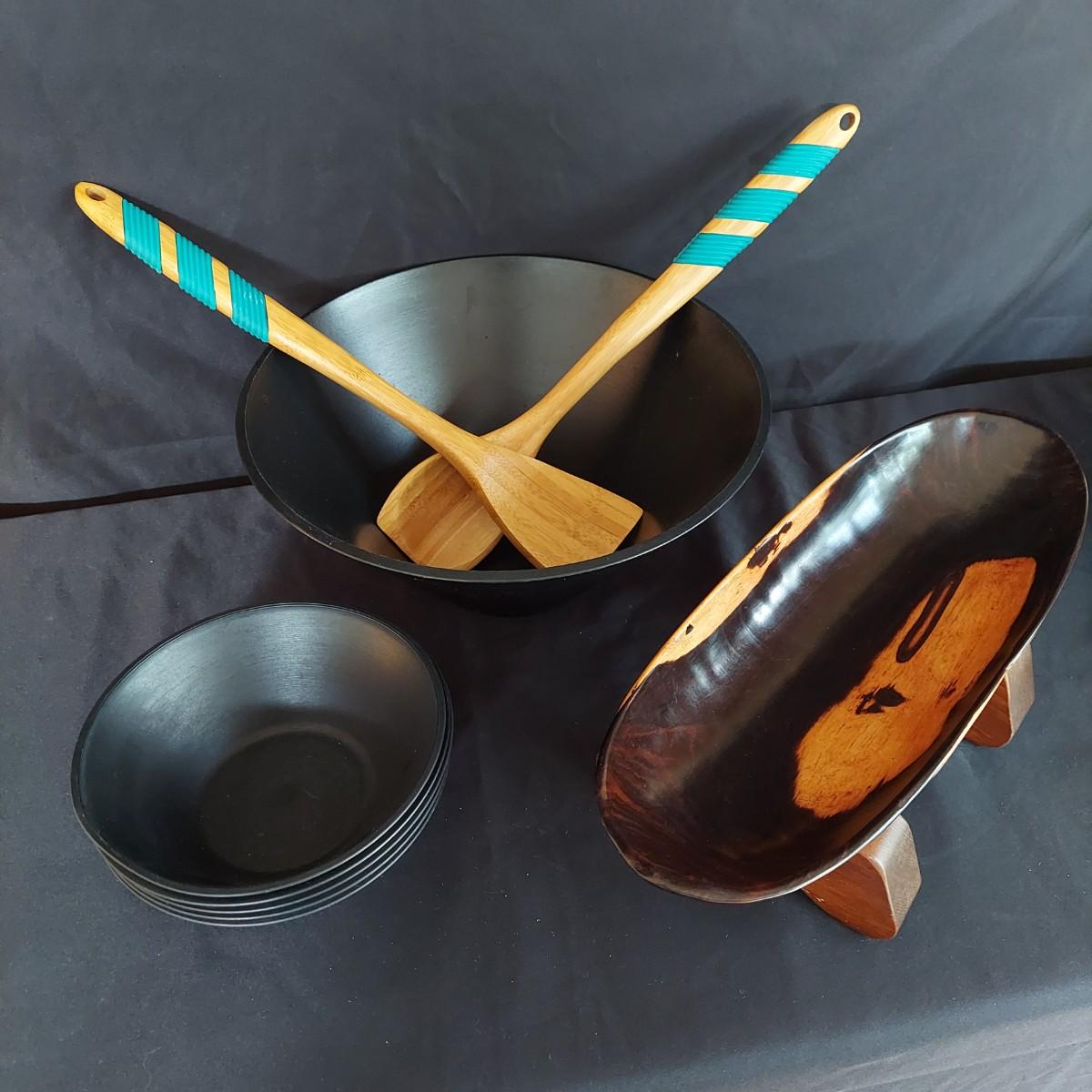 Several pieces of wooden serving bowls and utensils. Lot includes one large black serving bowl and five salad bowls by acca David Douglas. They appear to be the vintage plastic substance accalac. Also included are a large round wooden bowl that appears to be handmade carved and is signed on bottom, many wooden utensils and a wooden decorative floating oval shaped bowl. The large bowls are 10" across. Shipping available