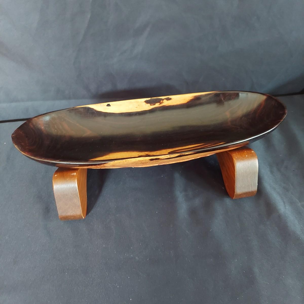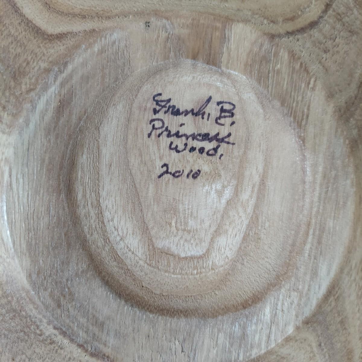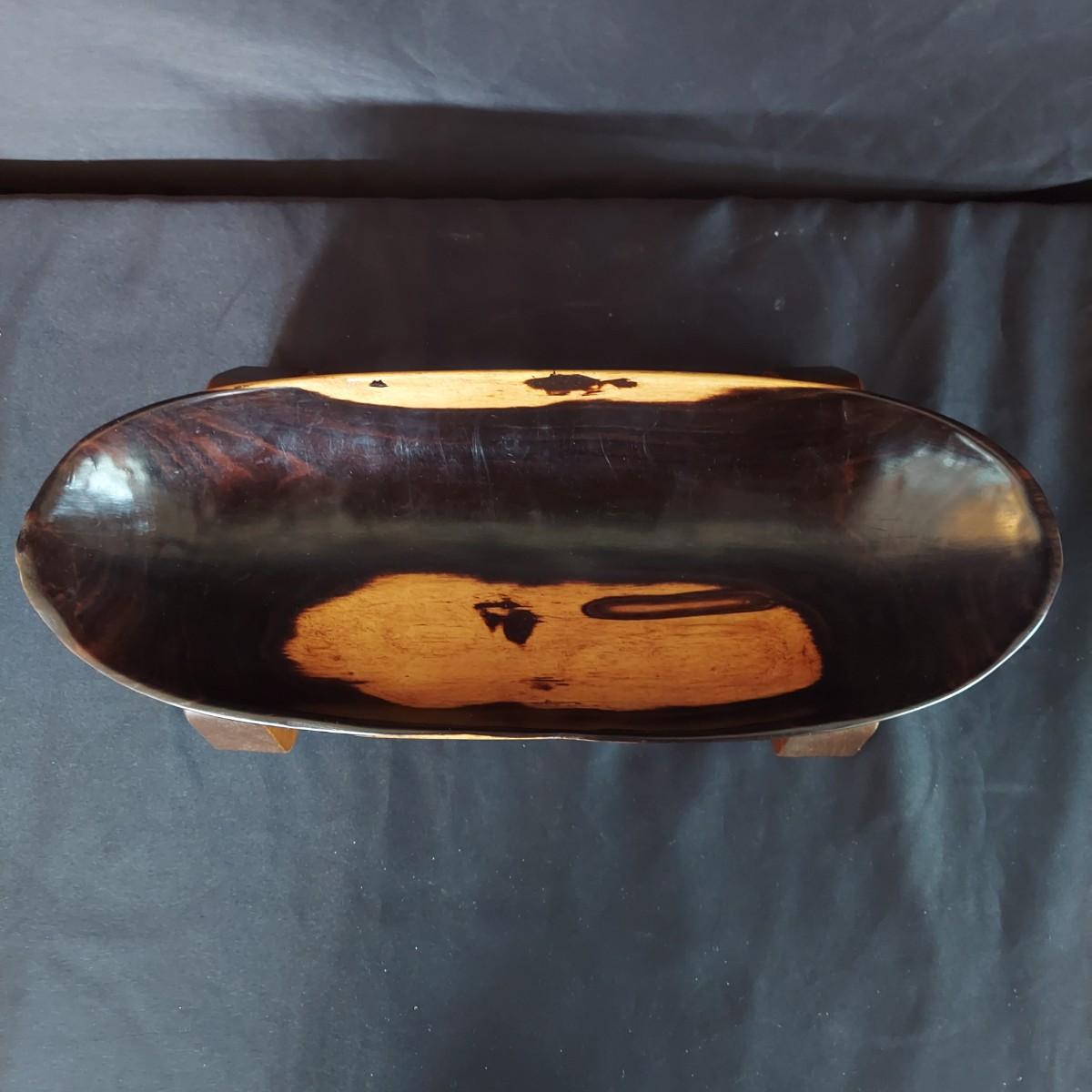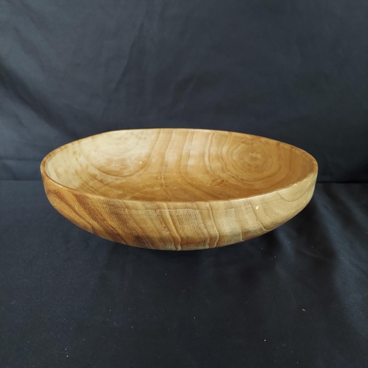 Several pieces of wooden serving bowls and utensils. Lot includes one large black serving bowl and five salad bowls by acca David Douglas. They appear to be the vintage plastic substance accalac. Also included are a large round wooden bowl that appears to be handmade carved and is signed on bottom, many wooden utensils and a wooden decorative floating oval shaped bowl. The large bowls are 10" across. Shipping available