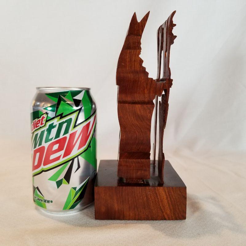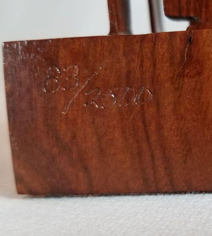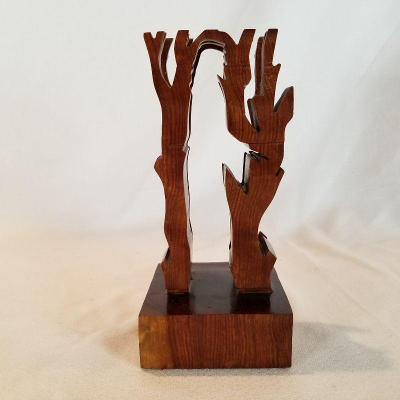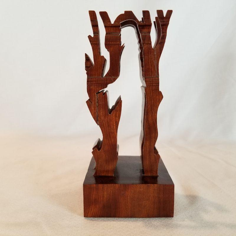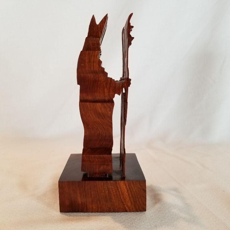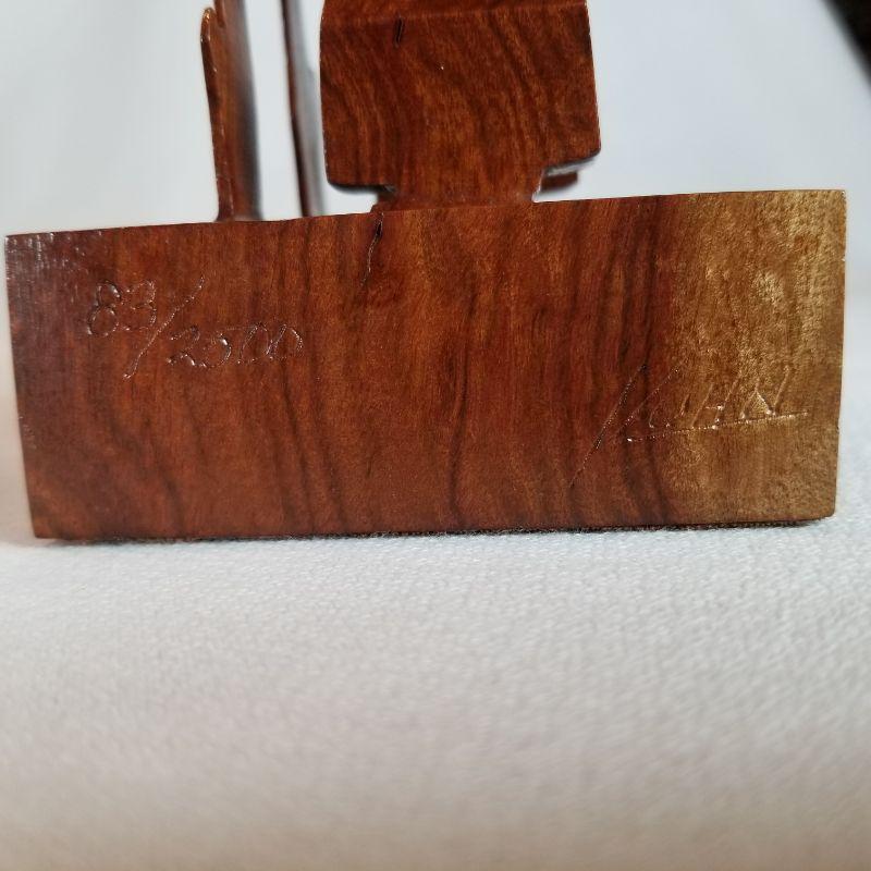 Wooden sculpture depicting both a Christ figure and a Bishop. Christ is in the empty space and the Bishop is in the wood. Signed by the artist - Kuhn - 83/2500. Made out of exotic wood. Has a few splits in the wood consistent with solid wood but nothing is broken and in very nice condition. This is a most unique sculpture.
