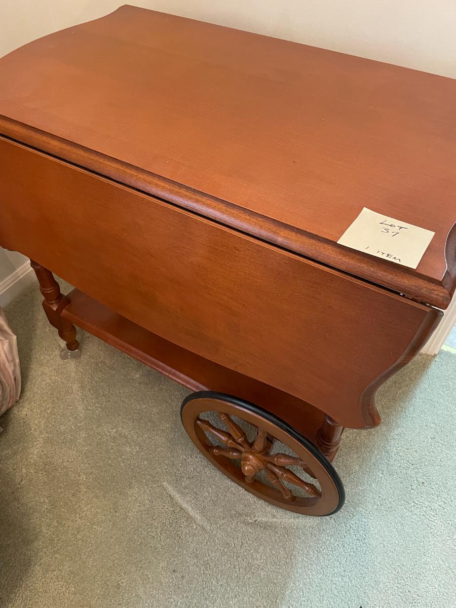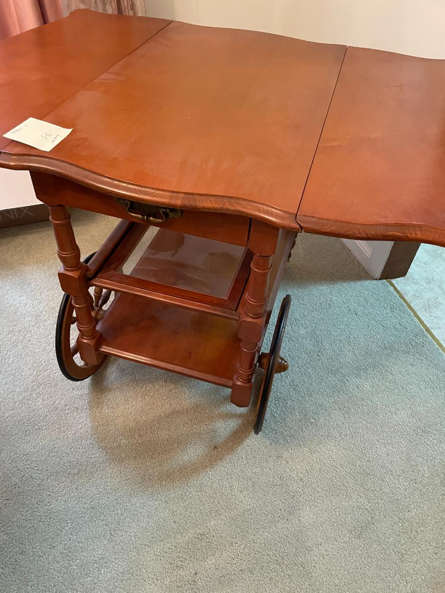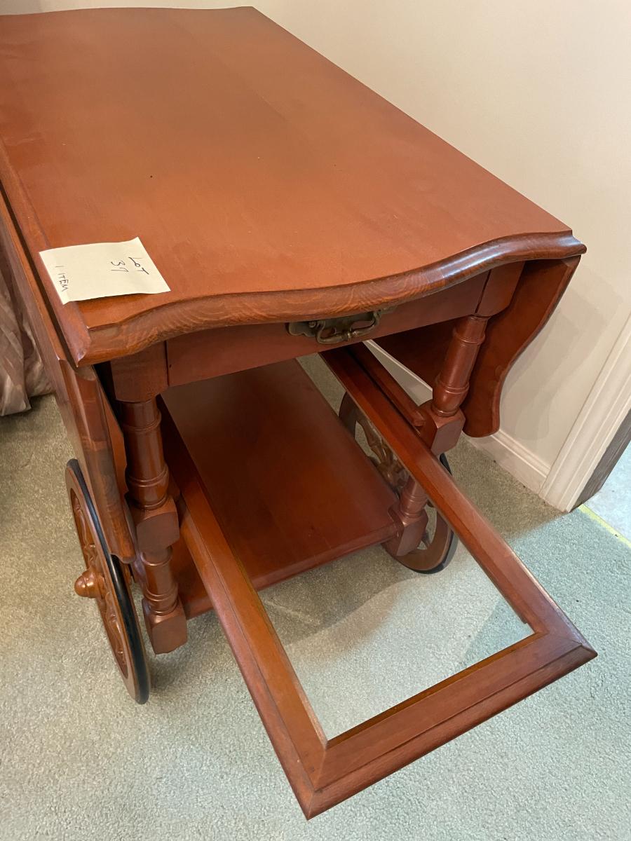 Drop Leaf Early American Wood Serving Cart with 1 drawer and a removal glass serving tray
