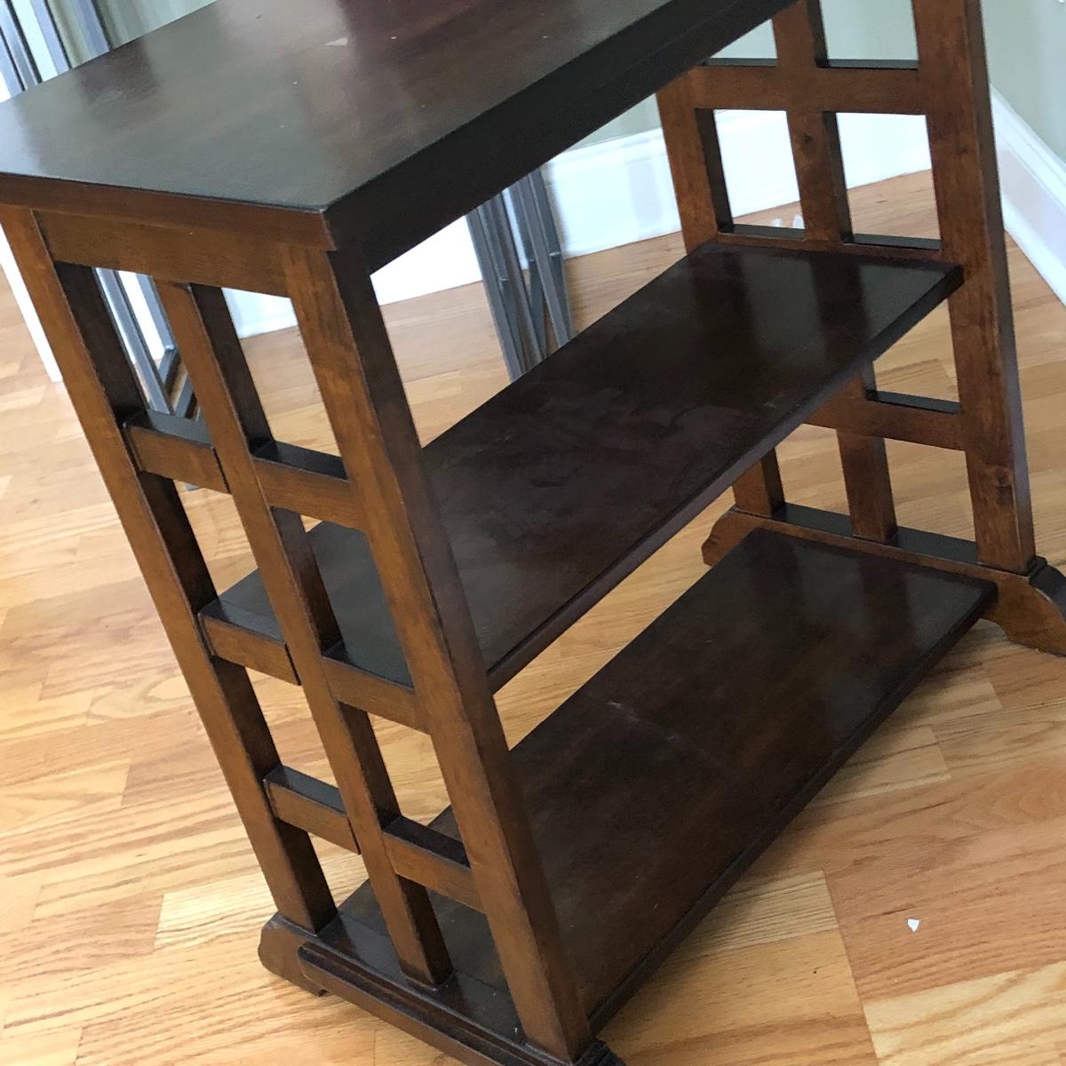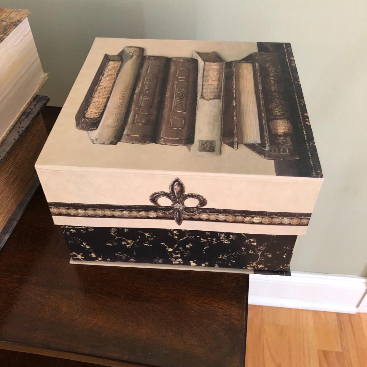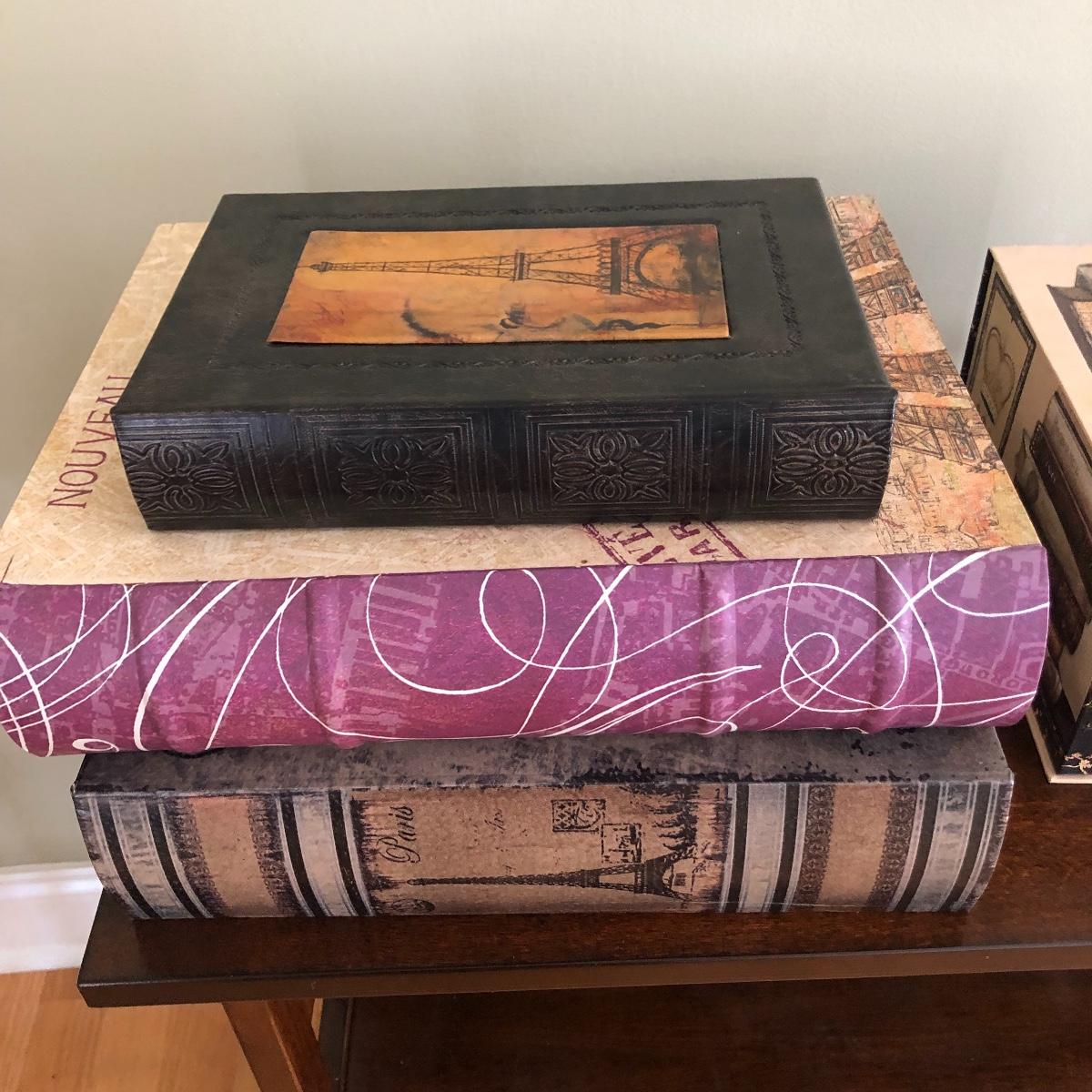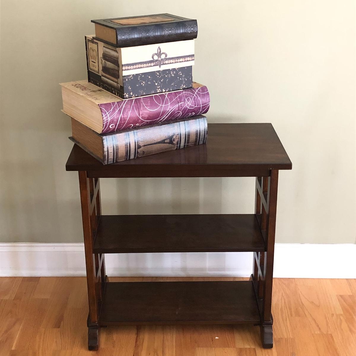 This small wooden shelf unit is in good condition and provides two shelves. Also included 4 handsome faux books that are storage boxes.