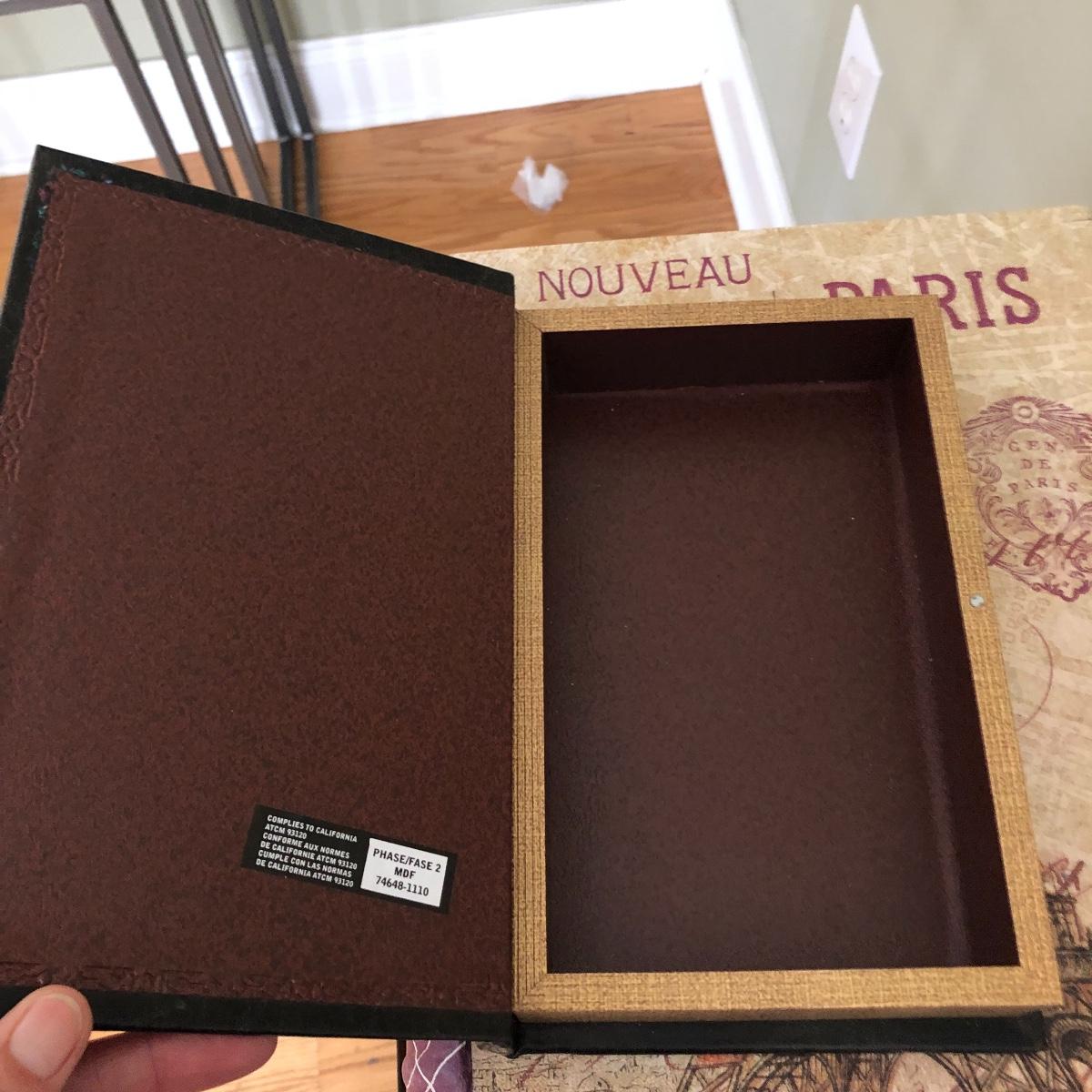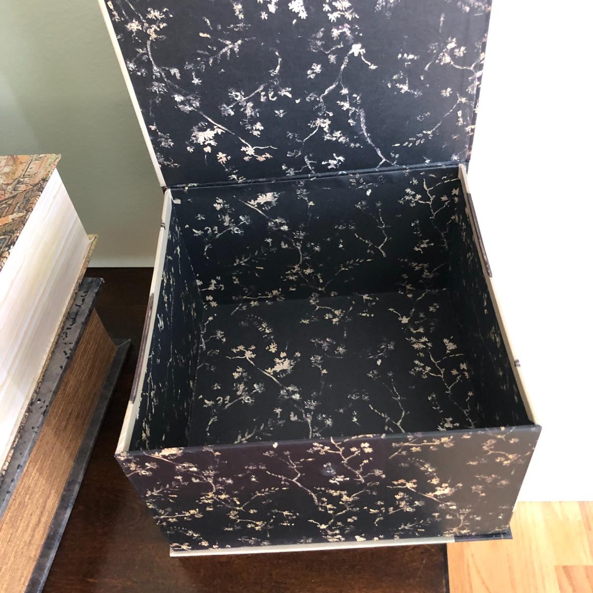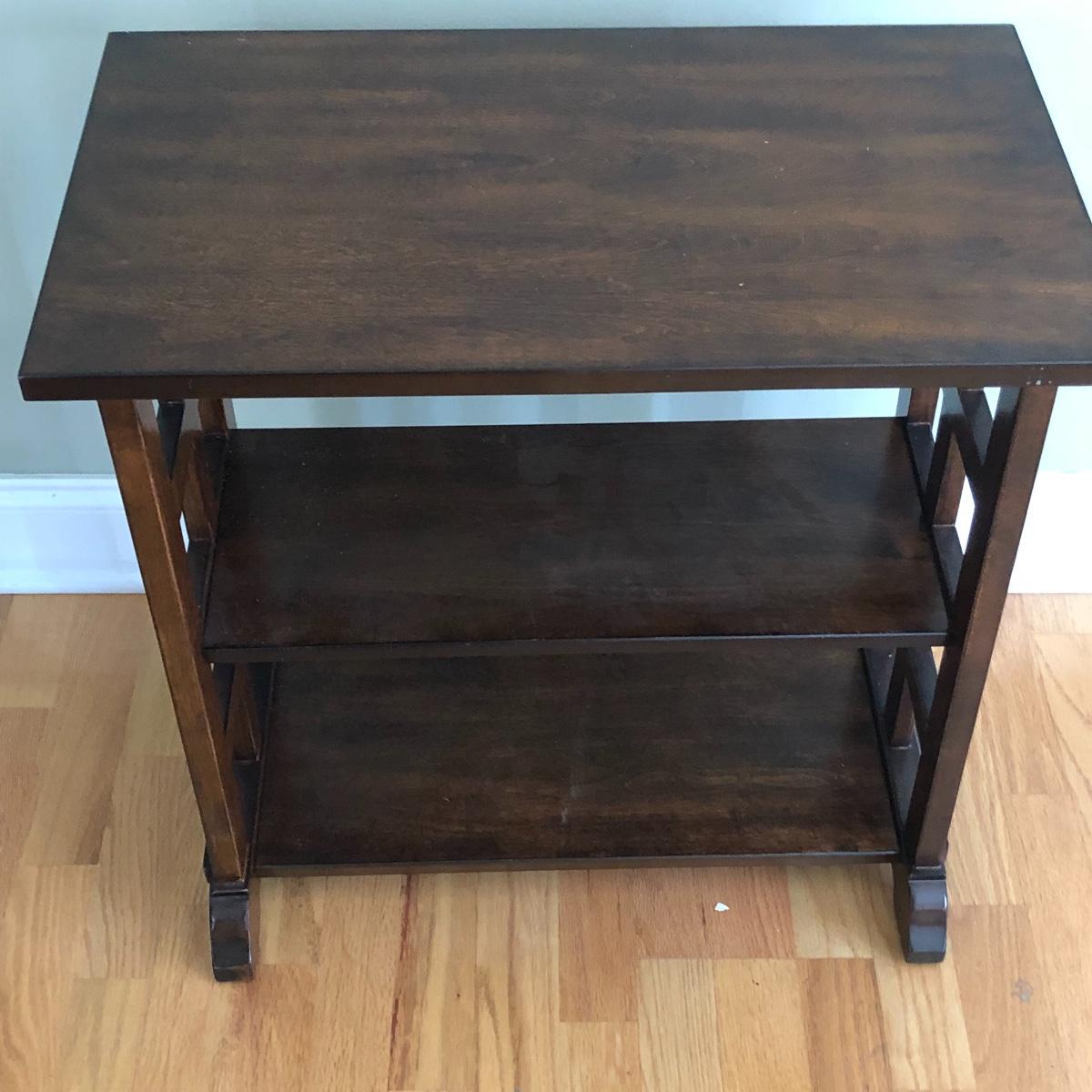 This small wooden shelf unit is in good condition and provides two shelves. Also included 4 handsome faux books that are storage boxes.