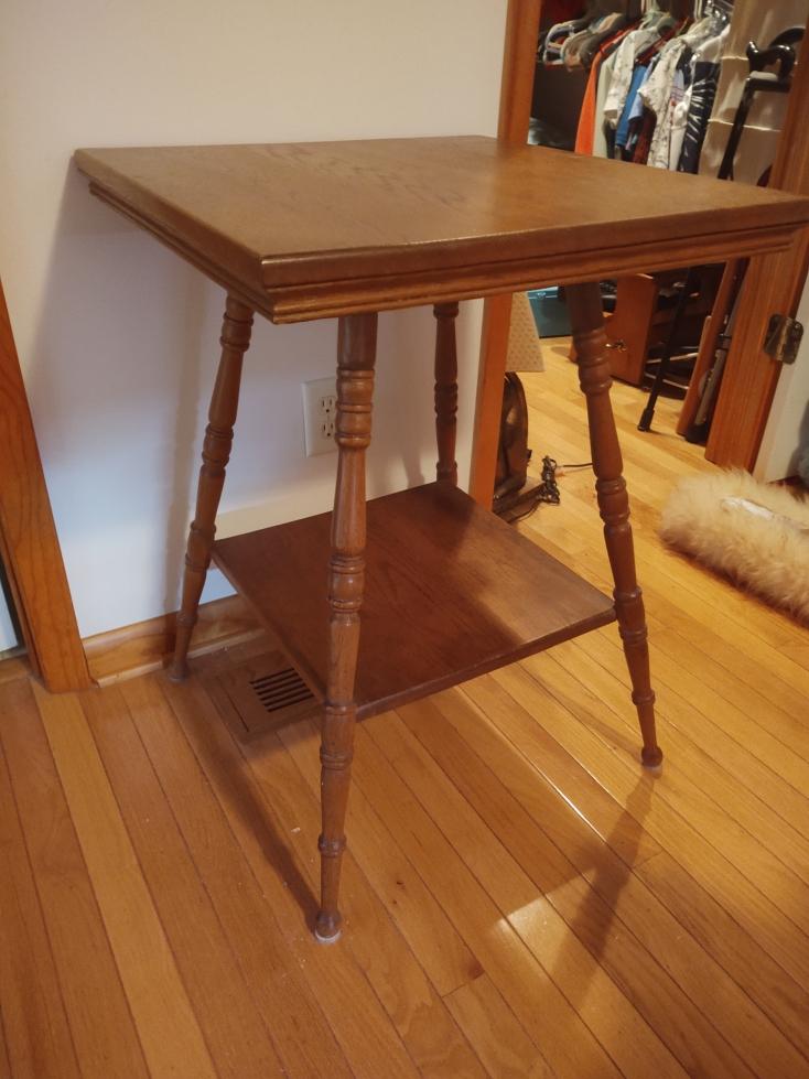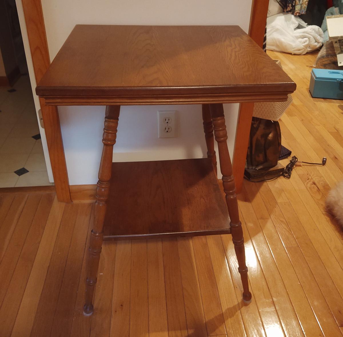 Side table has a lower platform for extra storage. Measures 22"x22"x29"