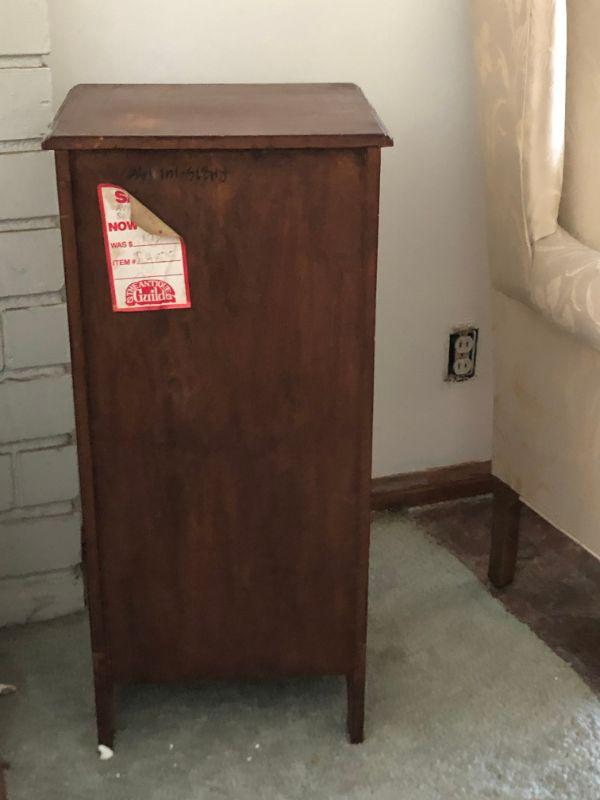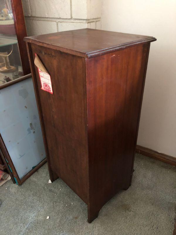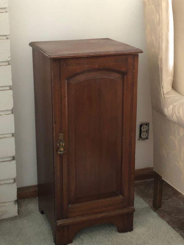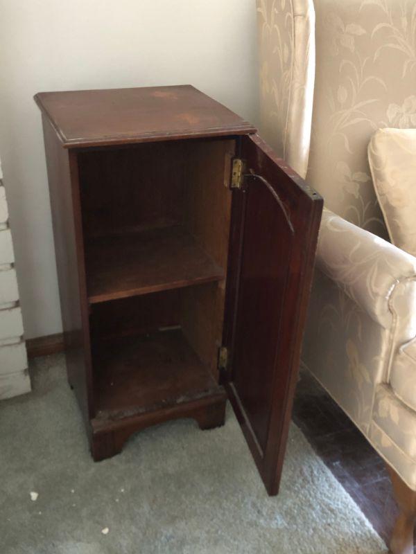 Single shelf wood side table cabinet. Good as is or as a project. 15" x 15" x 32"