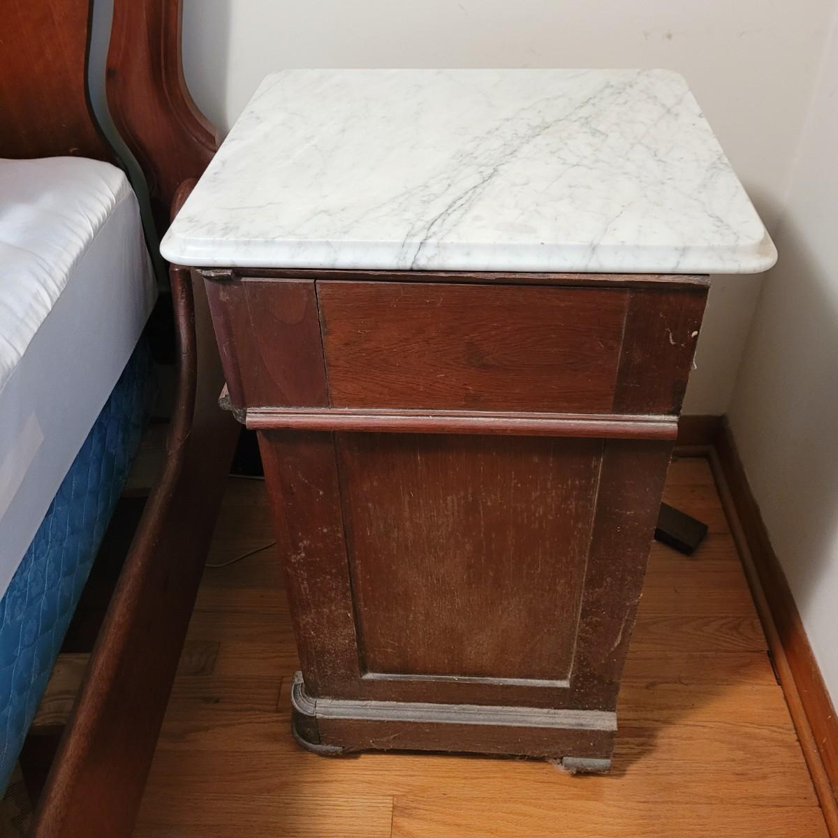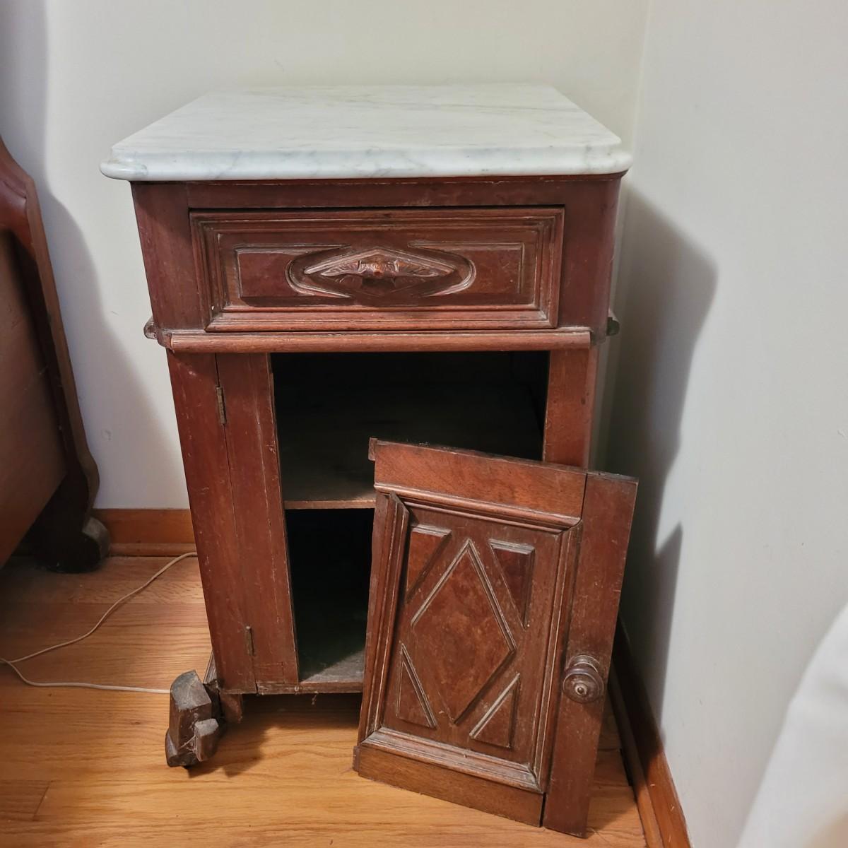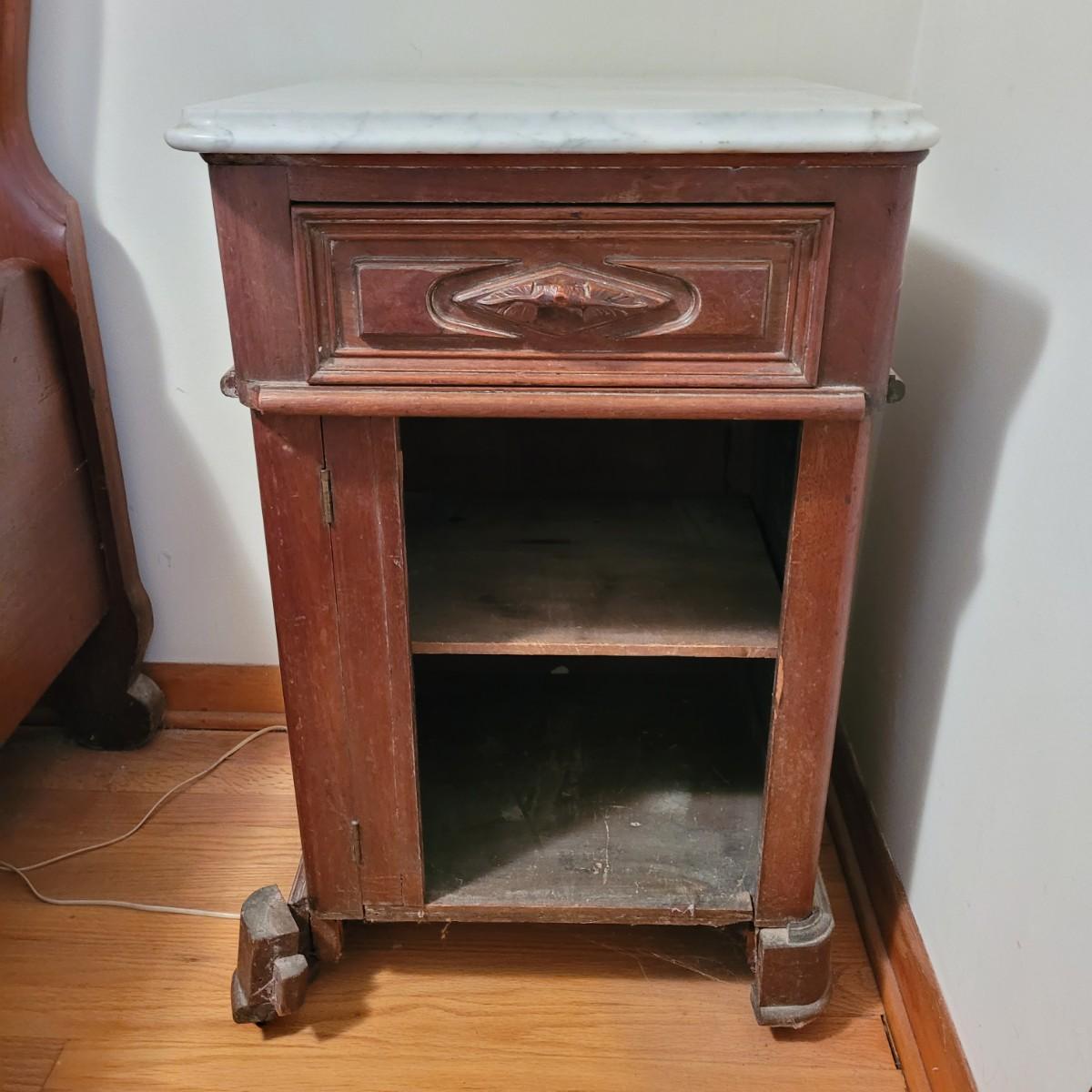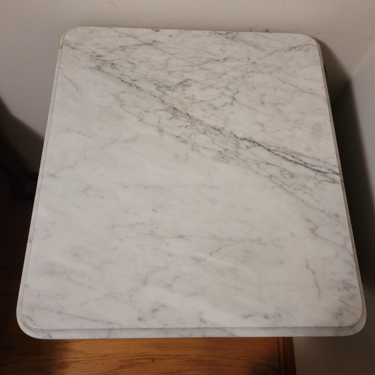 Wood side table with marble top. The wooden base is a great candidate to be refurbished. It has some loose pieces and the door is broken. Marble top not attached. The marble top is in very good condition. The table measures approximately 18.5"L x 20.5"W x 30.5"H. Local pickup only.