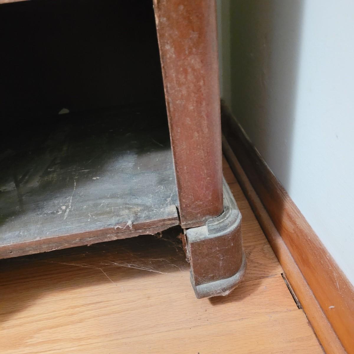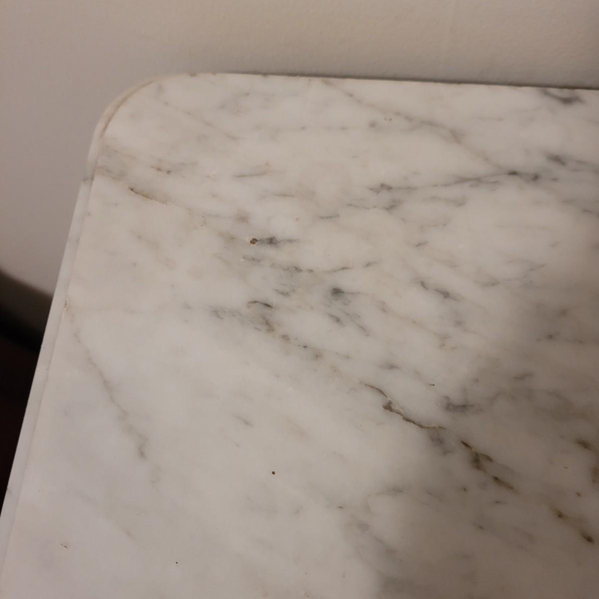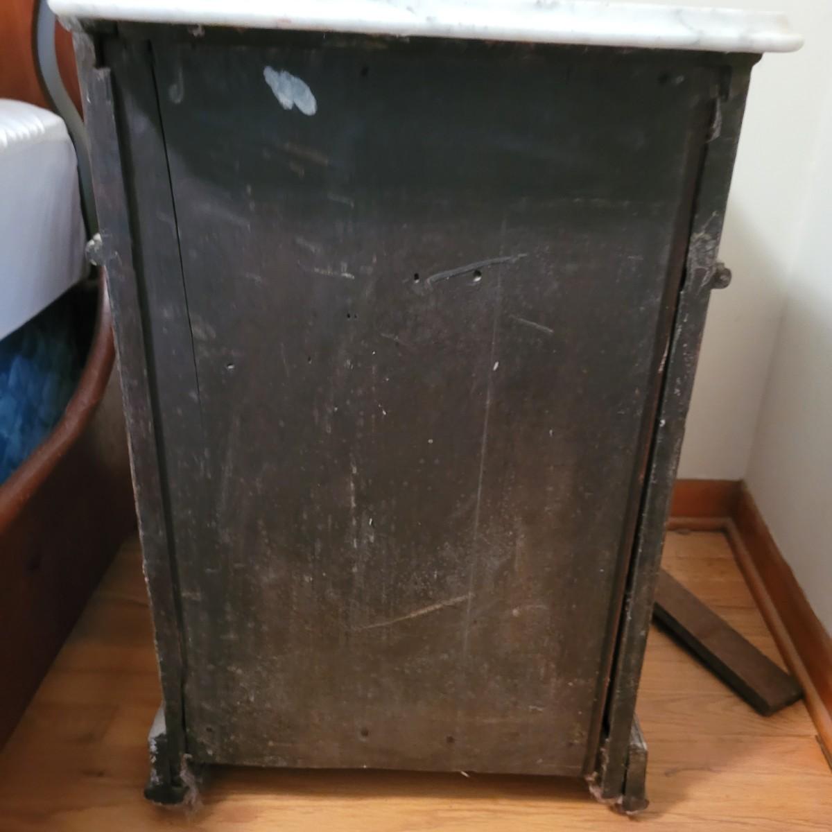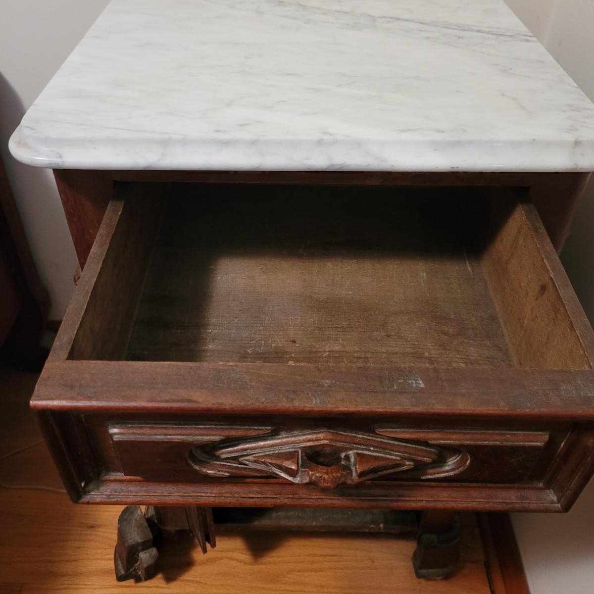 Wood side table with marble top. The wooden base is a great candidate to be refurbished. It has some loose pieces and the door is broken. Marble top not attached. The marble top is in very good condition. The table measures approximately 18.5"L x 20.5"W x 30.5"H. Local pickup only.
