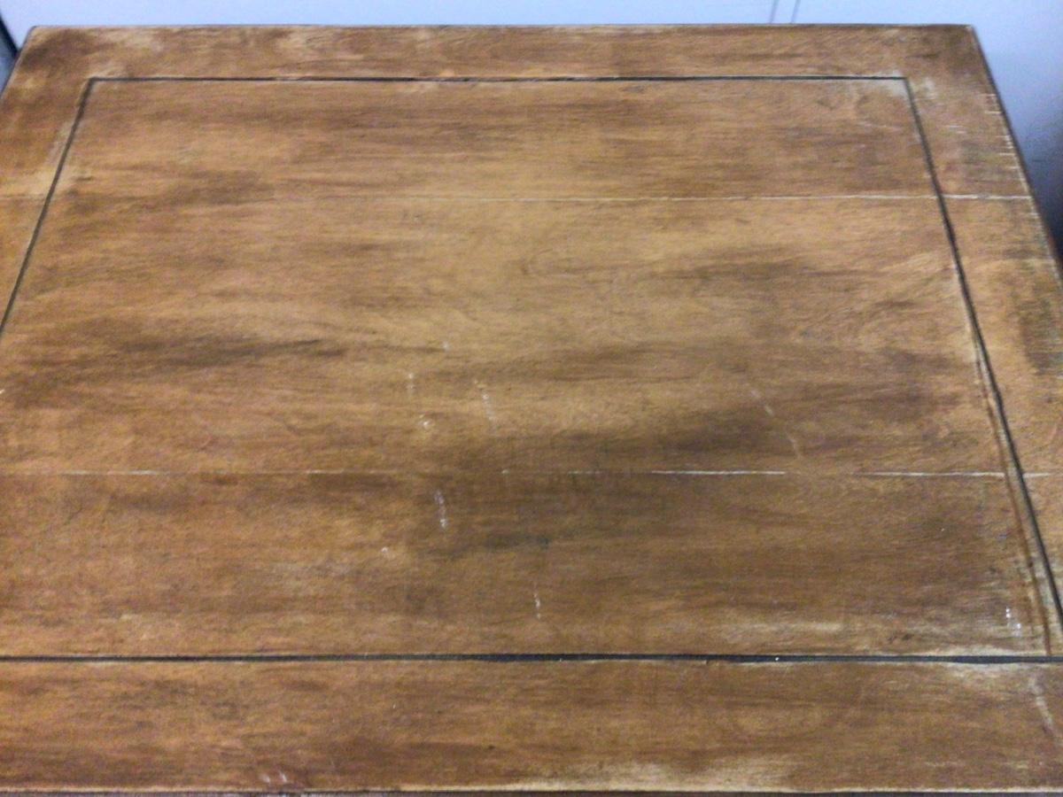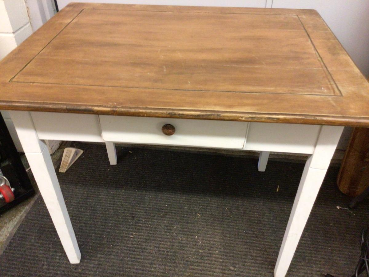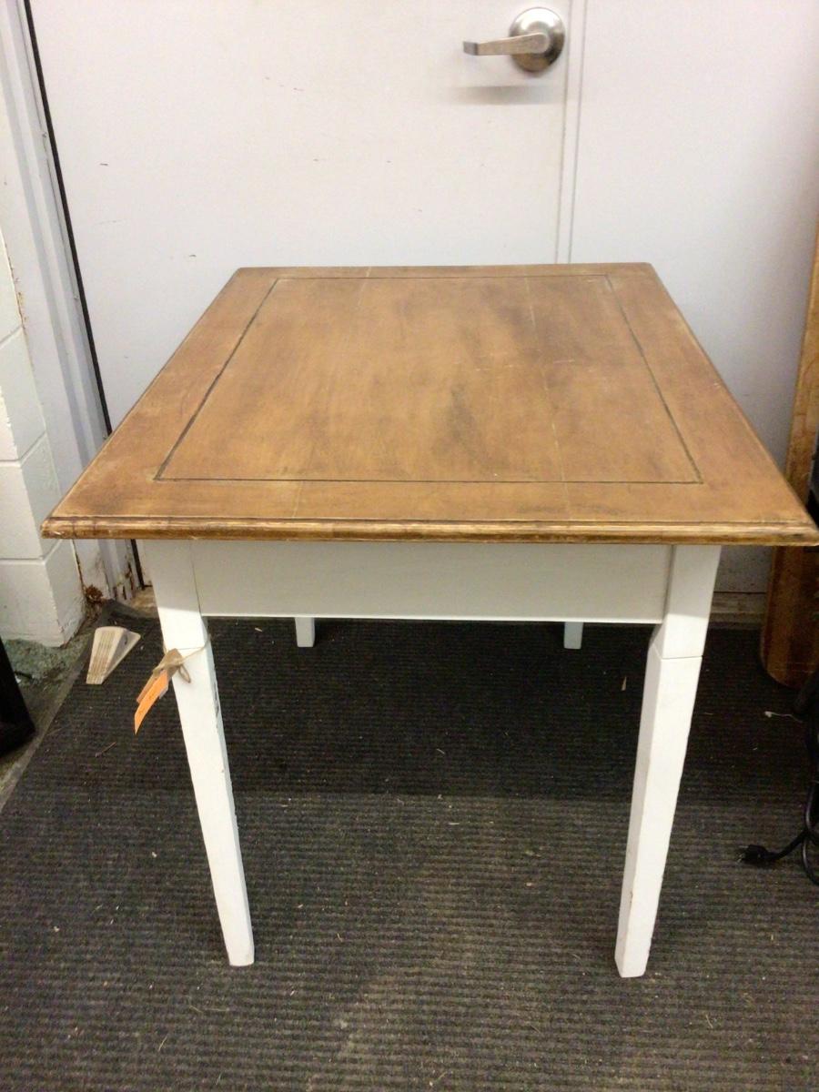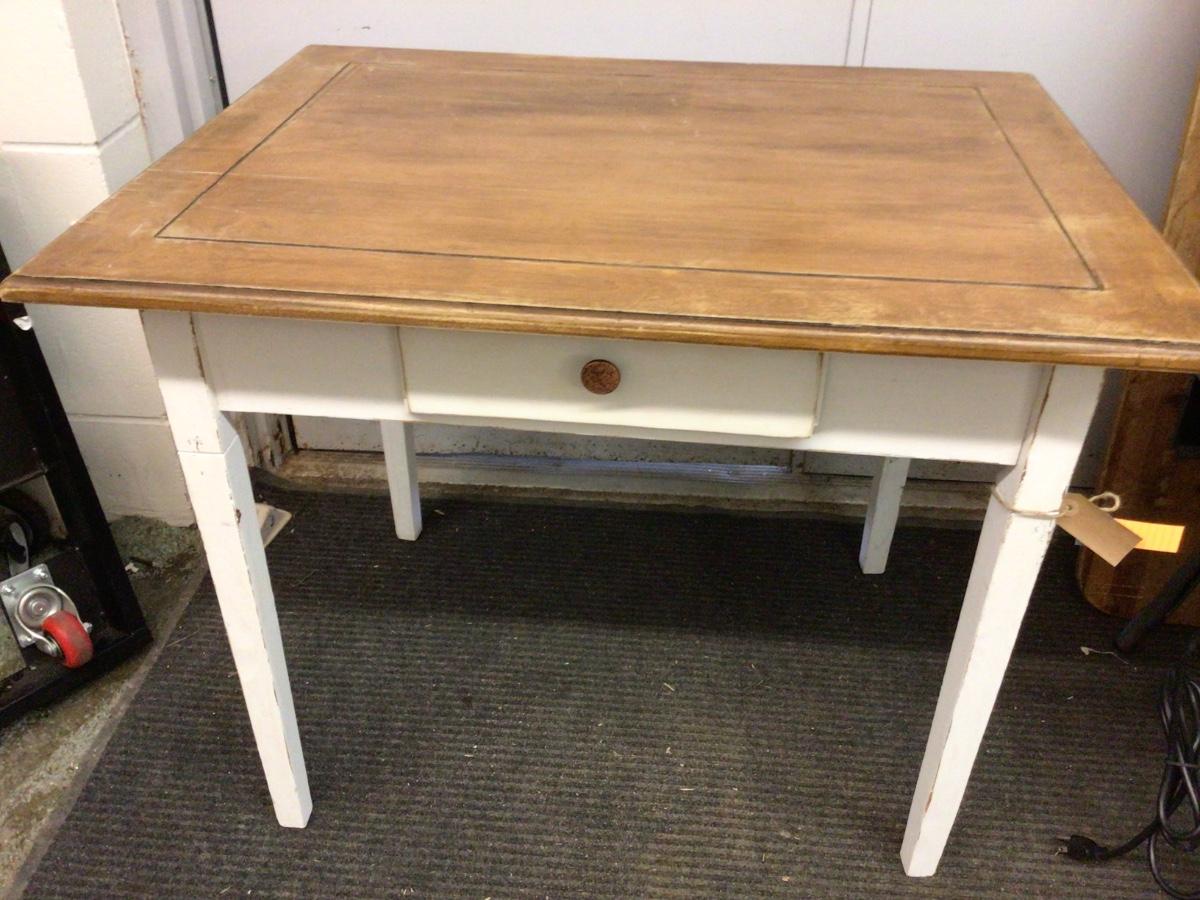 This great table has wood colored top with two drawers one on each side. The legs and base is painted white. Very nice.