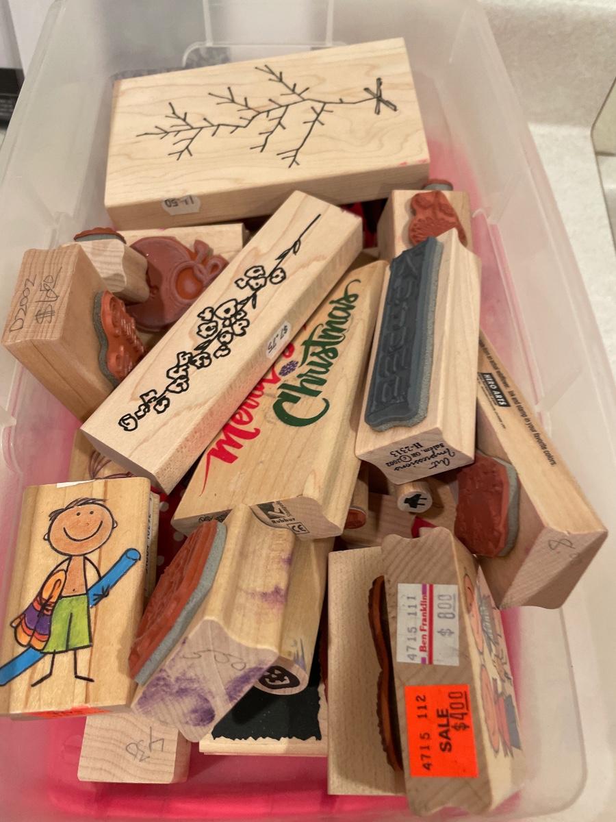 Wood stamps, emboss and plastic containers