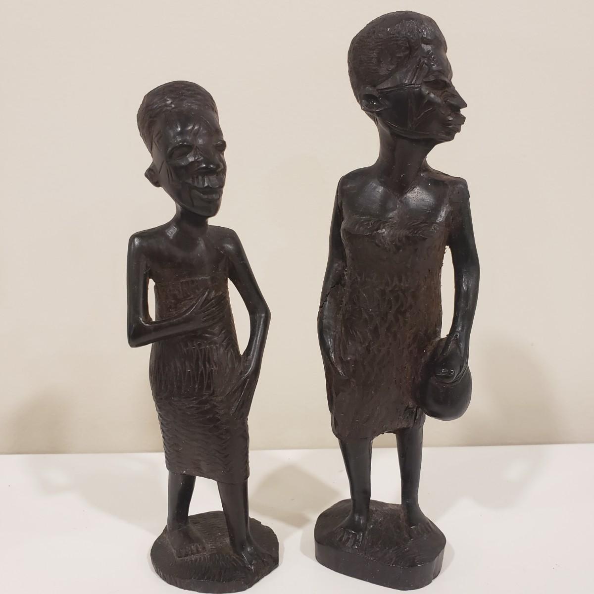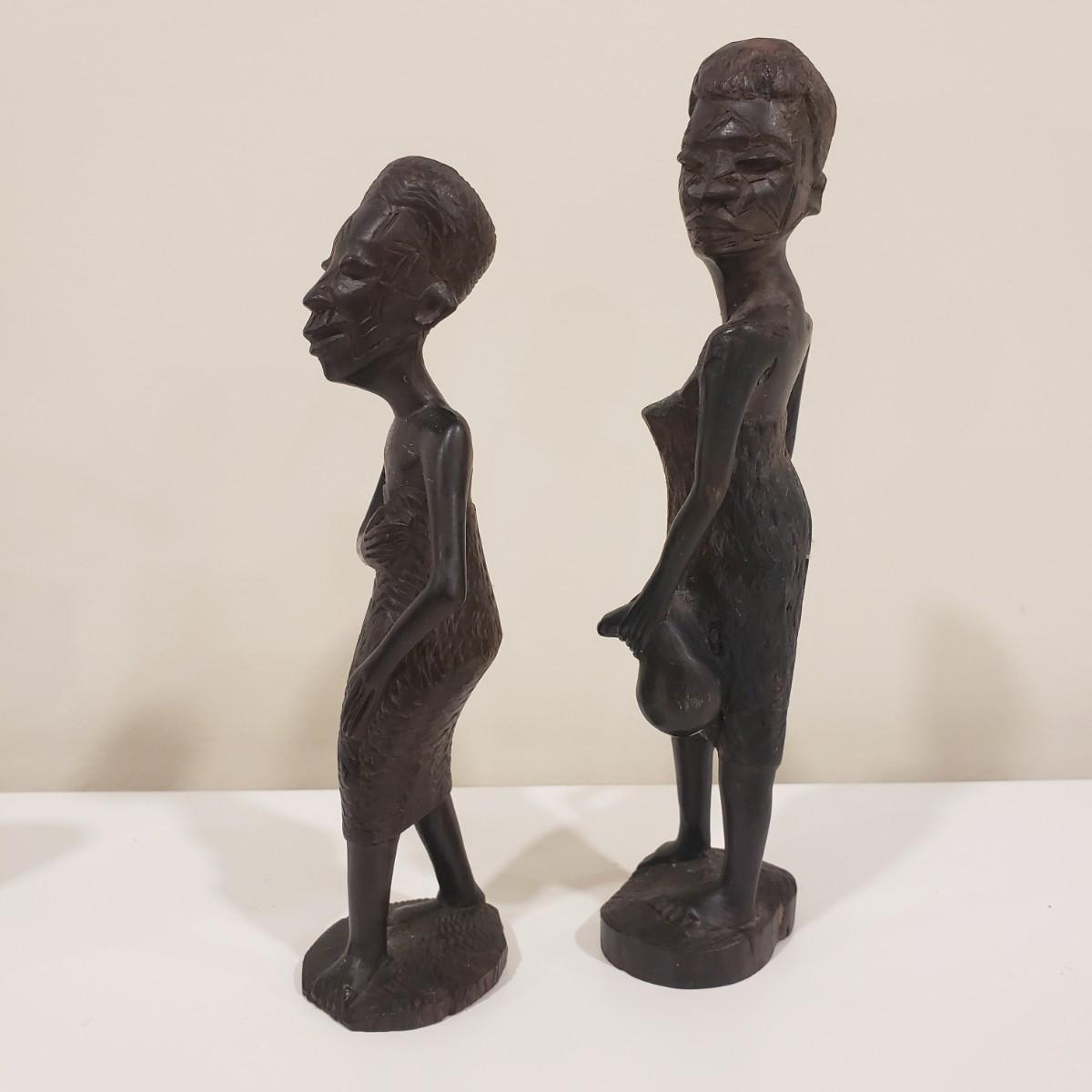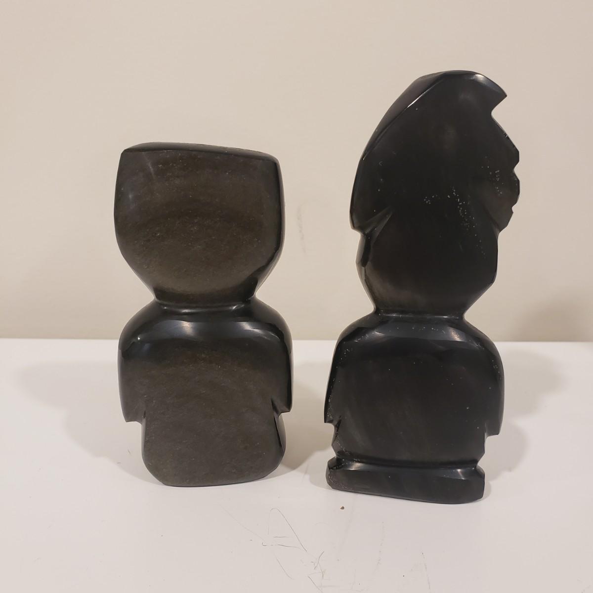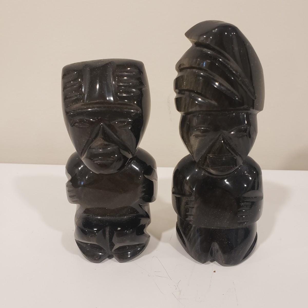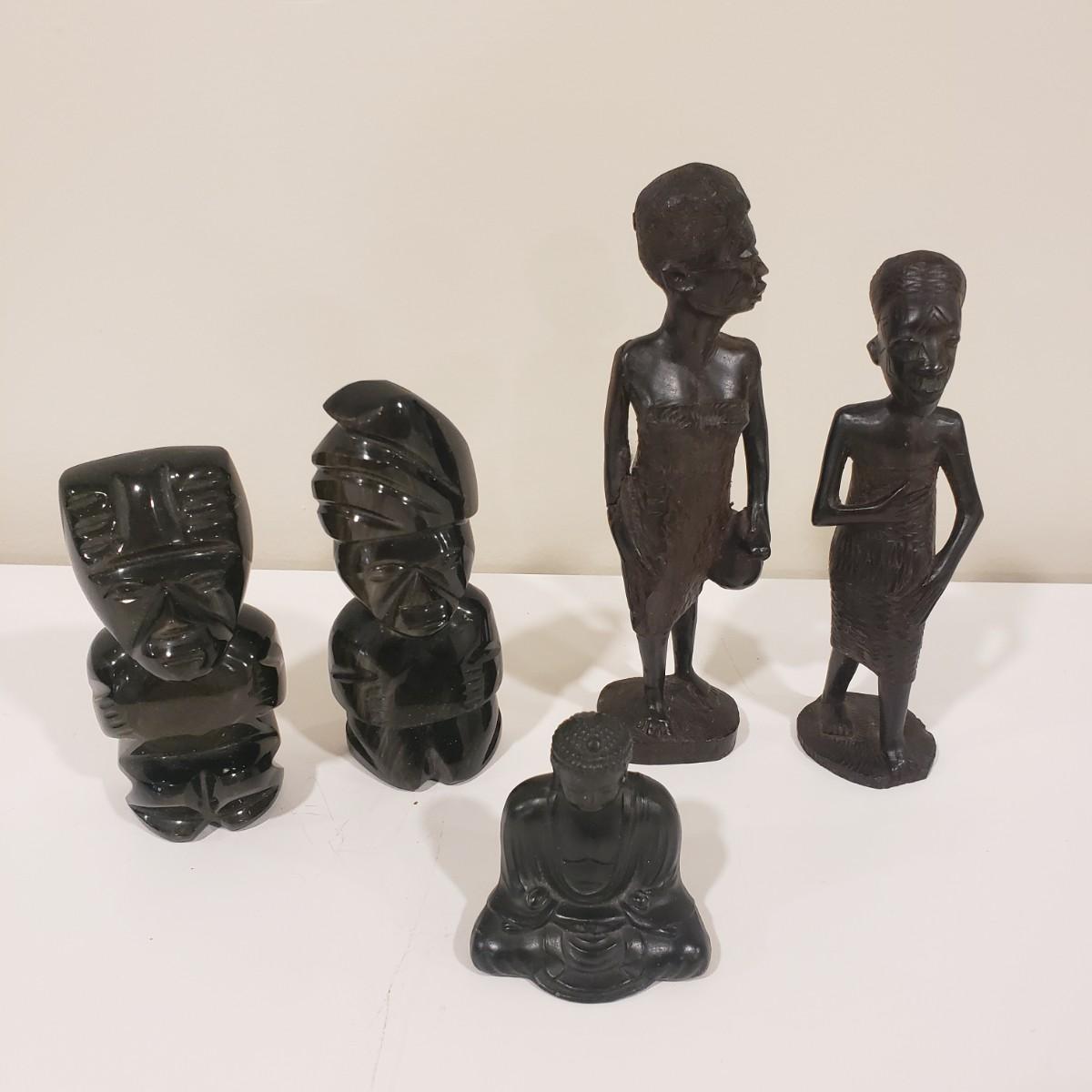 This lot features three different figurines from around the world. The stone carved couple are heavy to the touch. The stone has a metallic shimmer when the light hits it right. The next pair are hand carved wood. The tallest figurine measures 2" x 7"H. The Budda figurine is made of metal and has inscriptions on the bottom. There does not appear to be any blemishes.