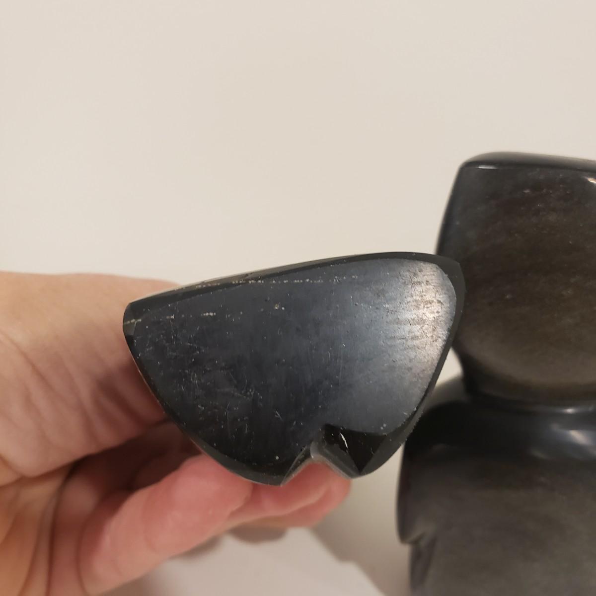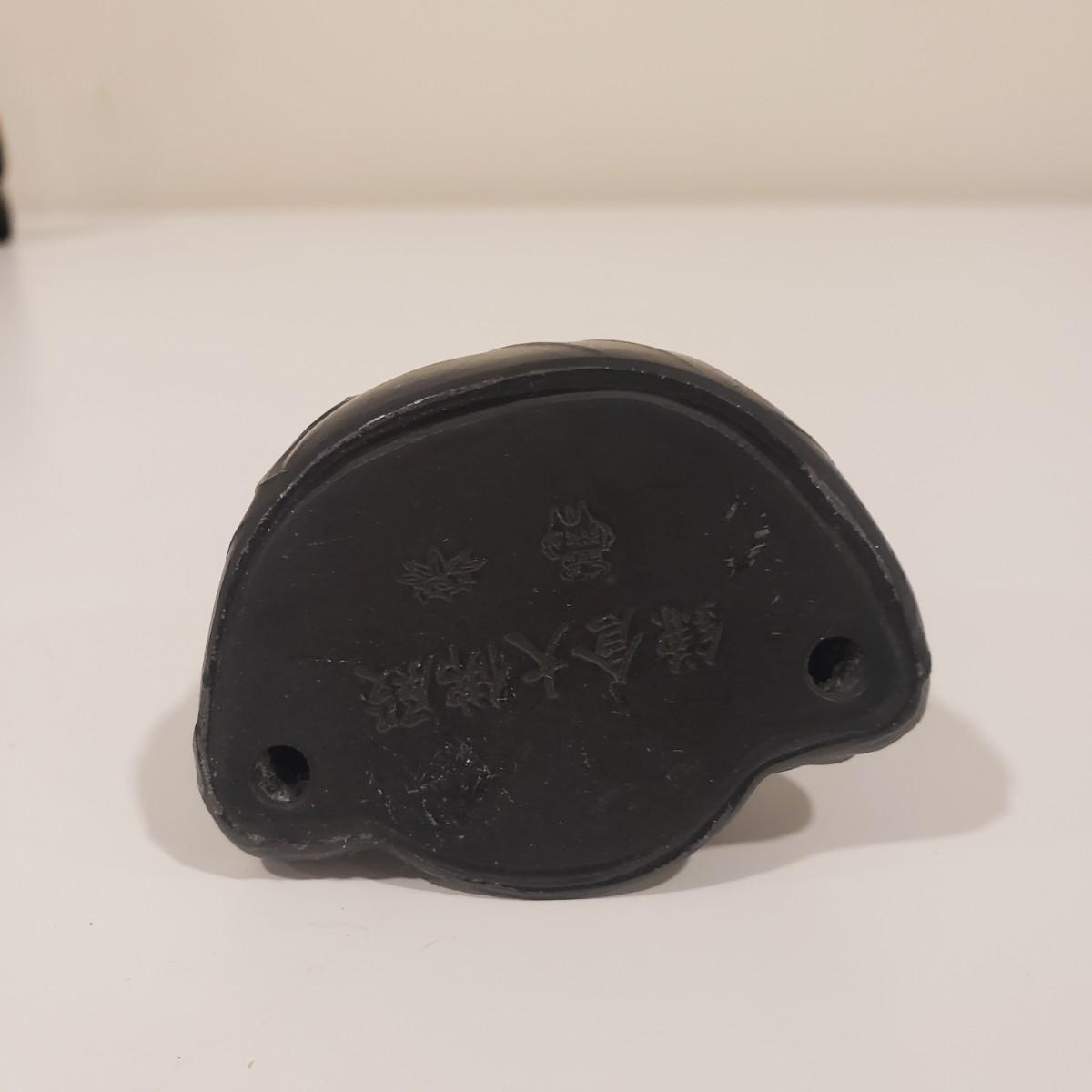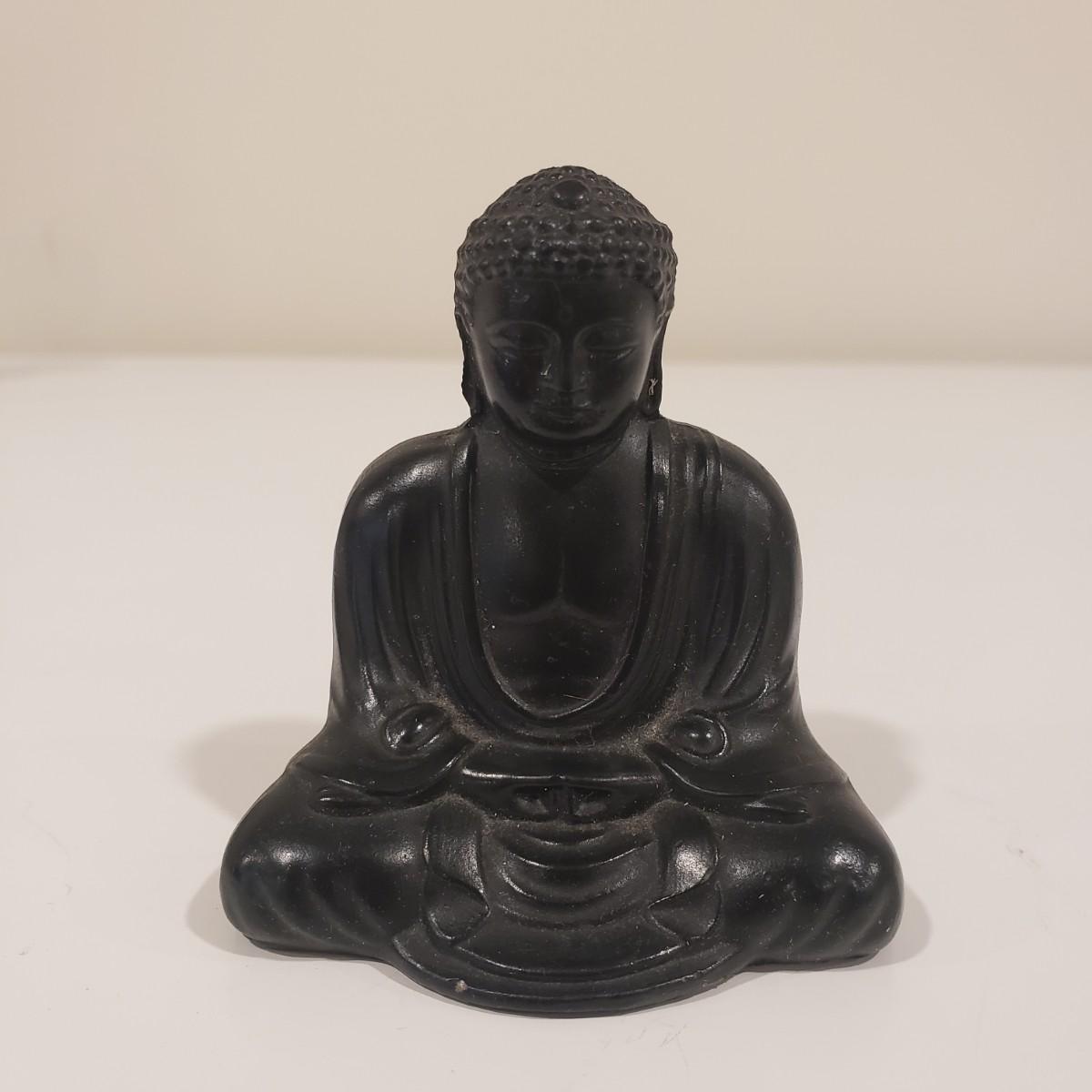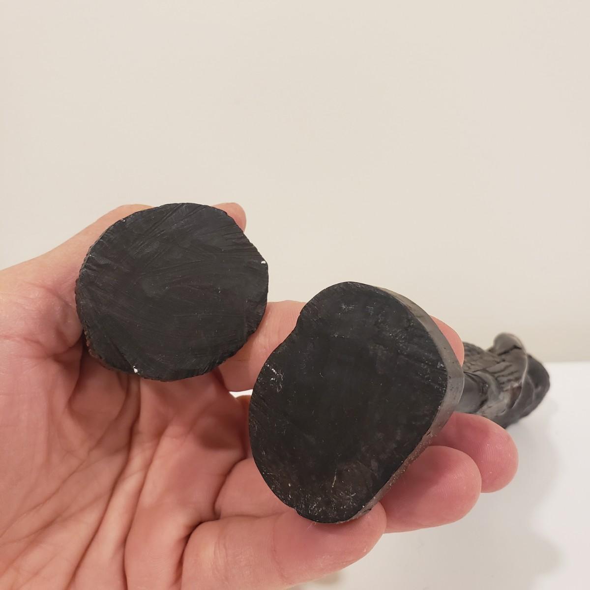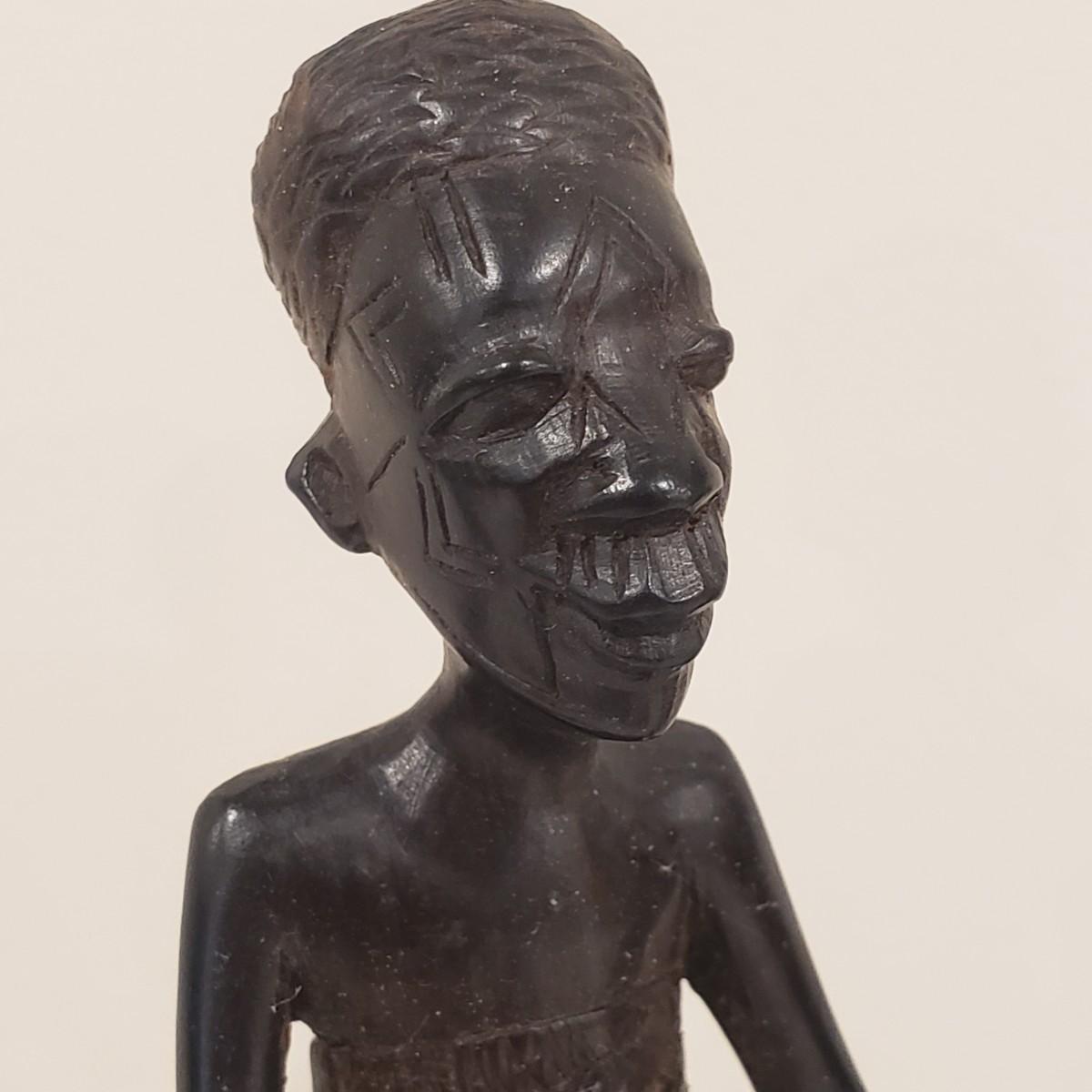 This lot features three different figurines from around the world. The stone carved couple are heavy to the touch. The stone has a metallic shimmer when the light hits it right. The next pair are hand carved wood. The tallest figurine measures 2" x 7"H. The Budda figurine is made of metal and has inscriptions on the bottom. There does not appear to be any blemishes.