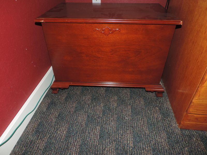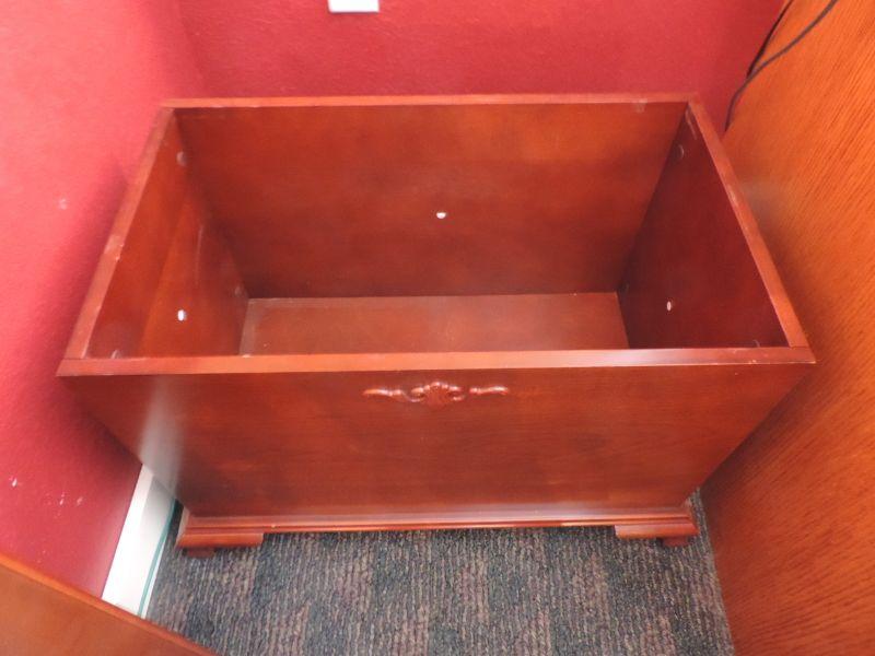MADE OF WOOD AND STAINED NICELY, LID REMOVES FOR STORAGE INSIDE
