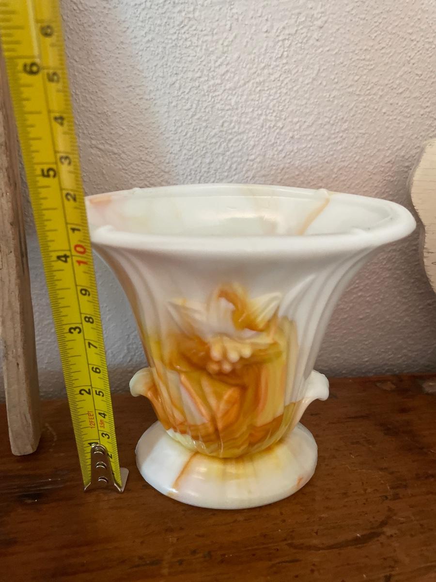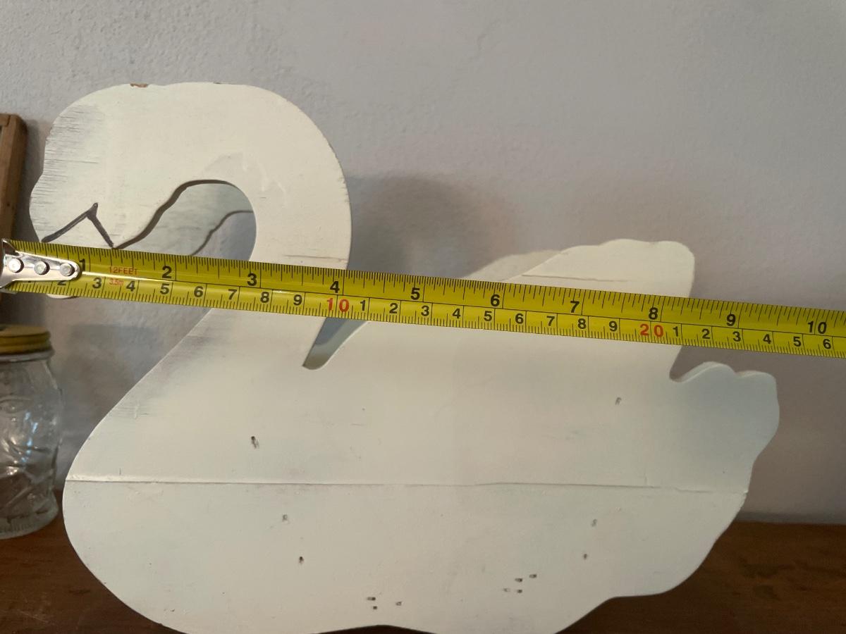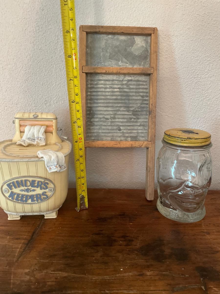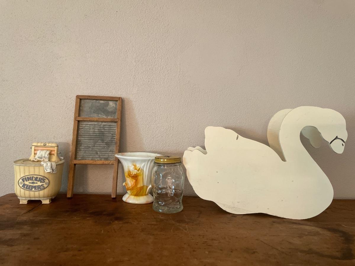 Wood swan, 2 coin banks, small wash board and vase