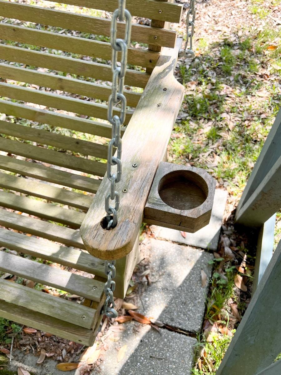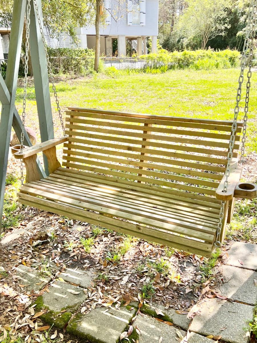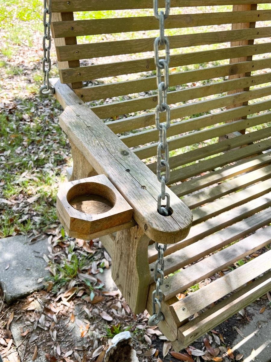 Includes wood swing & chains ~ Has been outside under an oak tree ~ Sturdy, I have enjoyed swinging in it myself :) ~ Including cup holders swing = 24” H x 65” W x 25” D