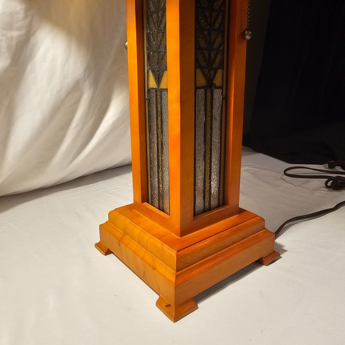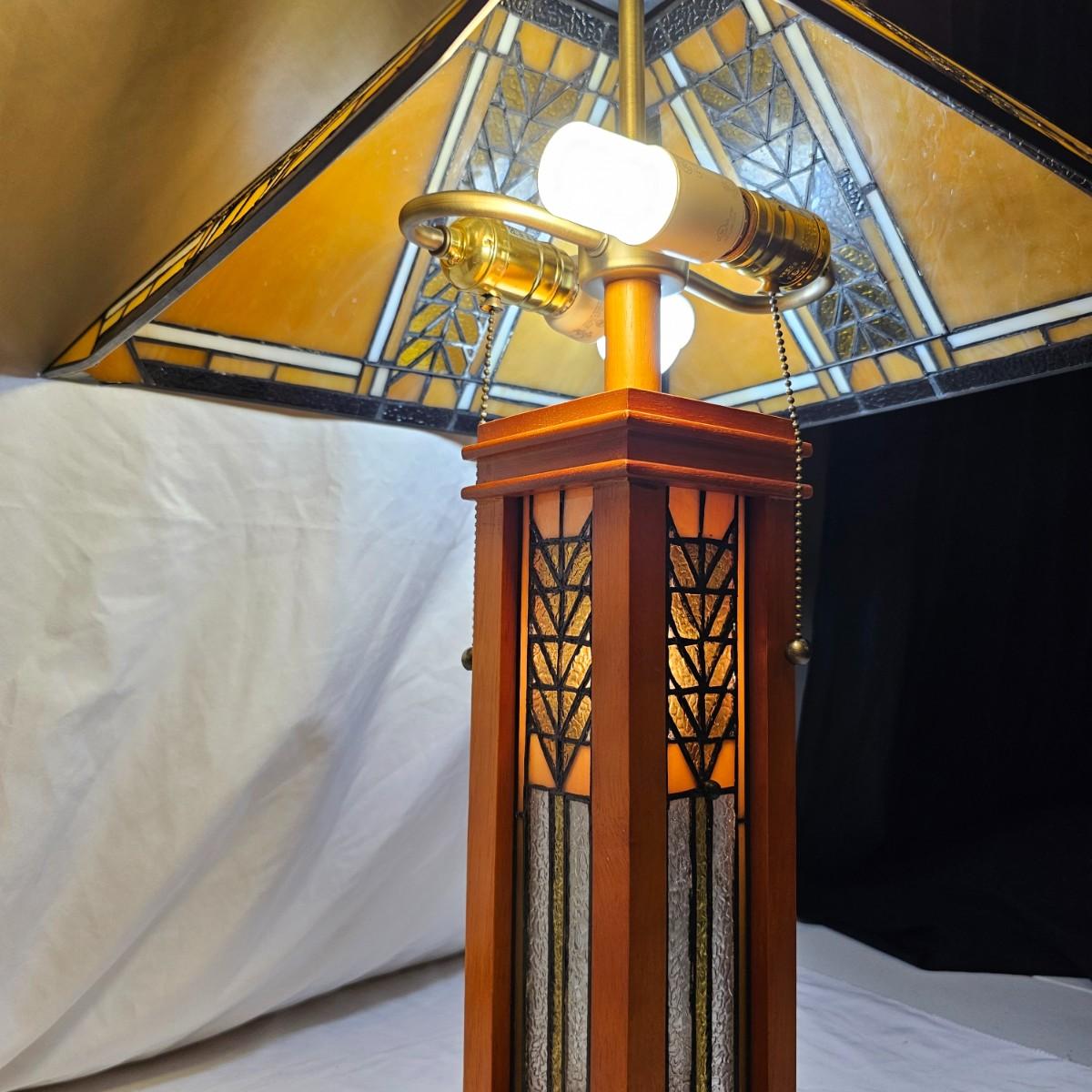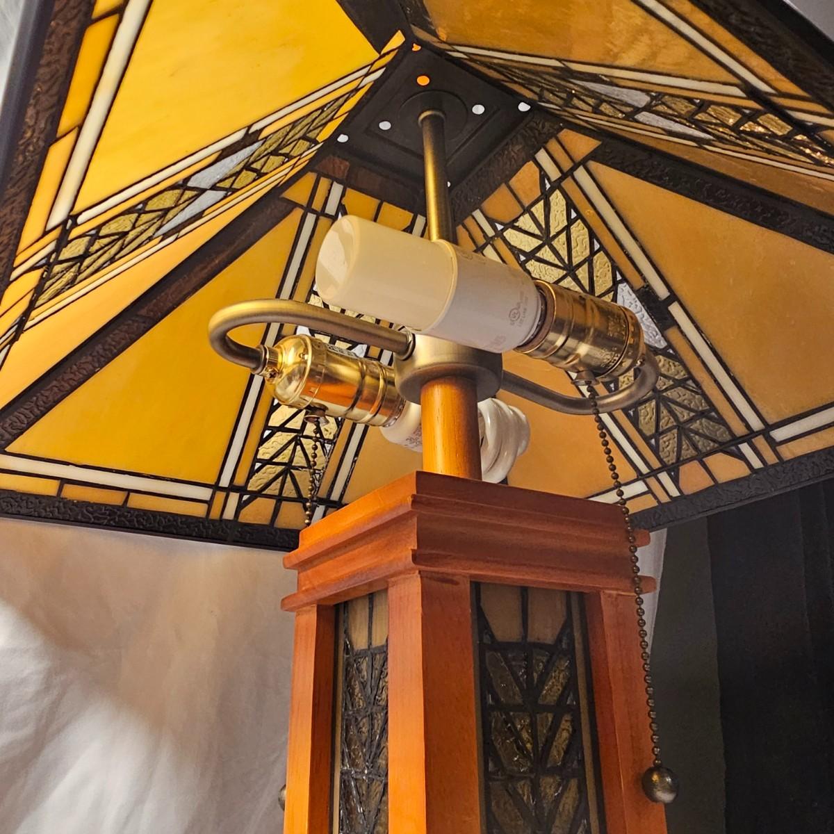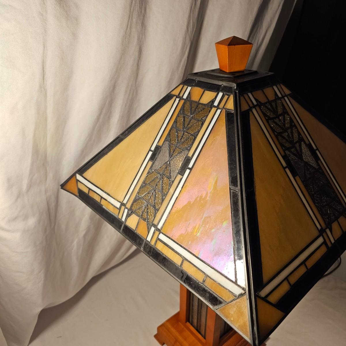 Striking table lamp with stained glass insert panels in column and a stained glass shade. Two individual bulbs under the shade and a small light source inside the column, all controlled separately. Lamp measures 16" x 16" x 25.5"H. Shade has small crack on one side and one edge is bent slightly. See photos for details. Local pickup only.