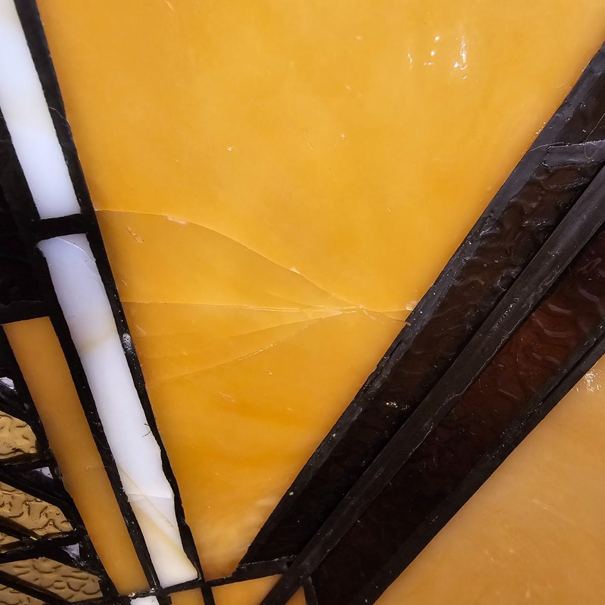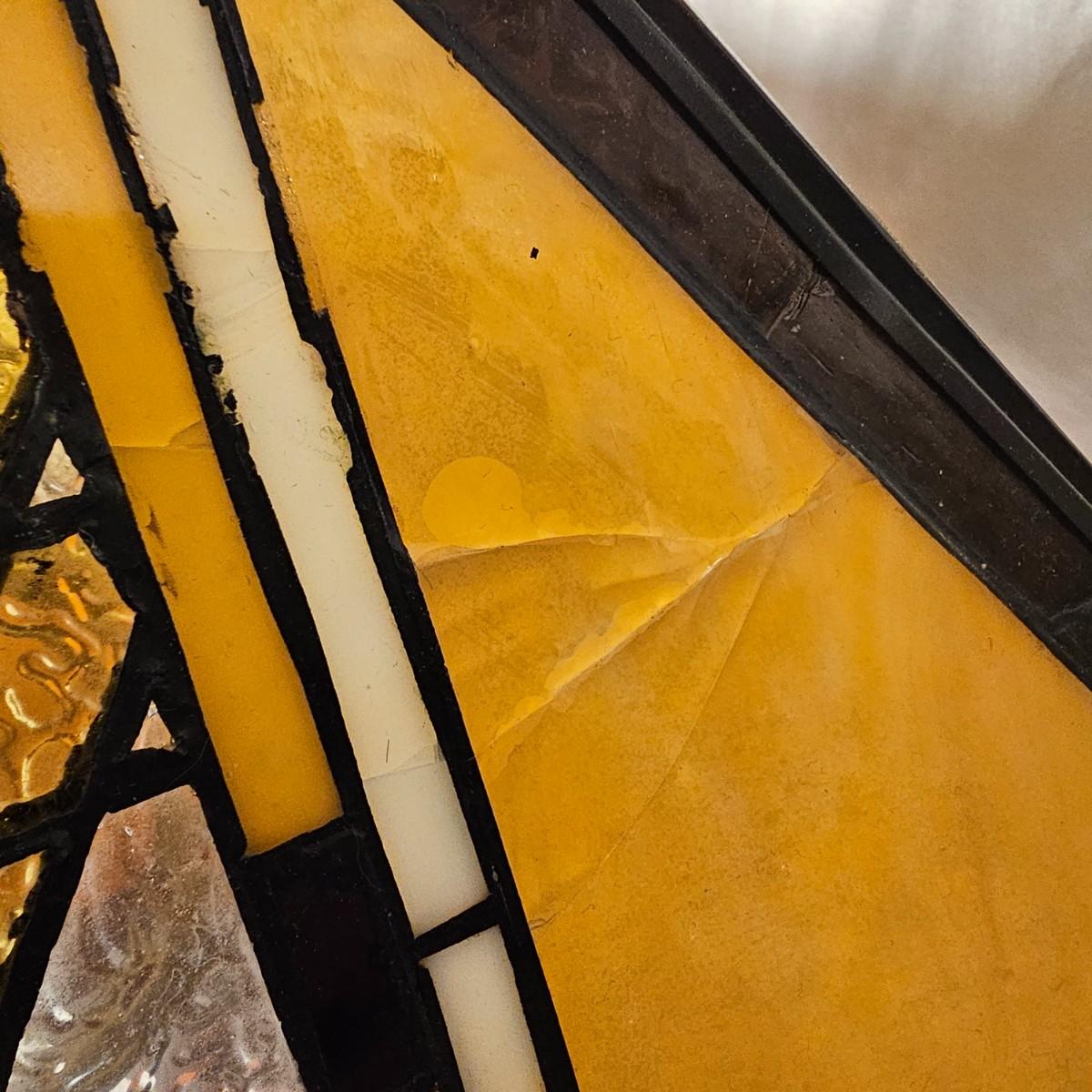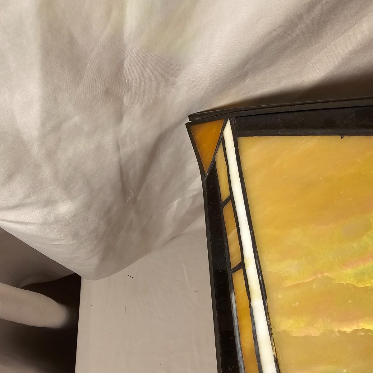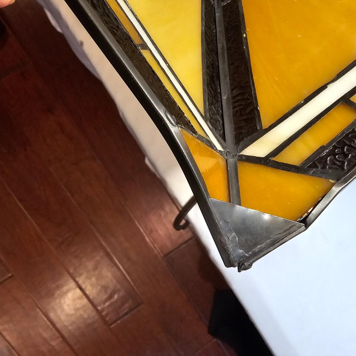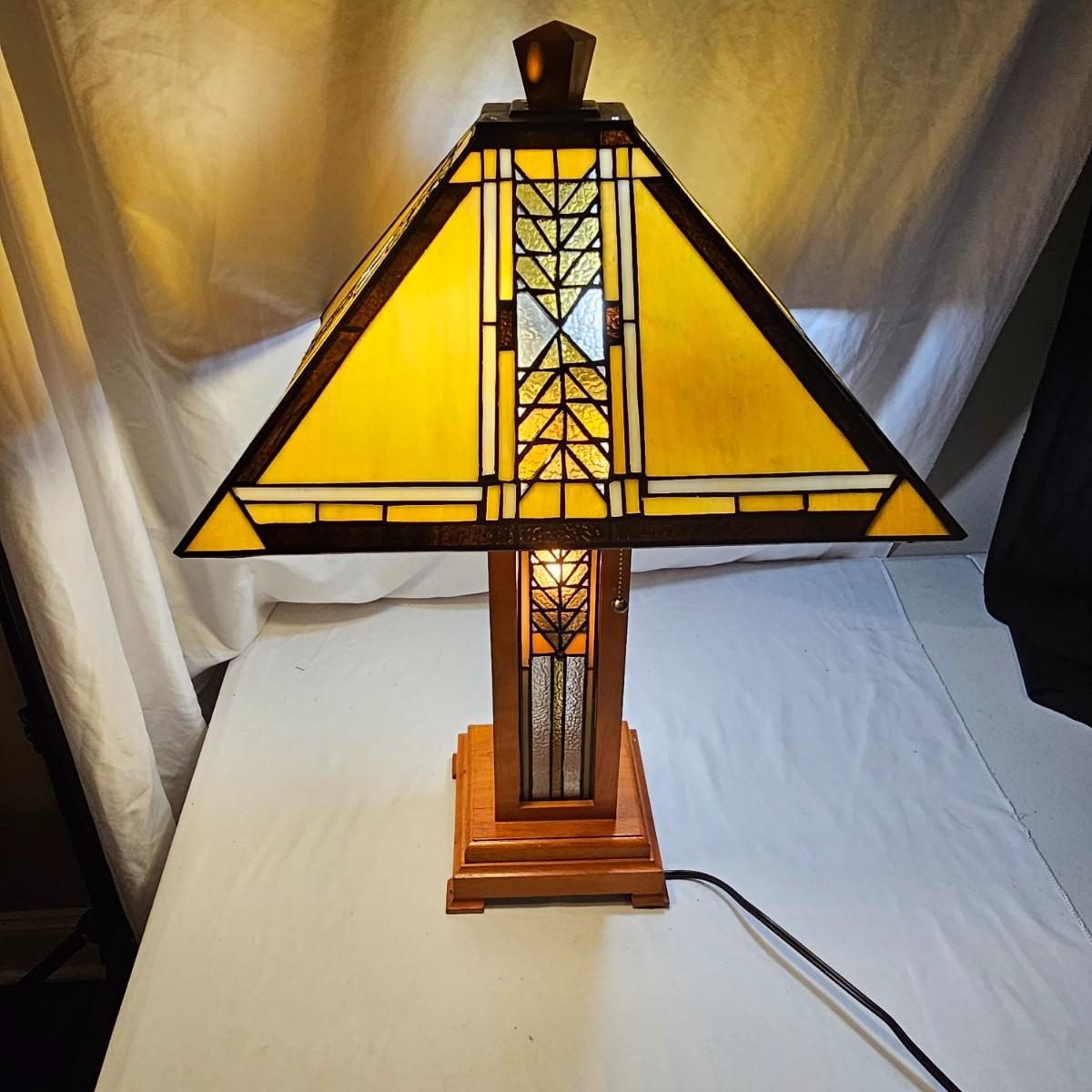 Striking table lamp with stained glass insert panels in column and a stained glass shade. Two individual bulbs under the shade and a small light source inside the column, all controlled separately. Lamp measures 16" x 16" x 25.5"H. Shade has small crack on one side and one edge is bent slightly. See photos for details. Local pickup only.