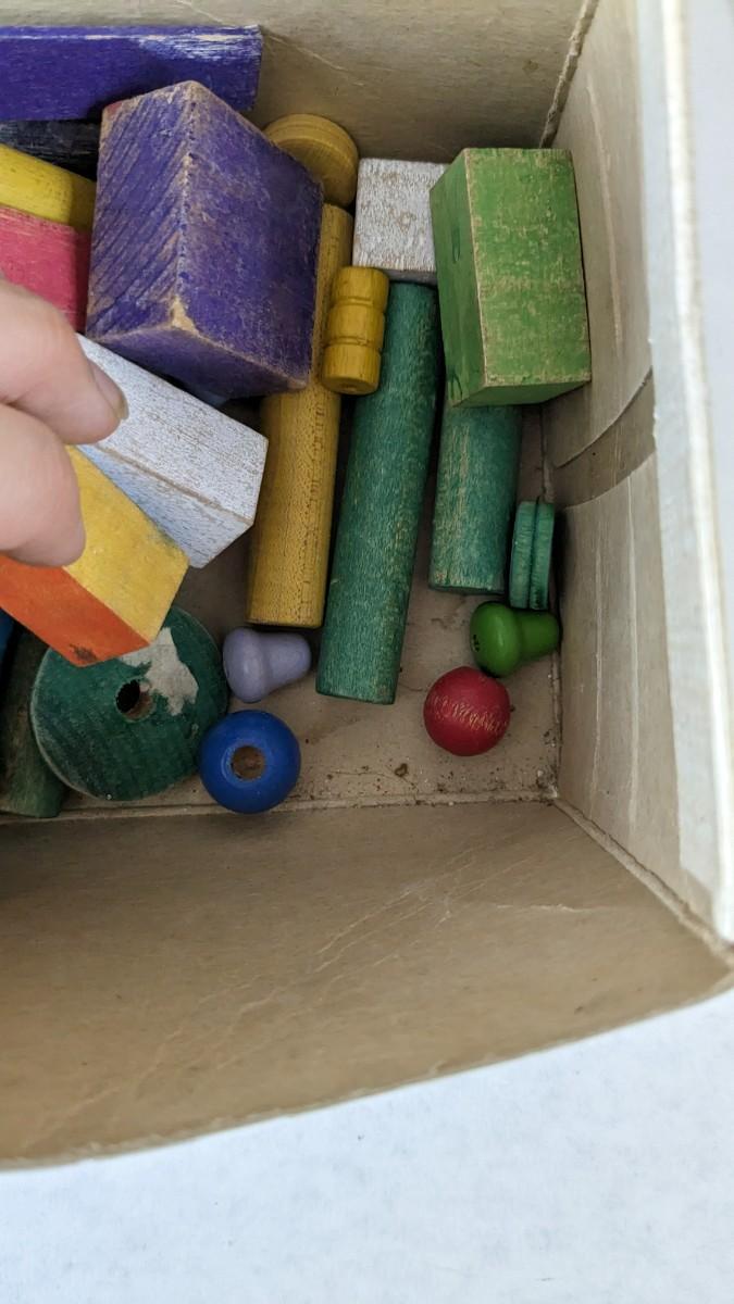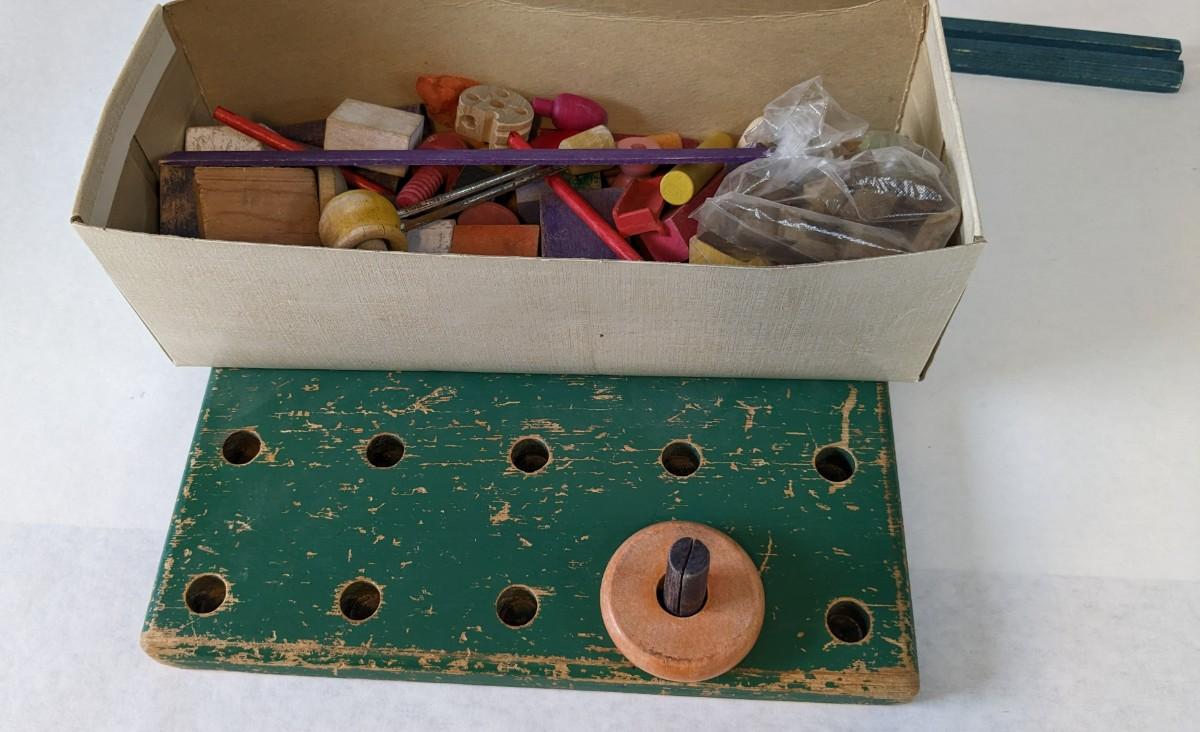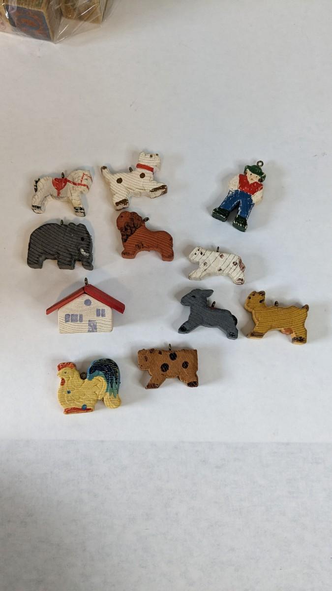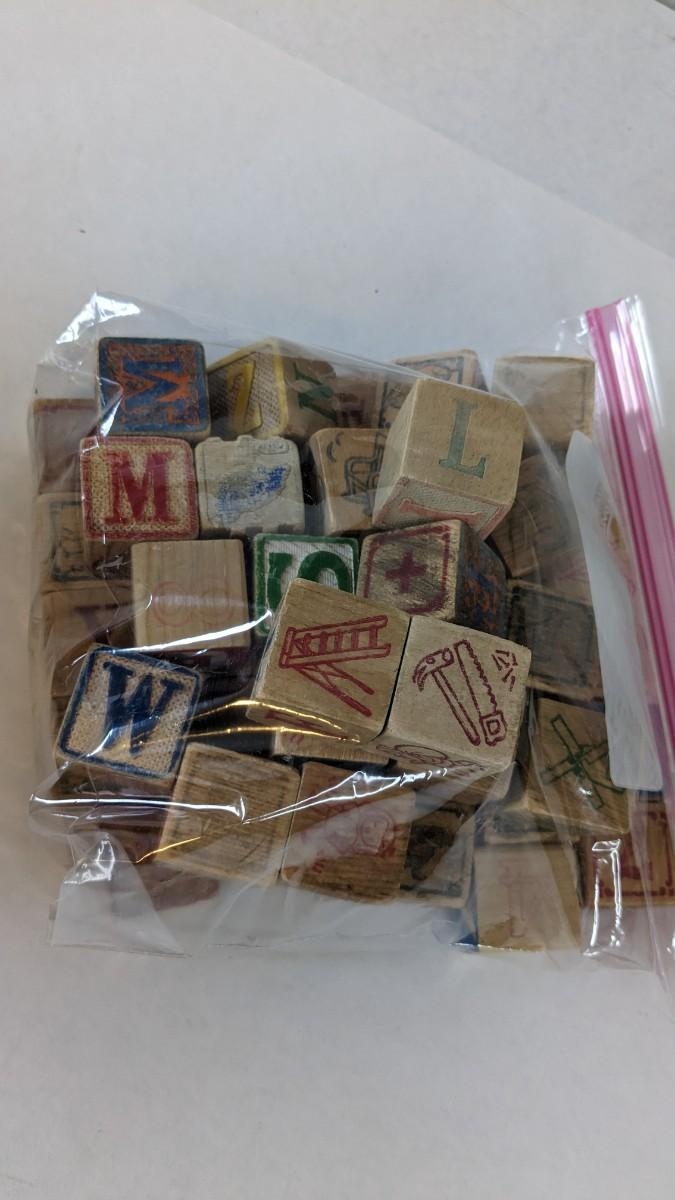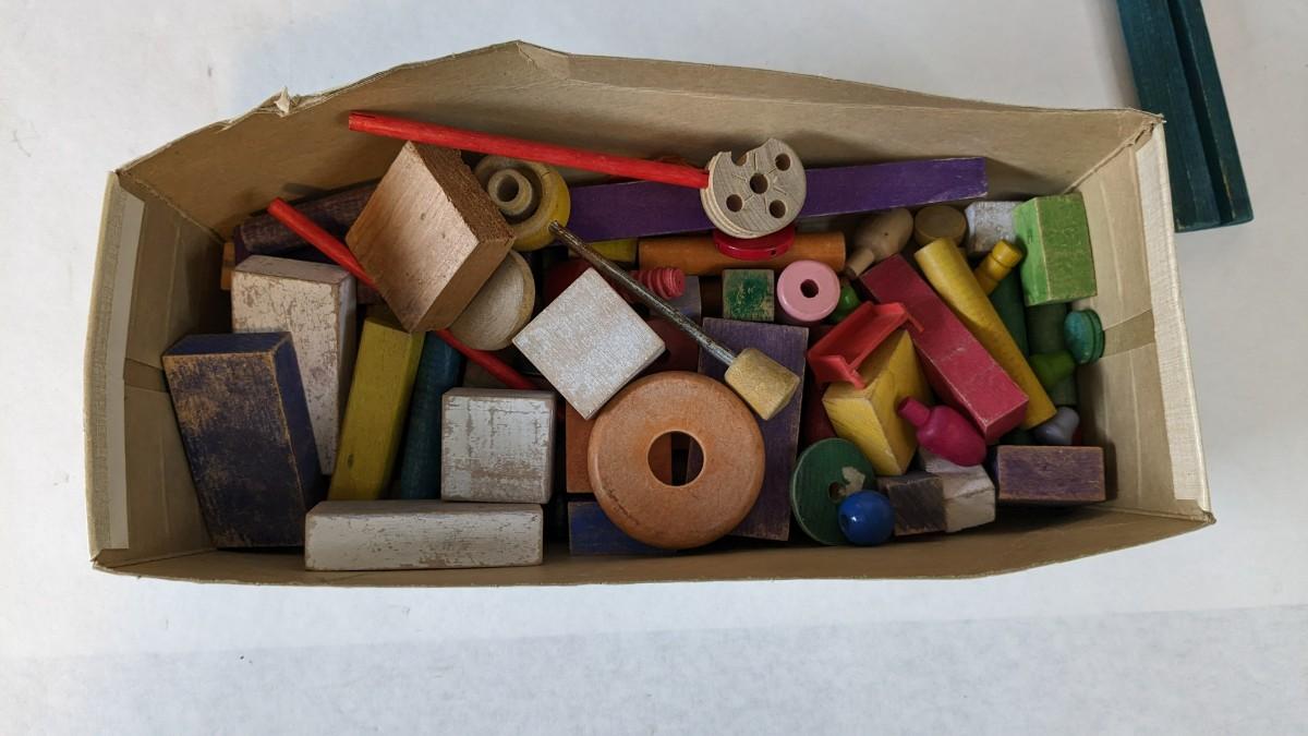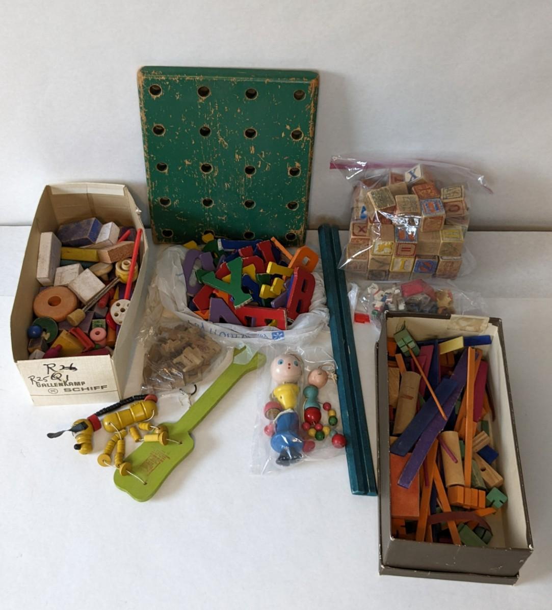 includes a fantastic Fisher Price Walt Disney Pluto toy that has a missing ear from the 1930's. A gallon bag of wood blocks, small farm toys, small shoe box full of tinkering toys, wood alphabet with tray for spelling, wood elephant puzzle, and other loose wood toys and pieces.