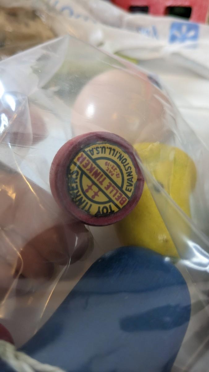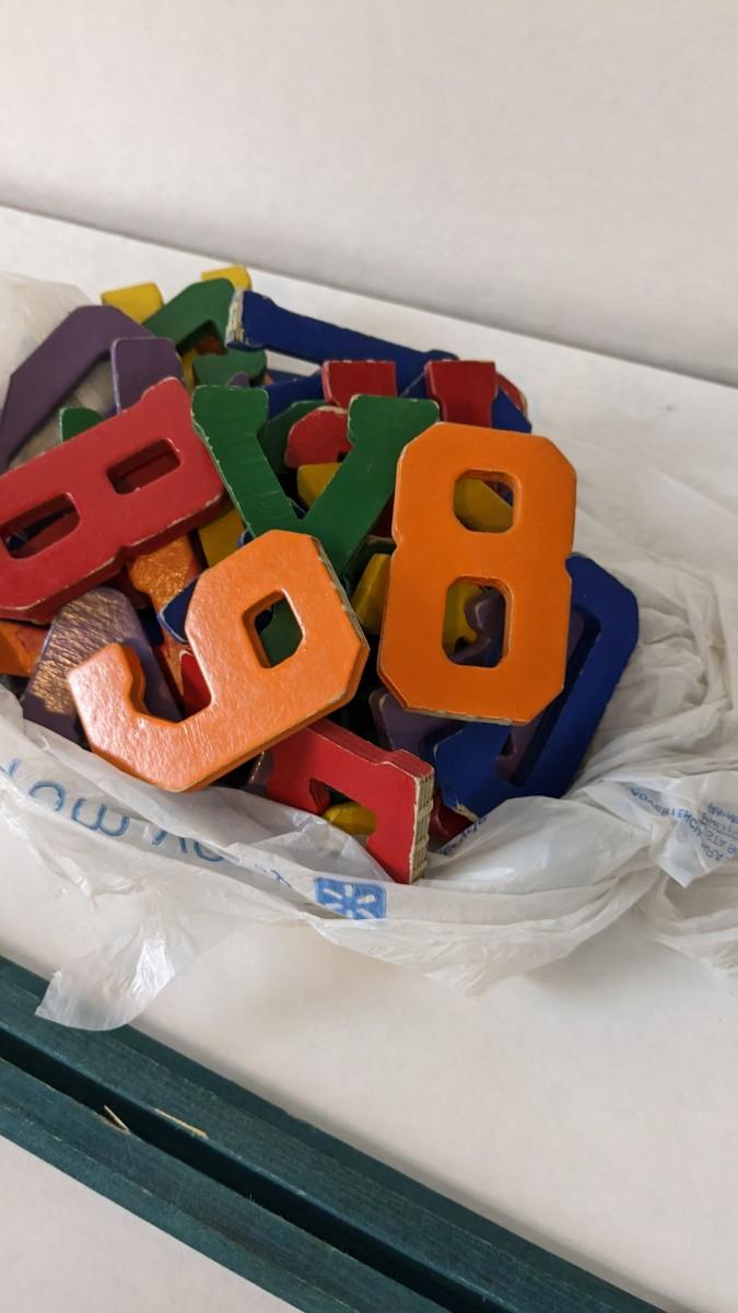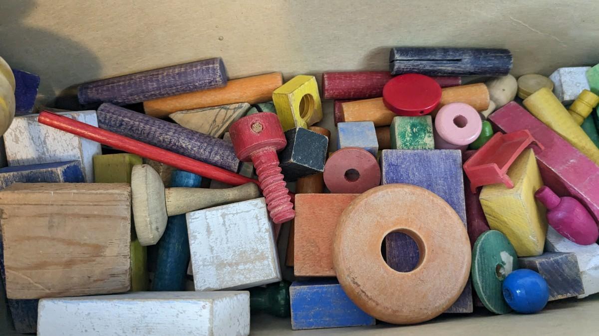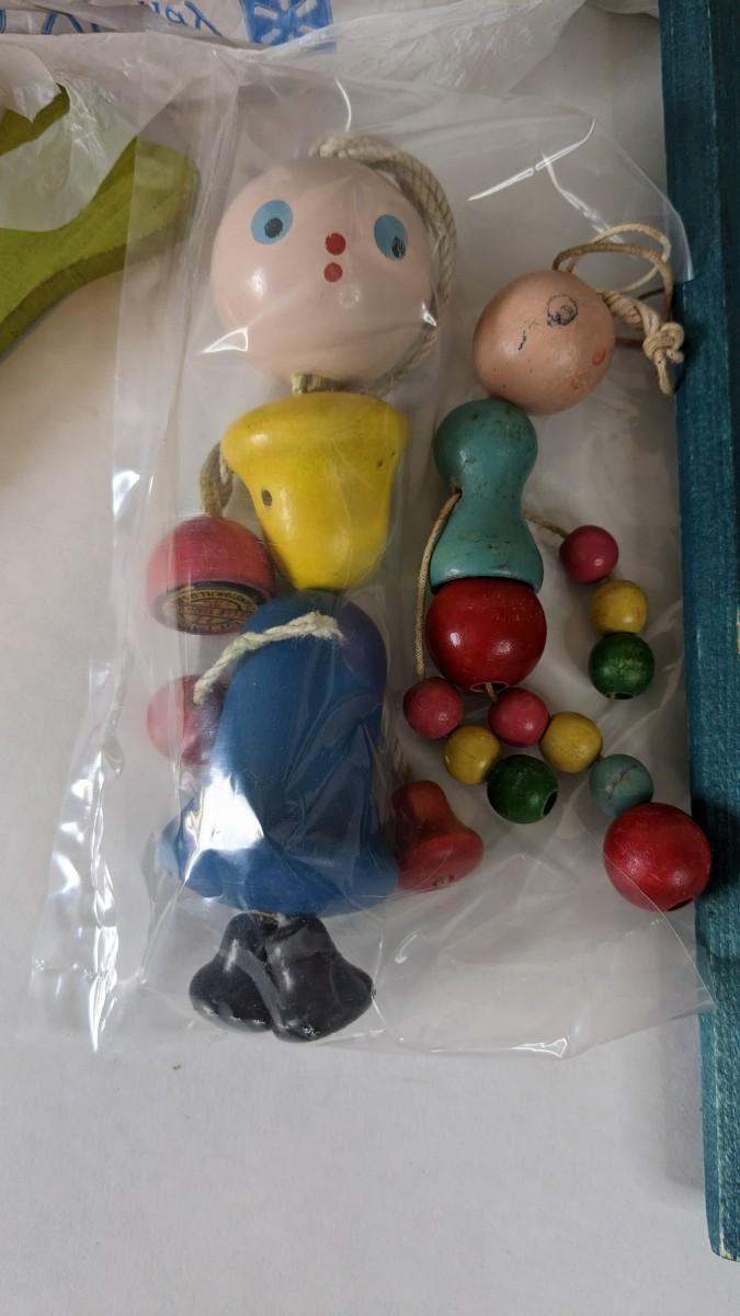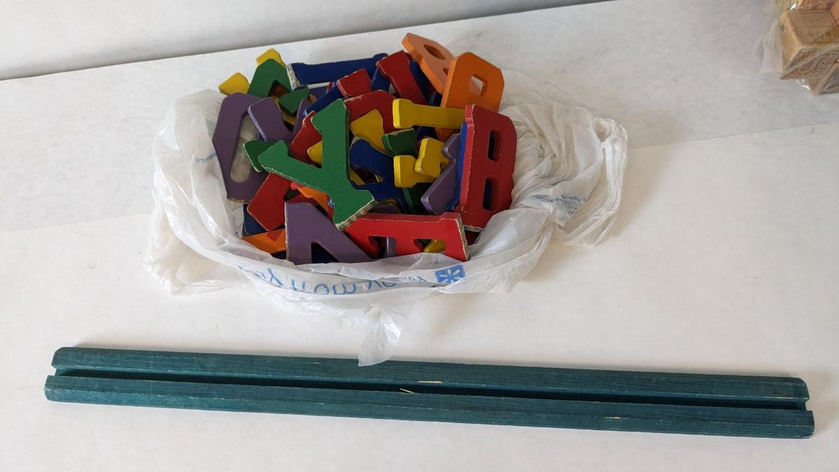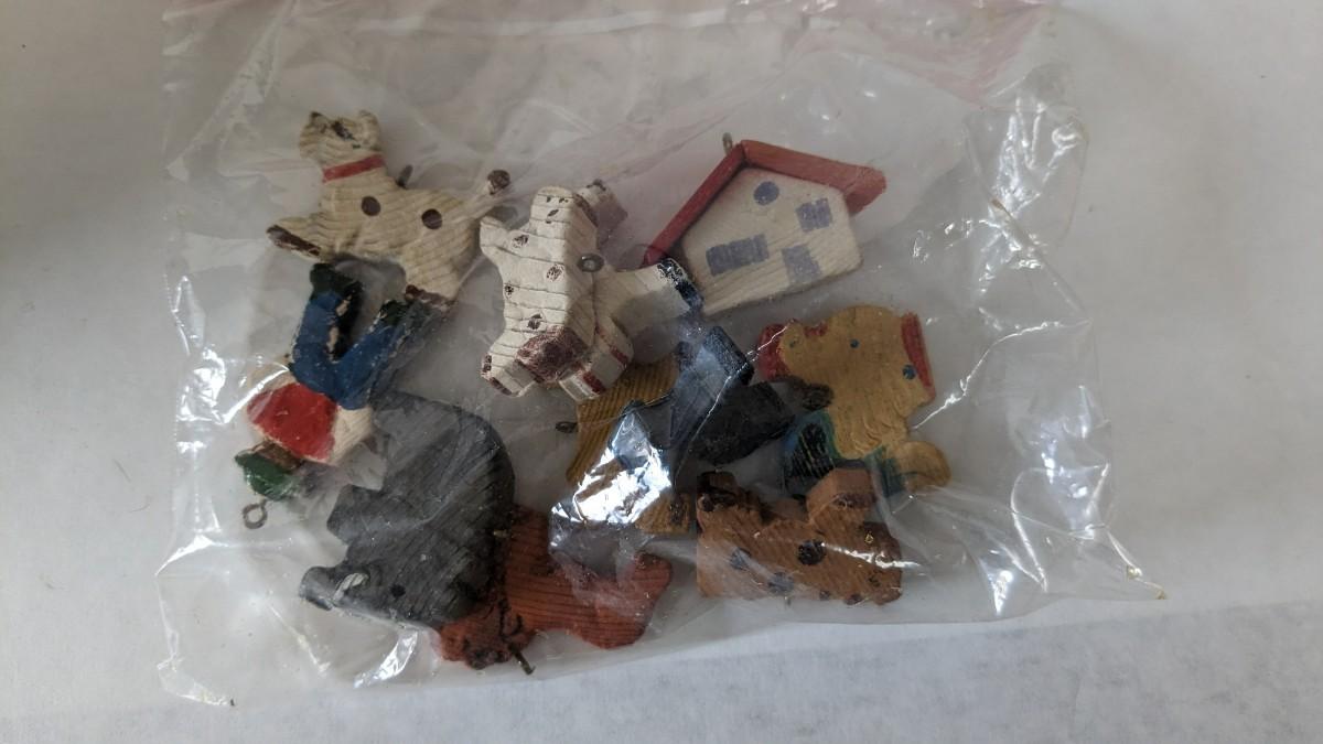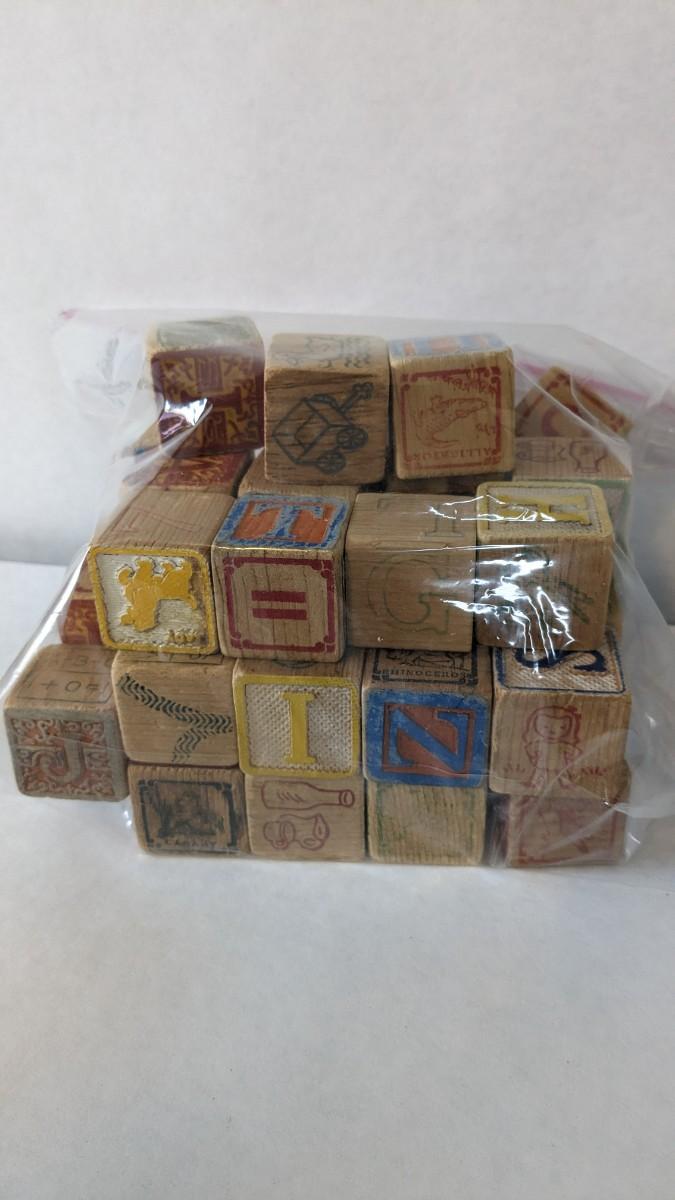includes a fantastic Fisher Price Walt Disney Pluto toy that has a missing ear from the 1930's. A gallon bag of wood blocks, small farm toys, small shoe box full of tinkering toys, wood alphabet with tray for spelling, wood elephant puzzle, and other loose wood toys and pieces.