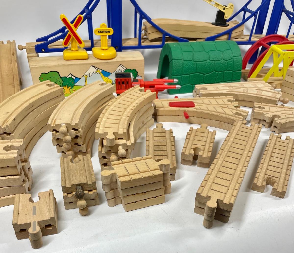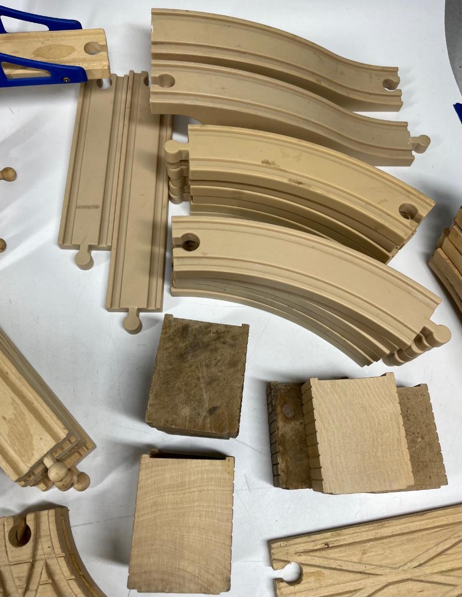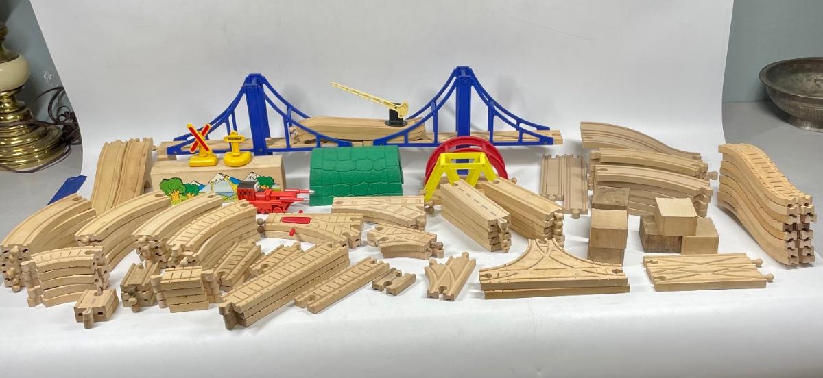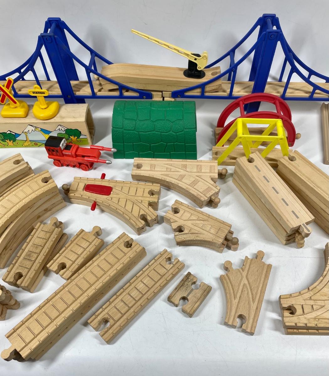 Includes everything in photo: 74 wood track parts, 21 accessories (bridges, tunnels, signs, track supports, train) and 16 plastic track parts. Playset is compatible with Kid Kraft, IKEA, B. Toys, and others. Clean, used condition.